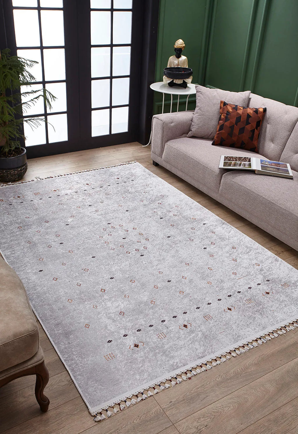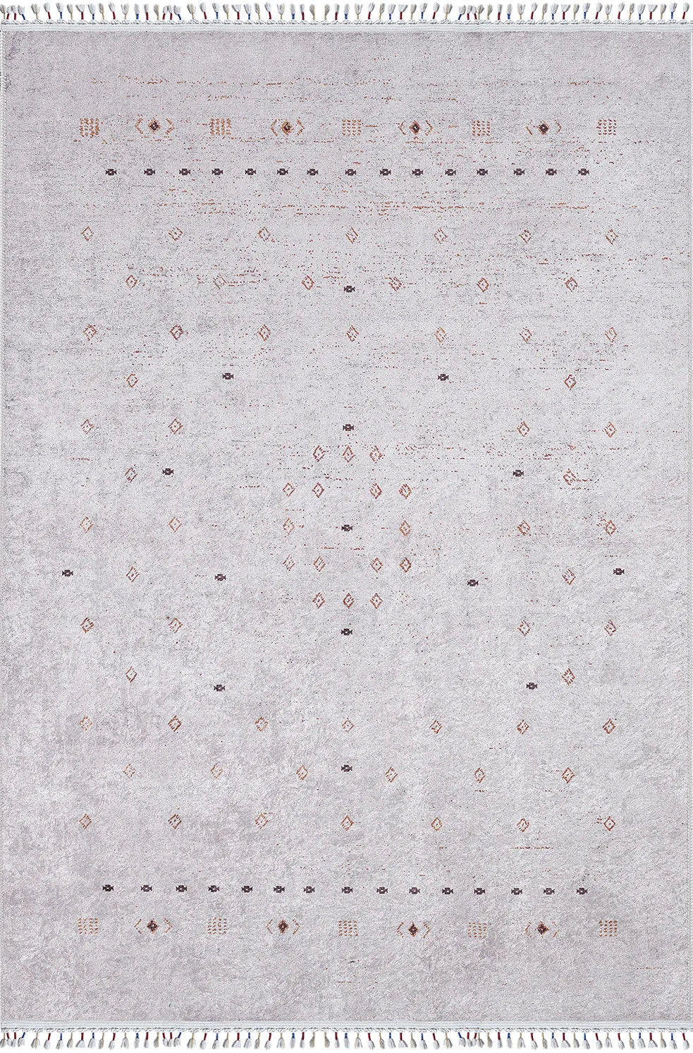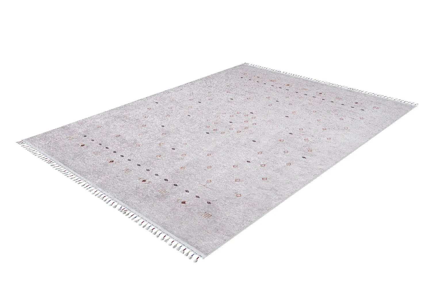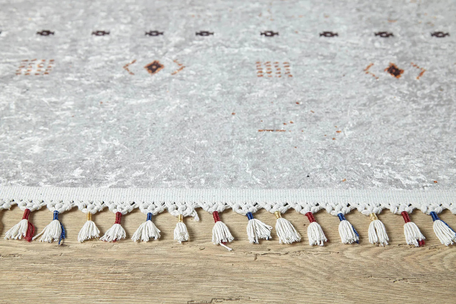 Modern ev dekorasyonuna uyum sağlayan, pratik kullanımlı ve şık halılarımızla tanışın! Bu dijital baskılı, örgülü saçaklara sahip yıkanabilir halı; çok açık gri/beyaz zemin üzerinde, kahve ve bordo tonlardaki minimal ve sade etnik (Kilim benzeri) motiflerle huzurlu ve minimalist bir görünüm sunar. Kolay temizlenebilir yapısıyla çocuklu ve evcil hayvanlı evler için idealdir. Evinizin havasını anında değiştirin!