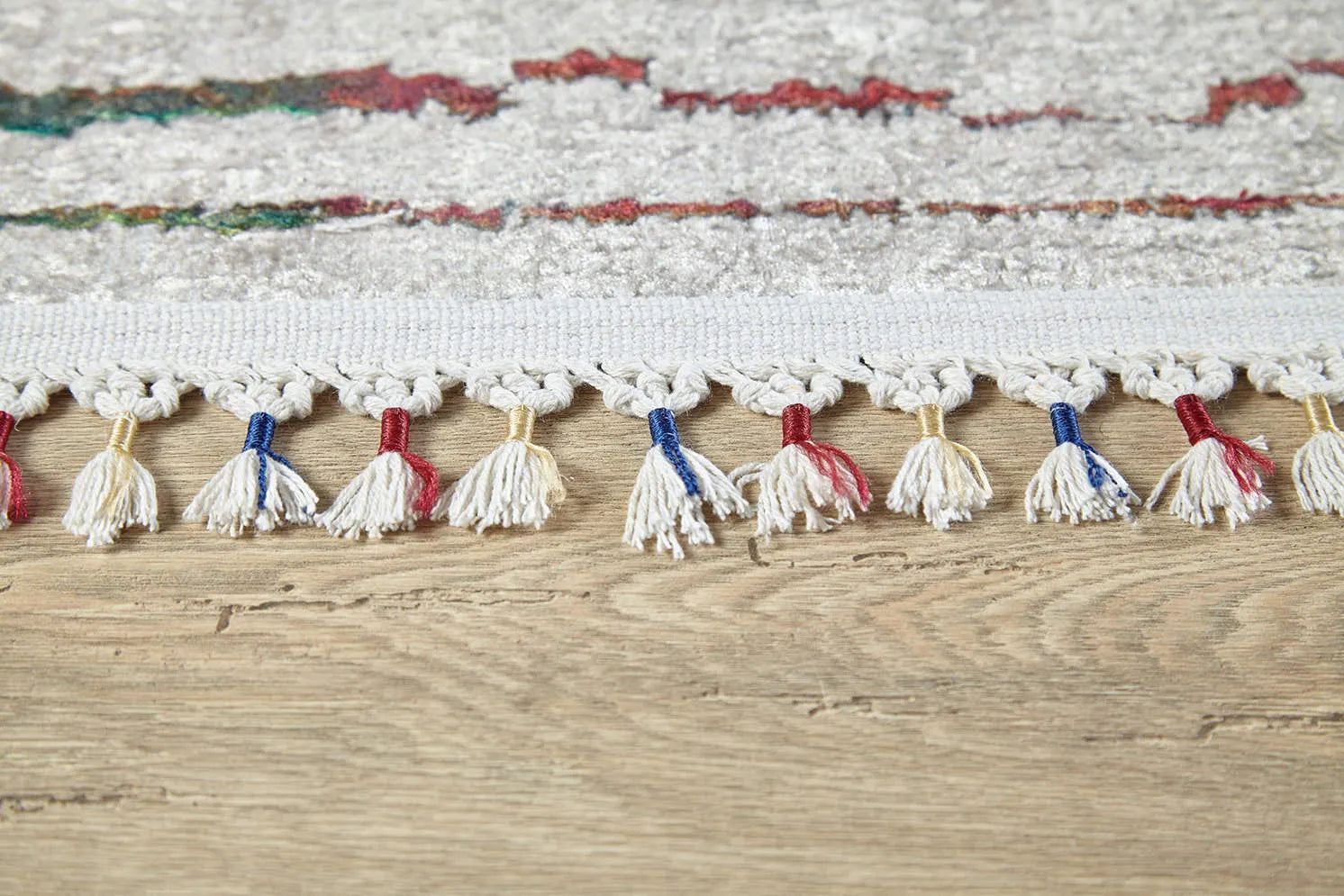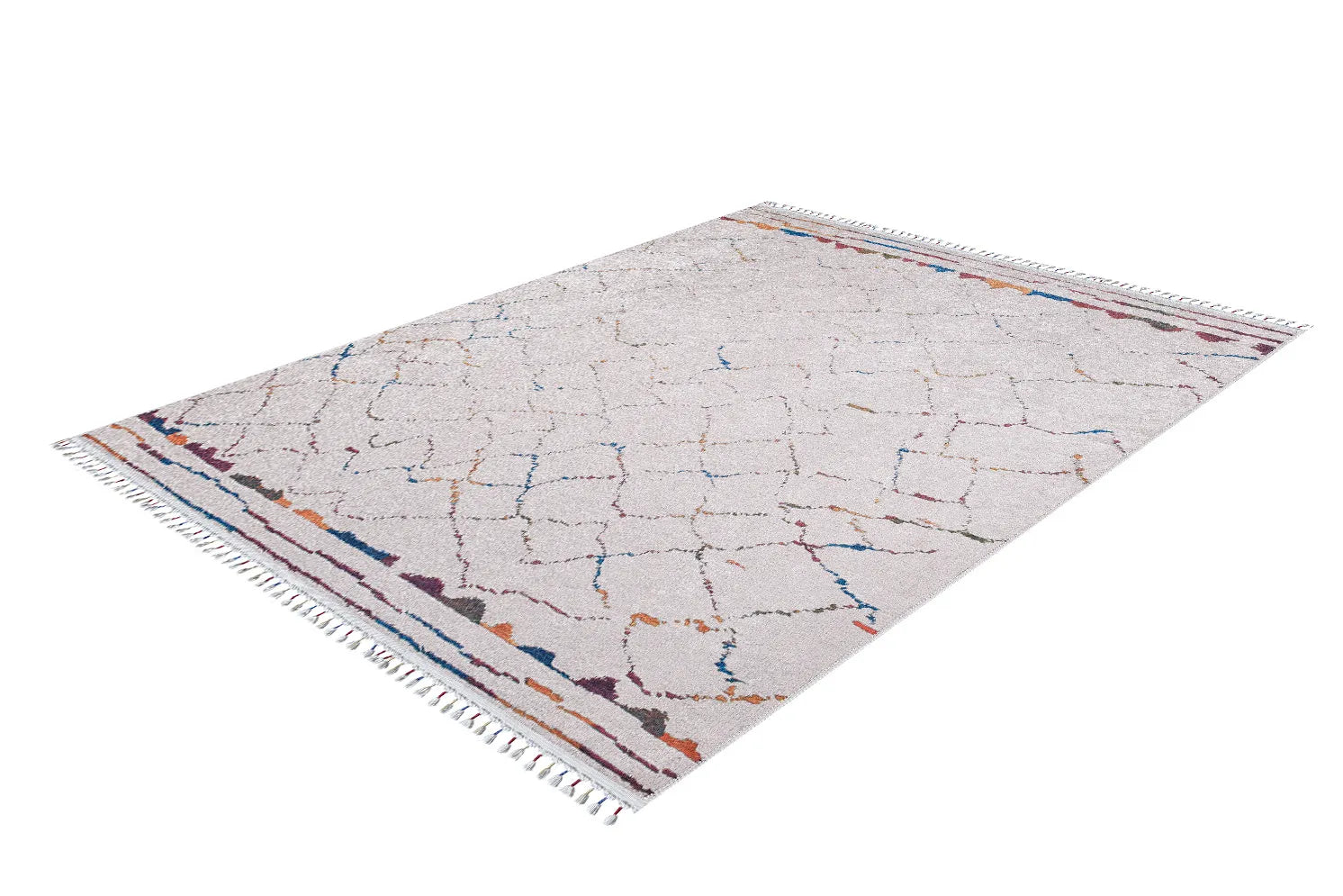 Modern ev dekorasyonuna uyum sağlayan, pratik kullanımlı ve şık halılarımızla tanışın! Bu dijital baskılı, örgülü saçaklara sahip yıkanabilir halı; açık bej/kirli beyaz zemin üzerinde, mavi, turuncu, kırmızı gibi ince renkli çizgilerle oluşturulmuş soyut baklava (eşkenar dörtgen) deseni ve kenar bordürleriyle modern ve bohem bir görünüm sunar. Kolay temizlenebilir yapısıyla çocuklu ve evcil hayvanlı evler için idealdir. Evinizin havasını anında değiştirin!