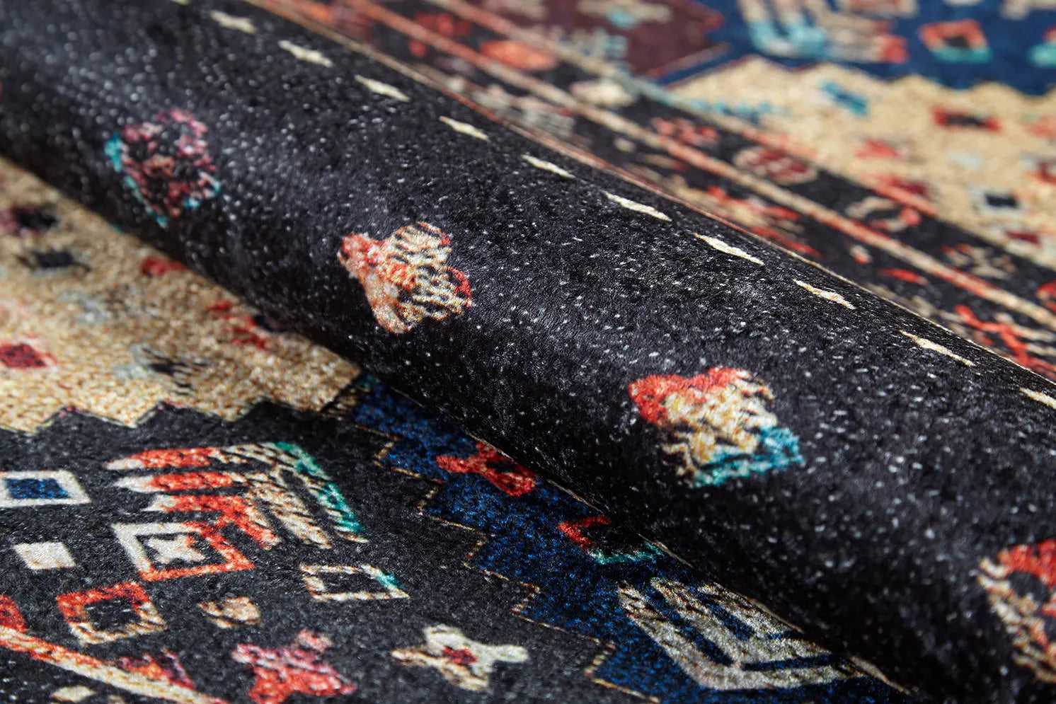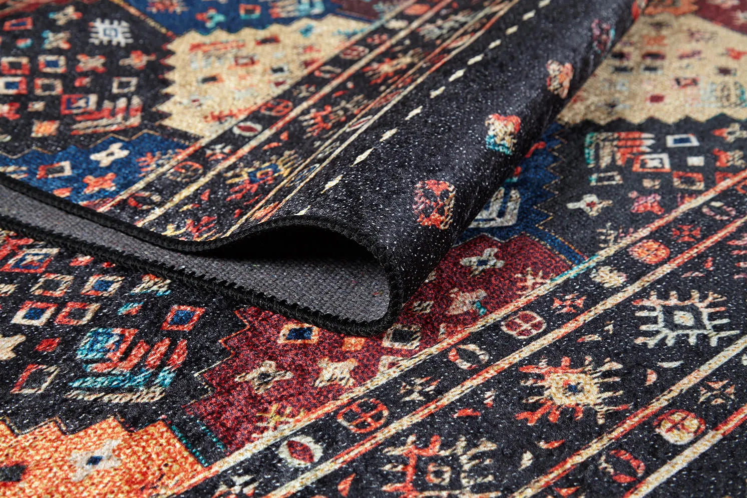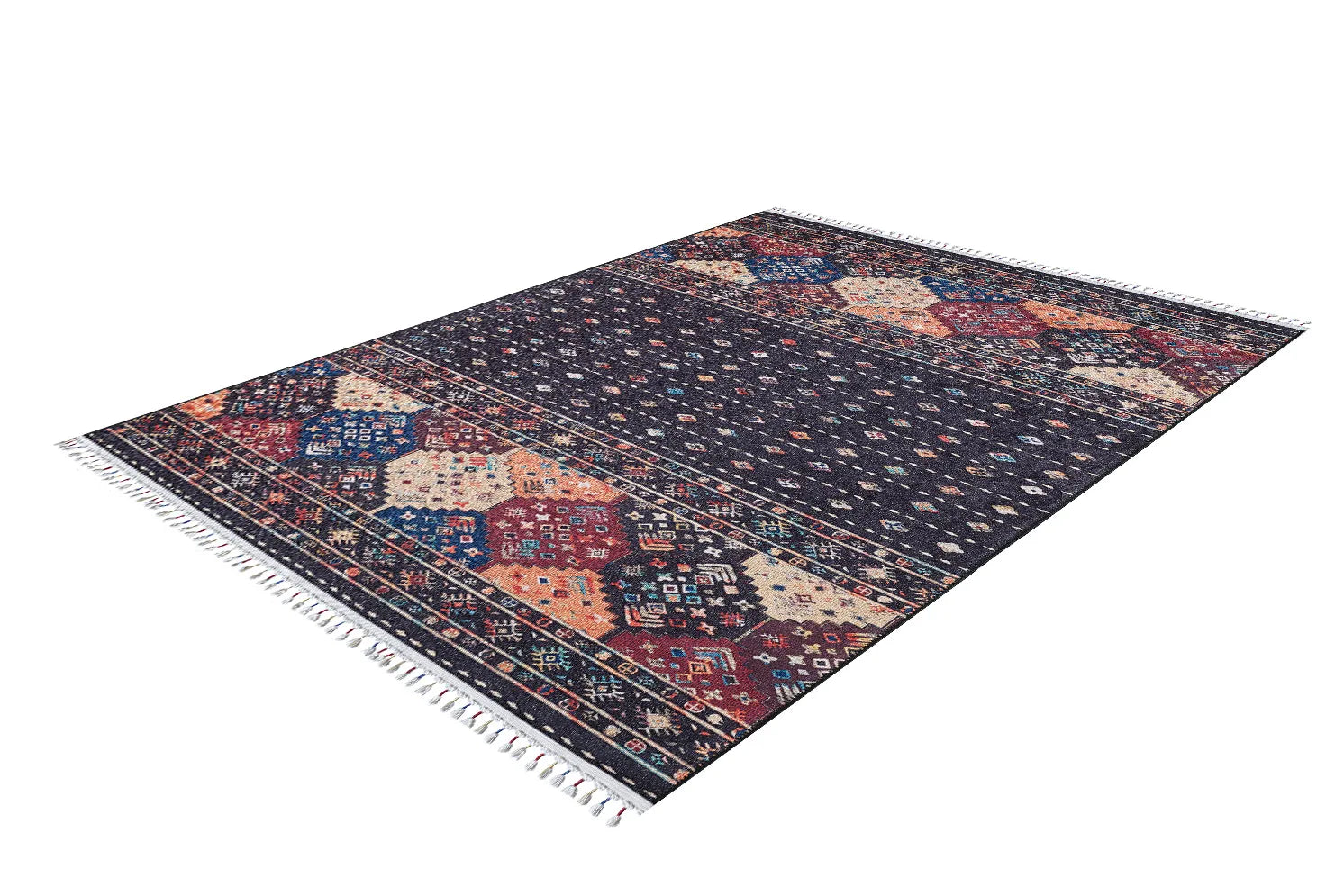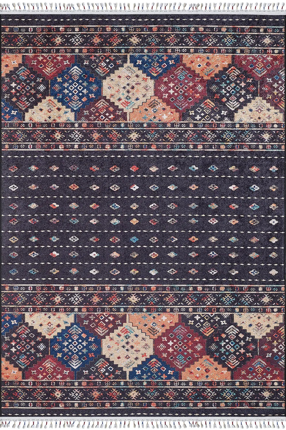 Modern ev dekorasyonuna uyum sağlayan, pratik kullanımlı ve şık halılarımızla tanışın! Bu dijital baskılı, örgülü saçaklara sahip yıkanabilir halı; koyu füme/siyah zemin üzerinde, kırmızı, mavi, turuncu ve bej gibi çok renkli, geometrik ve otantik motifli şerit desenleriyle bohem ve güçlü bir görünüm sunar. Kolay temizlenebilir yapısıyla çocuklu ve evcil hayvanlı evler için idealdir. Evinizin havasını anında değiştirin!