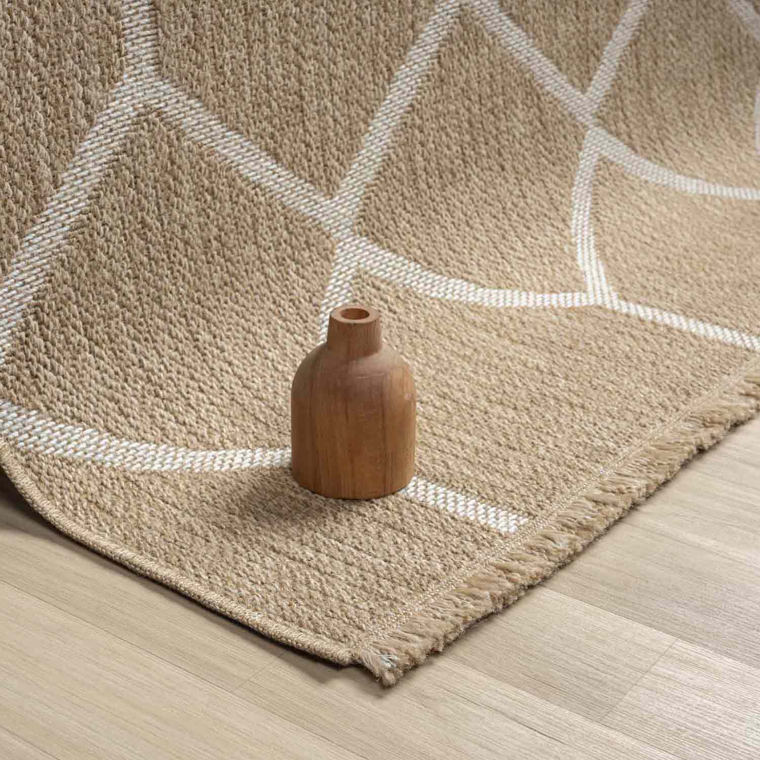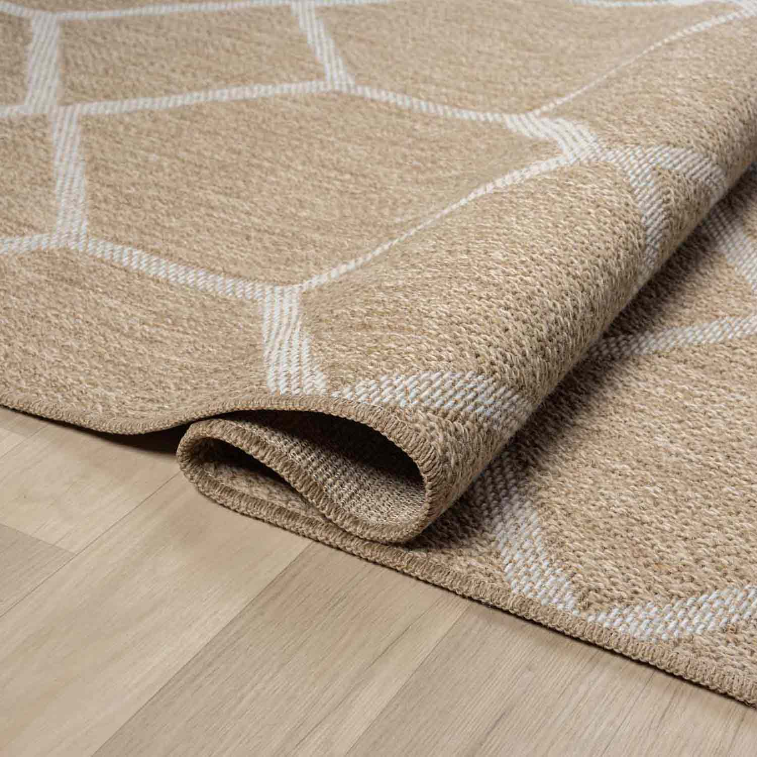 Modern ev dekorasyonuna uyum sağlayan, pratik kullanımlı ve şık halılarımızla tanışın! Bu dijital baskılı, yıkanabilir halı; bej ve kahve tonlarındaki jüt (hasır) dokulu zemin üzerinde, beyaz çizgilerle oluşturulmuş altıgen (petek) geometrik desene sahiptir. Doğallık ve modern geometrinin mükemmel dengesi. Kolay temizlenebilir yapısıyla çocuklu ve evcil hayvanlı evler için idealdir. Evinizin havasını anında değiştirin!
