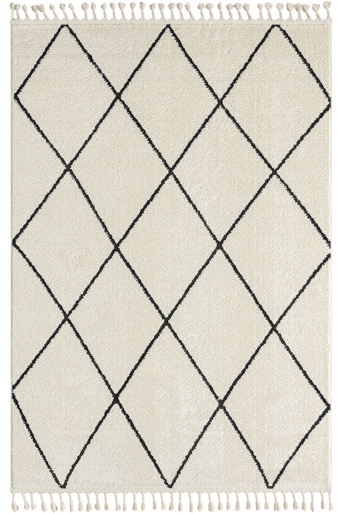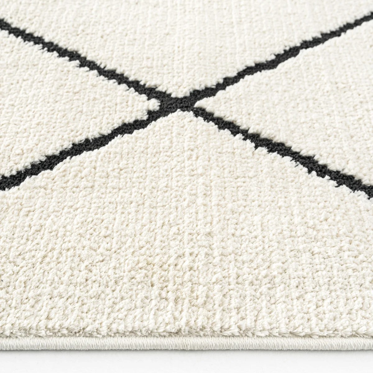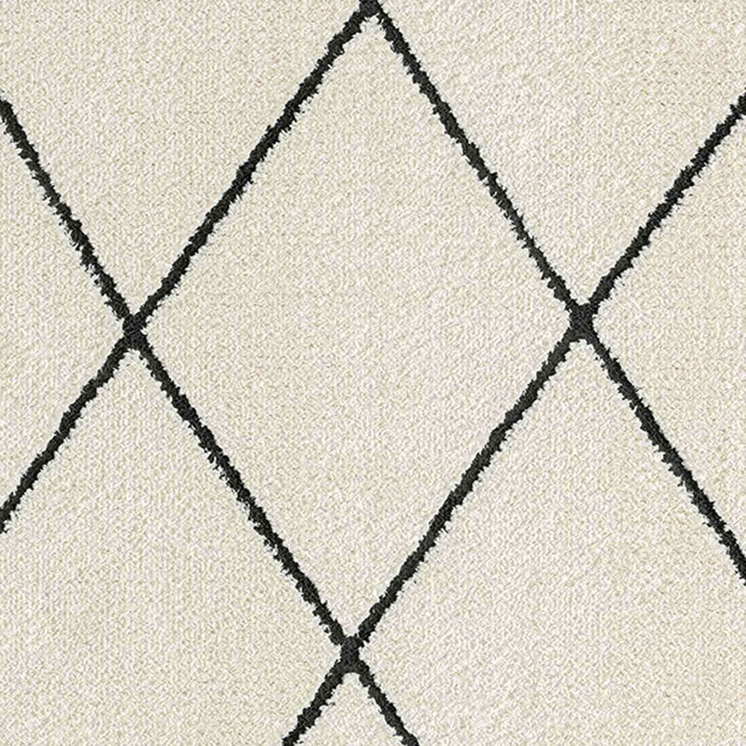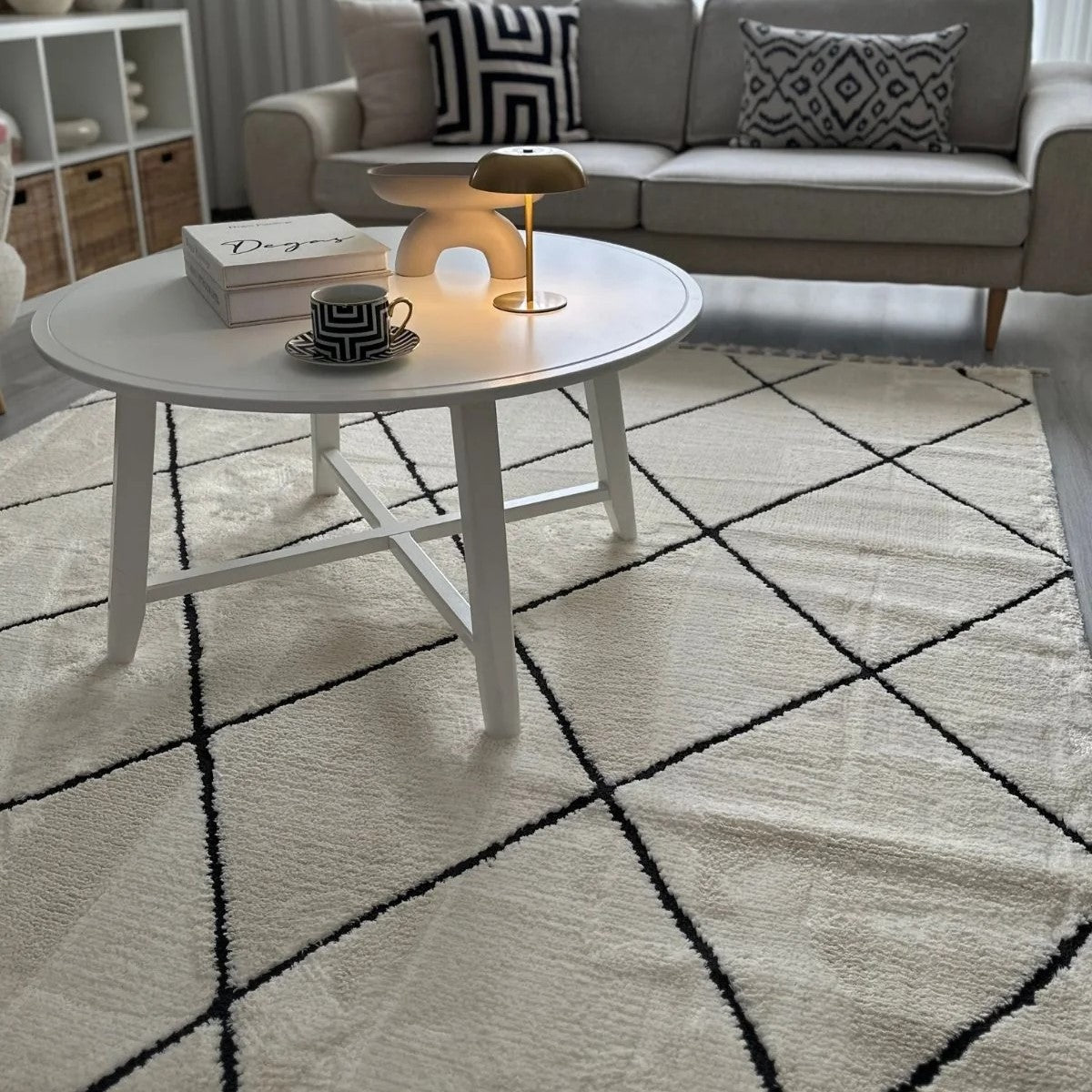 Modern ev dekorasyonuna uyum sağlayan, pratik kullanımlı ve şık halılarımızla tanışın! Bu dijital baskılı, yıkanabilir halı; krem ve beyaz zemin üzerinde, kalın siyah çizgilerle oluşturulmuş belirgin baklava (eşkenar dörtgen) geometrik desene sahiptir. Fas (Beni Ourain) tarzı ve modern minimalist estetiği bir araya getirir. Kolay temizlenebilir yapısıyla çocuklu ve evcil hayvanlı evler için idealdir. Evinizin havasını anında değiştirin!