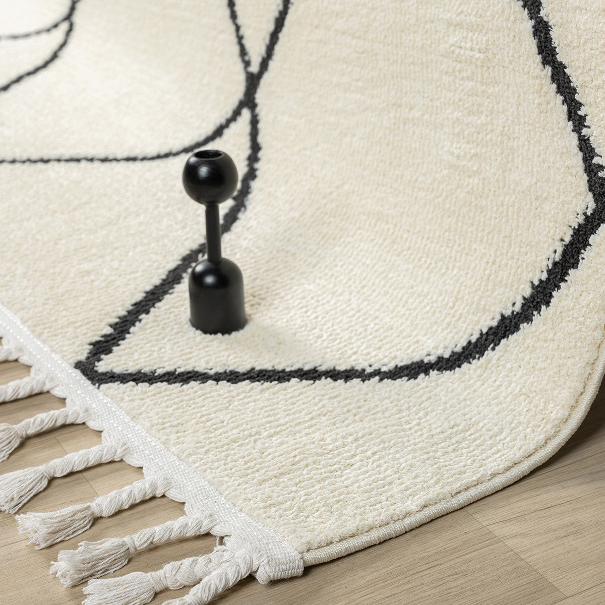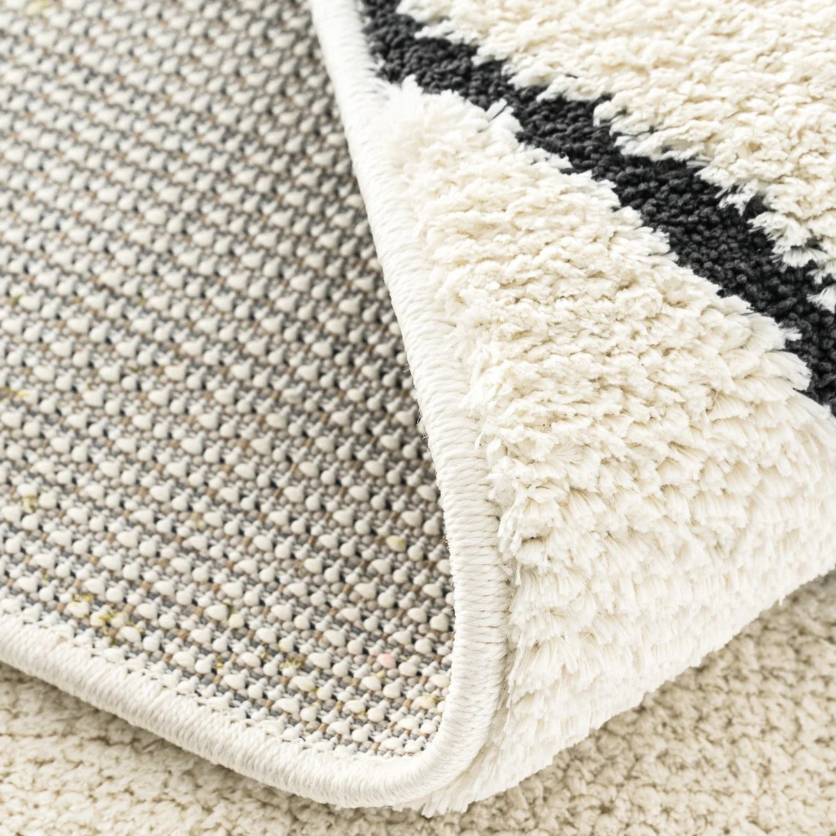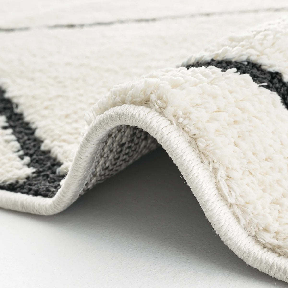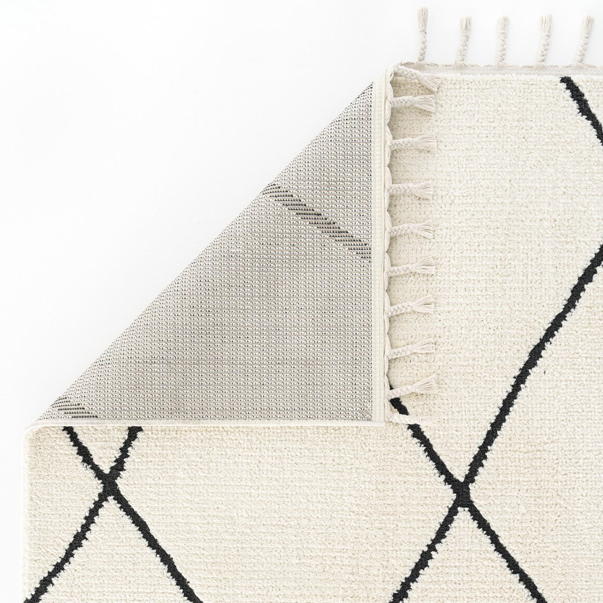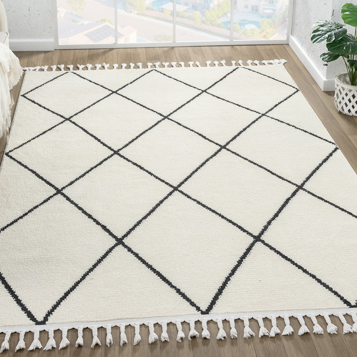 Modern ev dekorasyonuna uyum sağlayan, pratik kullanımlı ve şık halılarımızla tanışın! Bu dijital baskılı, yıkanabilir halı; krem ve beyaz zemin üzerinde, kalın siyah çizgilerle oluşturulmuş belirgin baklava (eşkenar dörtgen) geometrik desene sahiptir. Fas (Beni Ourain) tarzı ve modern minimalist estetiği bir araya getirir. Kolay temizlenebilir yapısıyla çocuklu ve evcil hayvanlı evler için idealdir. Evinizin havasını anında değiştirin!