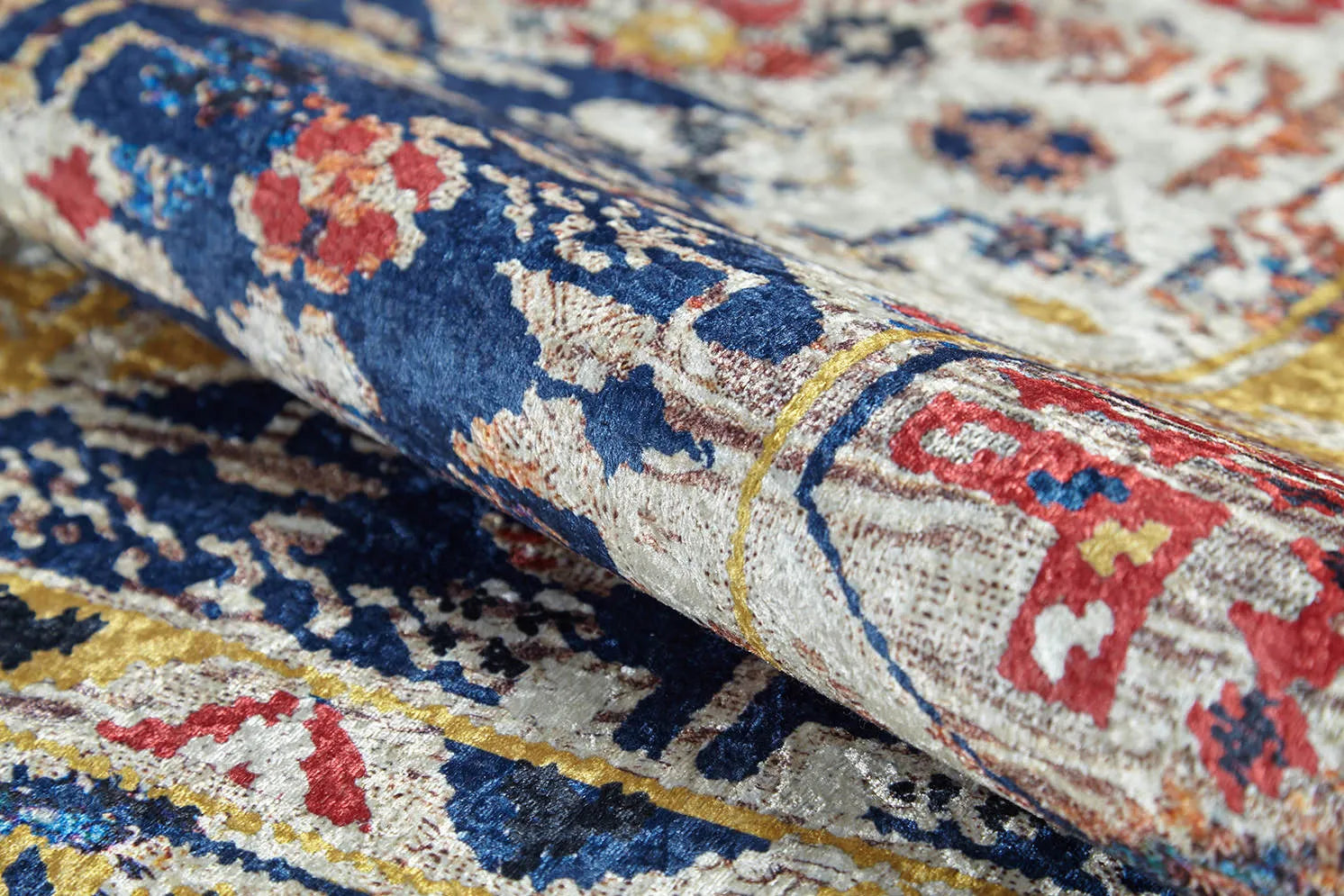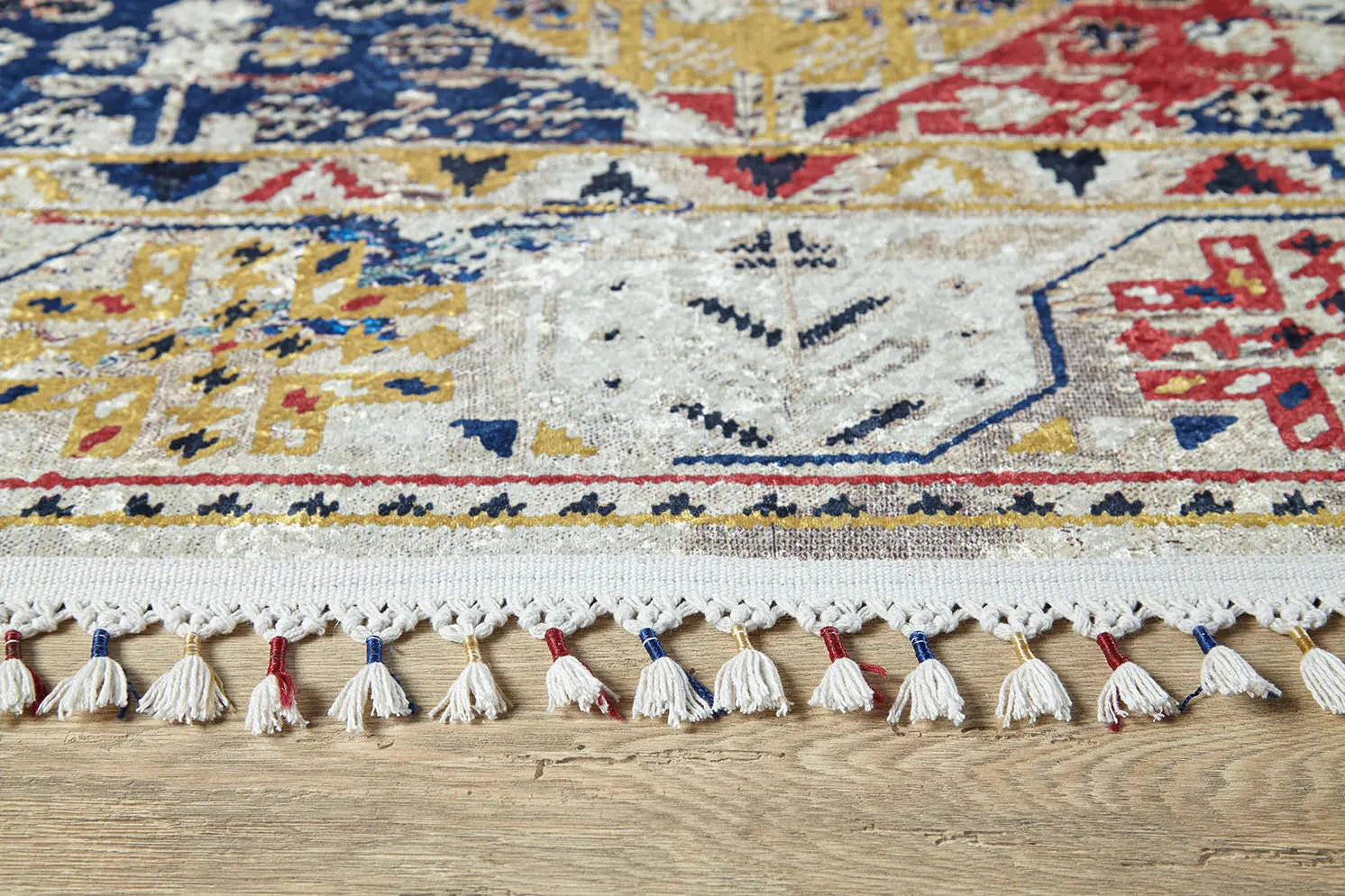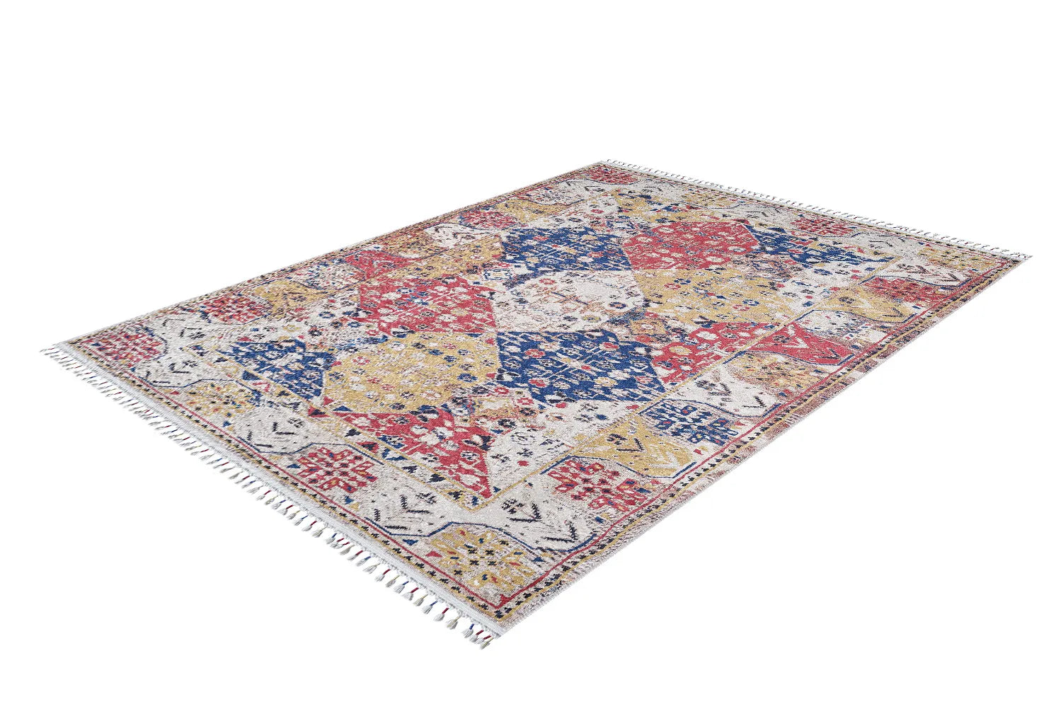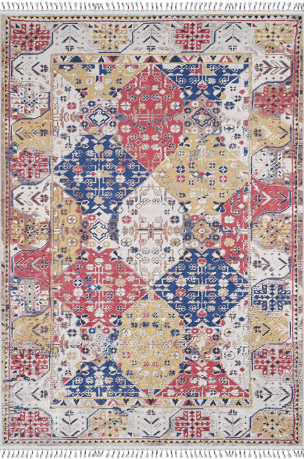 Modern ev dekorasyonuna uyum sağlayan, pratik kullanımlı ve şık halılarımızla tanışın! Bu dijital baskılı, örgülü saçaklara sahip yıkanabilir halı; kırmızı, mavi, sarı ve beyaz gibi canlı renklerdeki geleneksel motiflerin patchwork (yama işi) ve eskitme (vintage/distressed) efektiyle birleştiği dinamik bir desene sahiptir. Kolay temizlenebilir yapısıyla çocuklu ve evcil hayvanlı evler için idealdir. Evinizin havasını anında değiştirin!