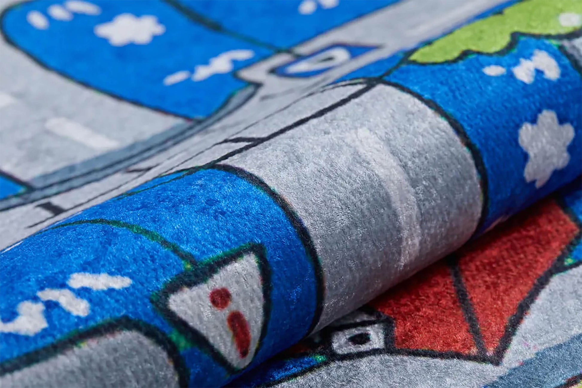 Çocukların hayal gücünü geliştiren ve kendi hikayelerini yaratmalarını sağlayan eğlenceli bir oyun halısı! Üzerindeki yol haritası (pist) deseni sayesinde çocuklar minik arabalarıyla oynayabilir, şehir hayatını ve trafik kurallarını eğlenerek öğrenebilir. Mavi su ve yeşil çimen detaylarıyla zenginleştirilmiş şehir/kasaba temalı desen, çocuk odalarına neşe katar.  Erkek ve kız çocuk odaları ile kreşler ve oyun alanları için mükemmeldir.