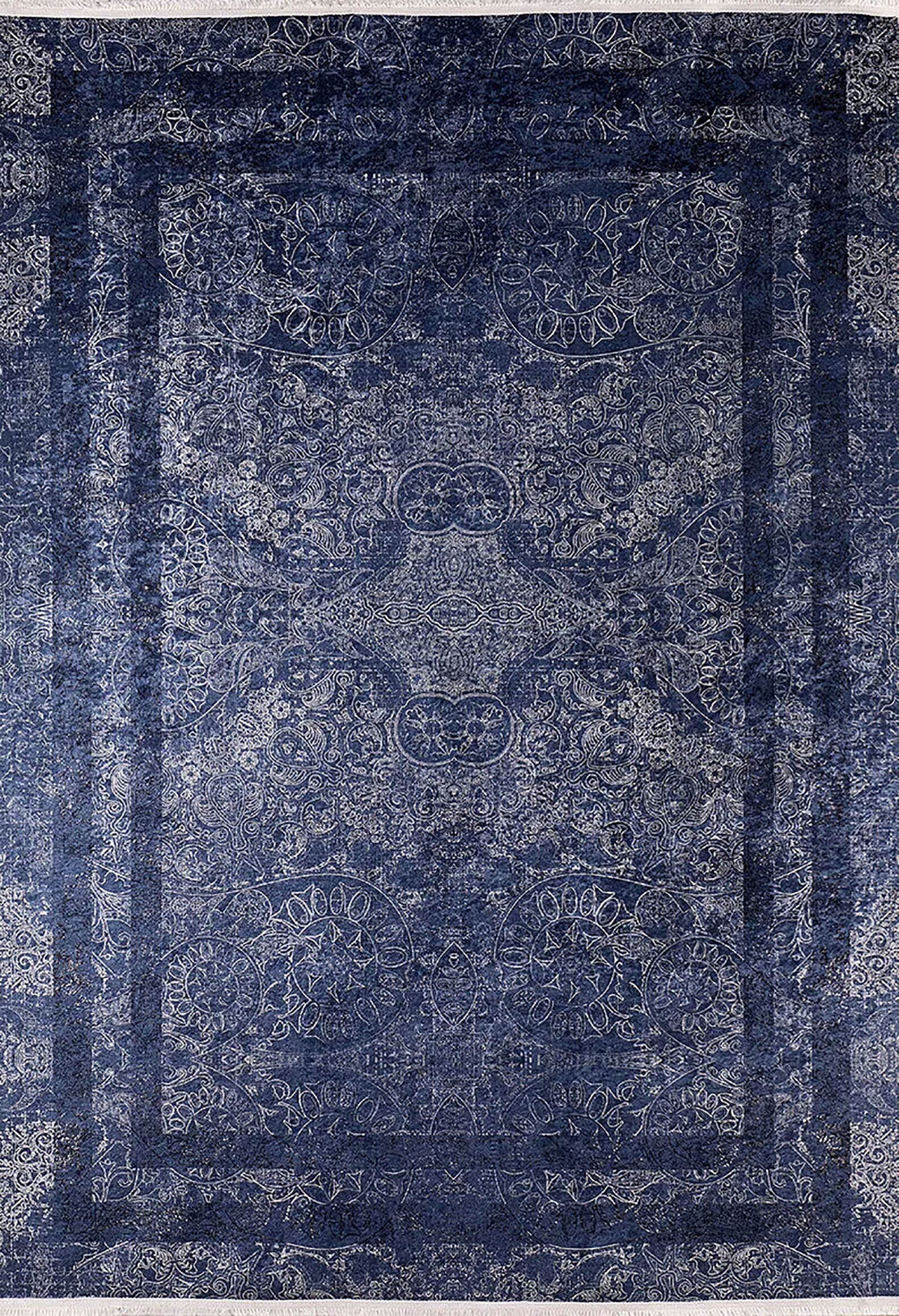 Koyu tonların zarafetini sevenler için tasarlanmış, modern ve lüks bir halı. Halının derin lacivert ve çivit mavisi zemininde, hafif eskitme (vintage) efektiyle belirginleşen, sofistike bir klasik Damask deseni yer alır. Dış kenarlardaki ton-sür-ton (aynı rengin farklı tonları) geçişli koyu bordür, deseni zarifçe çerçevelerken halıya derinlik ve bütünlük katar. Şık ve zamansız bir atmosfer yaratmak için idealdir.