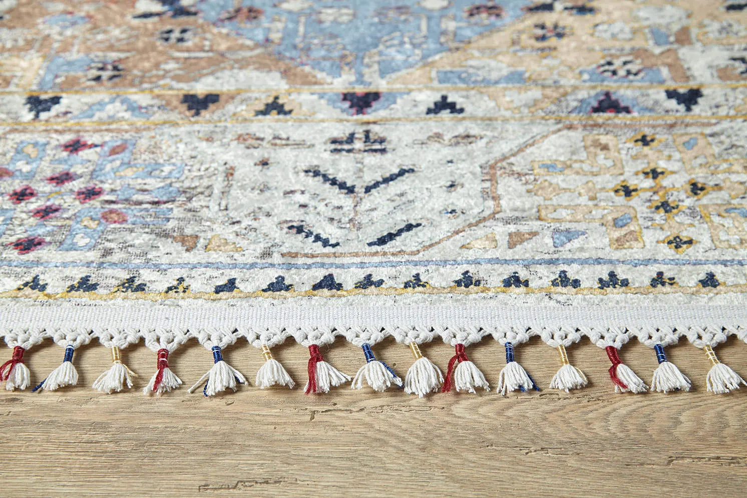 Modern ev dekorasyonuna uyum sağlayan, pratik kullanımlı ve şık halılarımızla tanışın! Bu dijital baskılı, örgülü saçaklara sahip yıkanabilir halı; bej, kahve, pastel mavi ve lila tonlardaki geleneksel motiflerin patchwork (yama işi) ve eskitme (vintage/distressed) efektiyle birleştiği zarif bir desene sahiptir. Kolay temizlenebilir yapısıyla çocuklu ve evcil hayvanlı evler için idealdir. Evinizin havasını anında değiştirin!