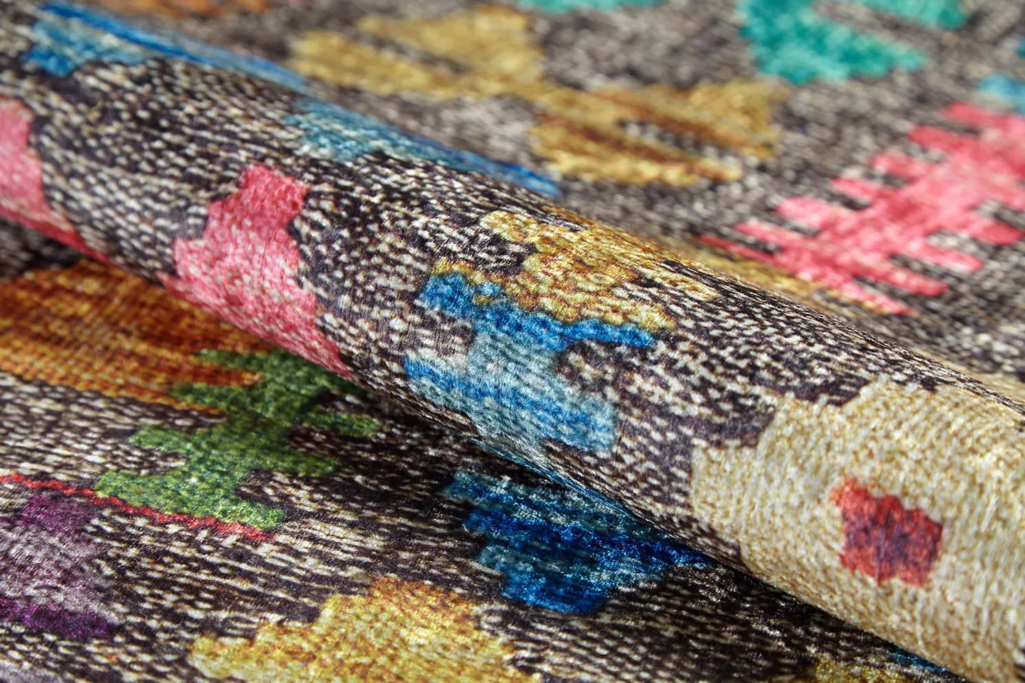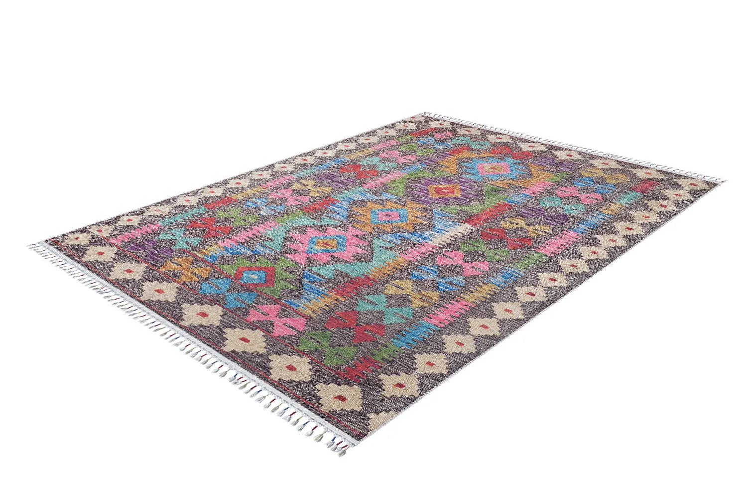 Modern ev dekorasyonuna uyum sağlayan, pratik kullanımlı ve şık halılarımızla tanışın! Bu dijital baskılı, örgülü saçaklara sahip yıkanabilir halı; koyu gri/kahve zemin üzerinde, pembe, yeşil, mavi, sarı gibi çok canlı ve kontrast renklerdeki otantik kilim motifleriyle bohem ve enerjik bir görünüm sunar. Kolay temizlenebilir yapısıyla çocuklu ve evcil hayvanlı evler için idealdir. Evinizin havasını anında değiştirin!