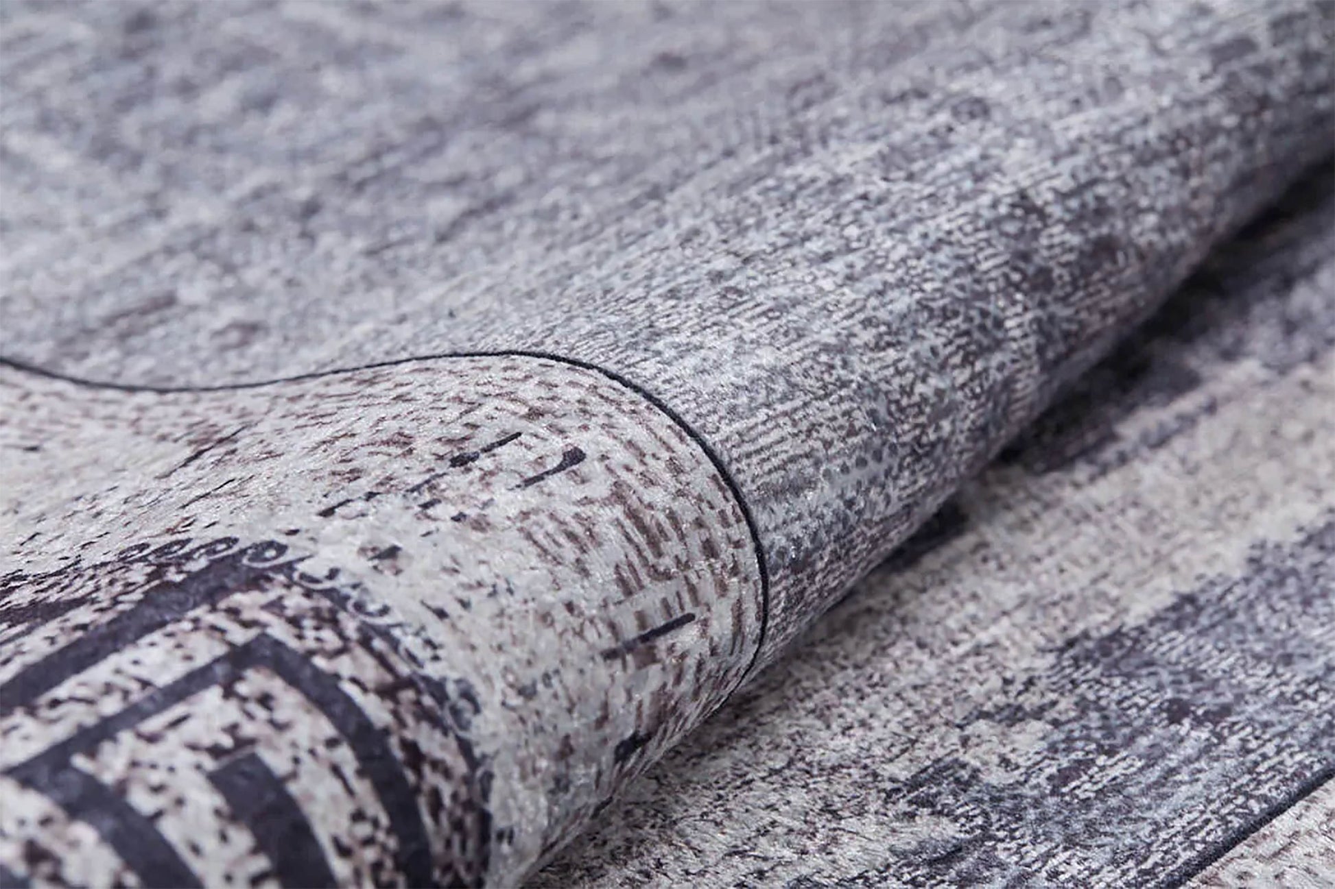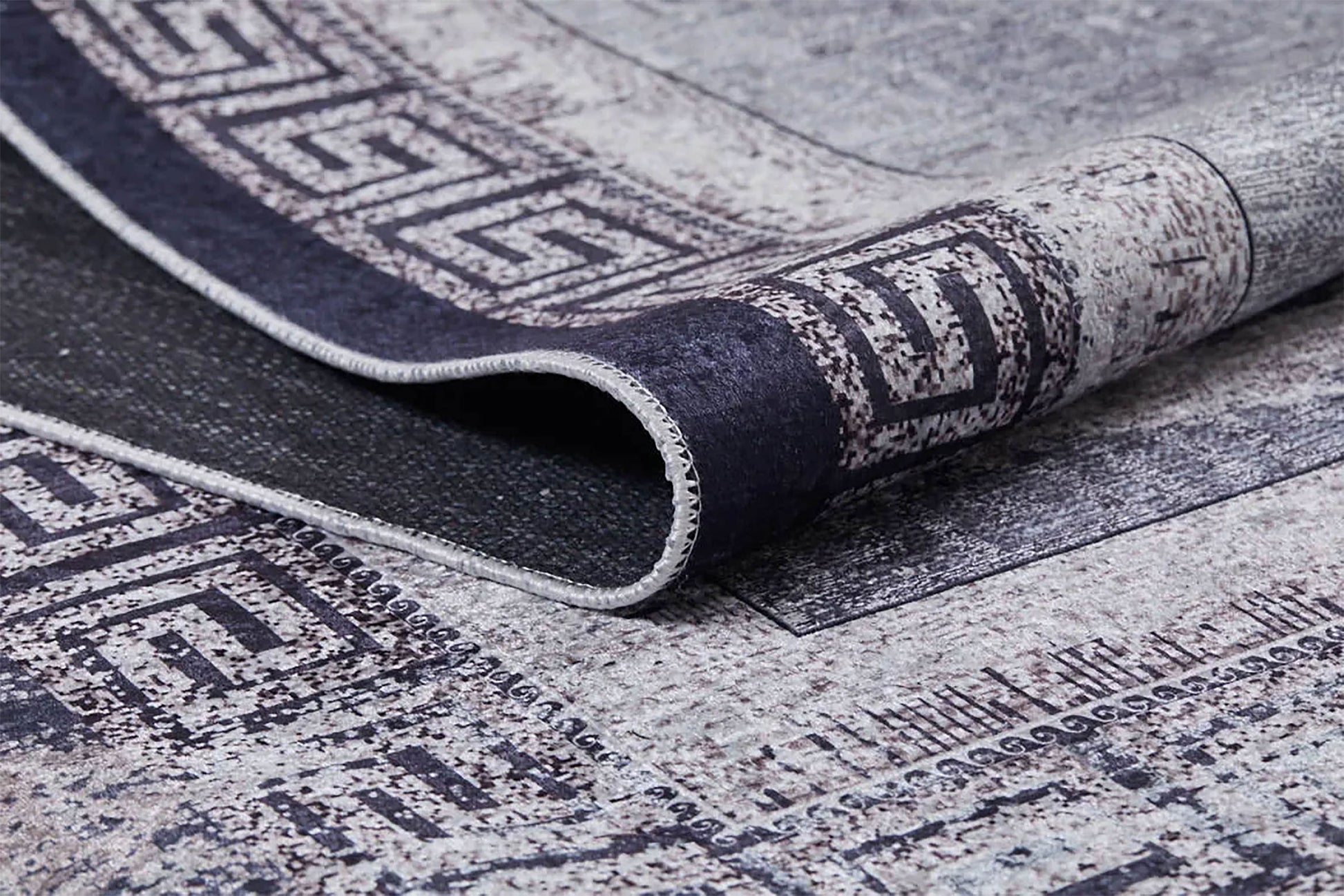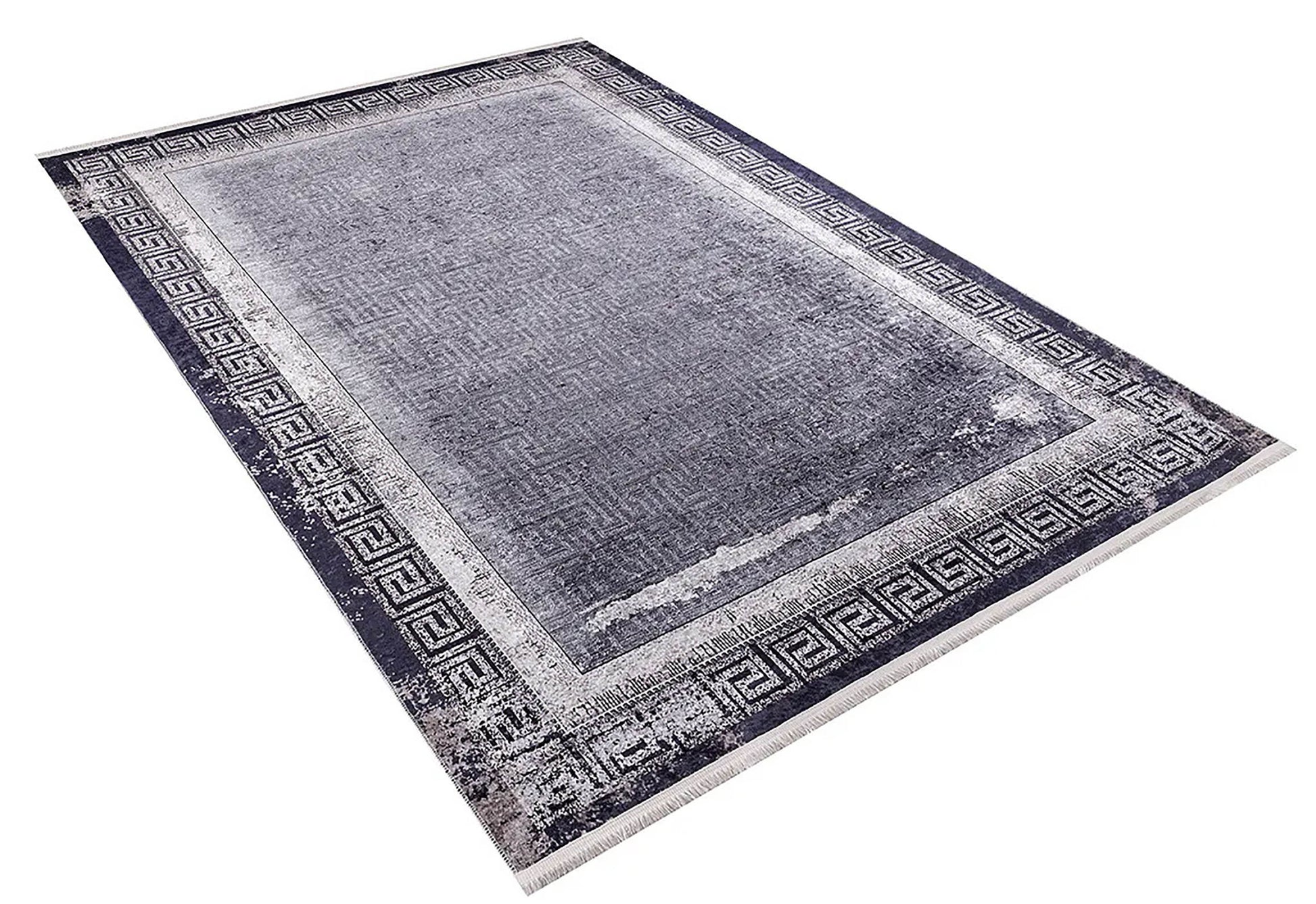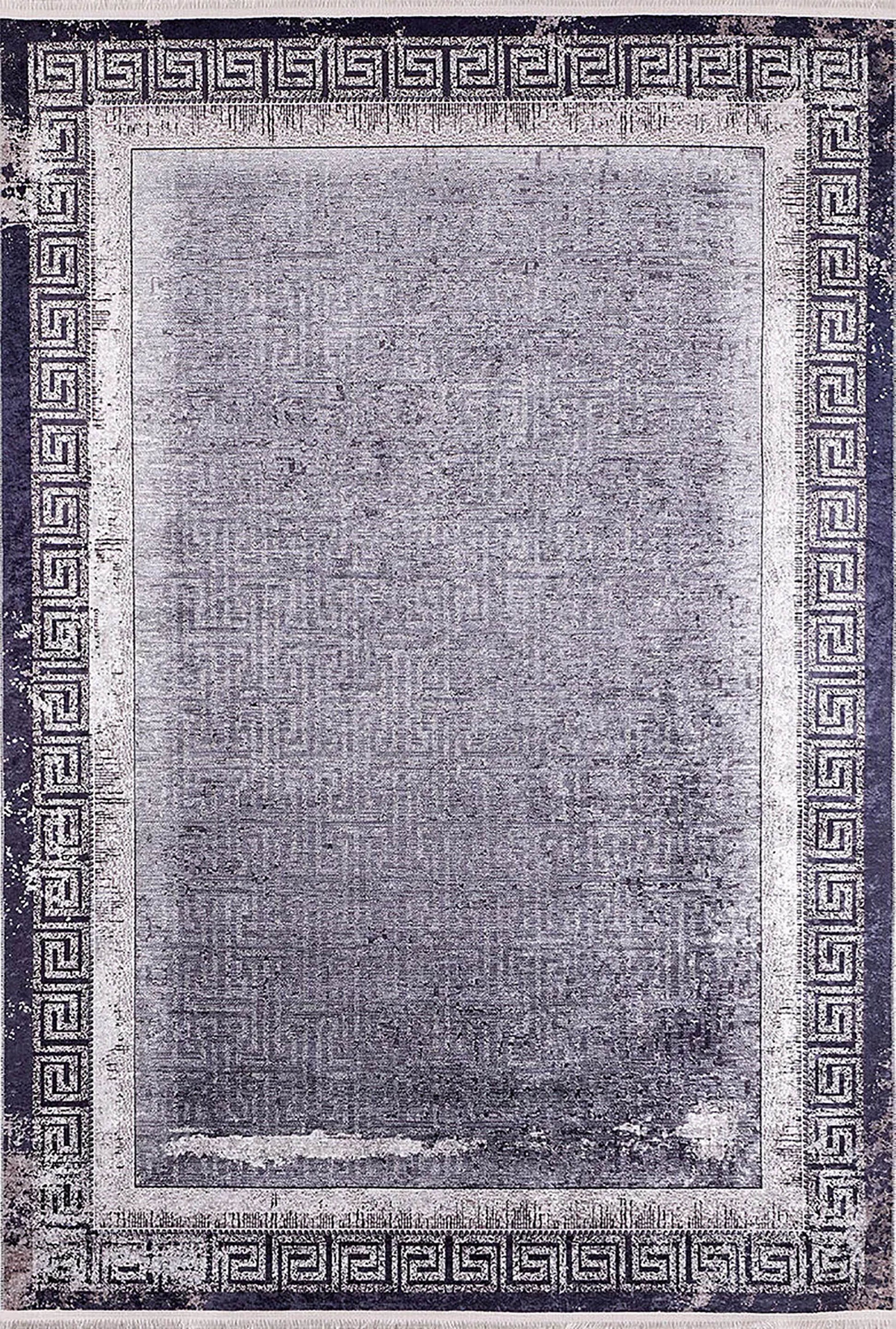 Modern ve sofistike bir estetiğe sahip bu halı, nötr renk paletiyle her mekana uyum sağlar. Halının merkezi, mor ve füme tonlarının eskitme (vintage) efektiyle oluşturduğu, iç içe geçmiş zarif bir labirent (maze) deseni taşır. Kenarlarını çevreleyen lacivert/koyu mavi ve parlak beyaz Yunan anahtar (meander) bordürü, halıya klasik bir zarafet ve güçlü bir çerçeve sunar. Zamansız tasarımı sayesinde modern ve minimalist dekorasyonlar için idealdir.