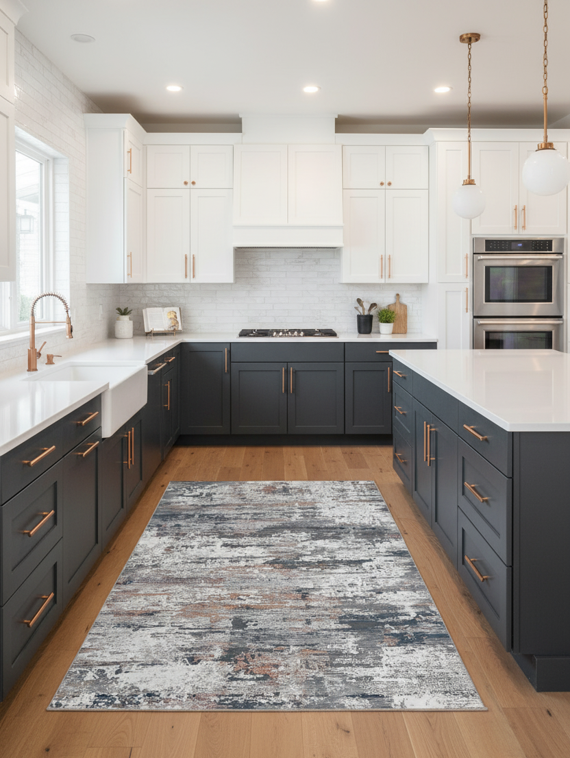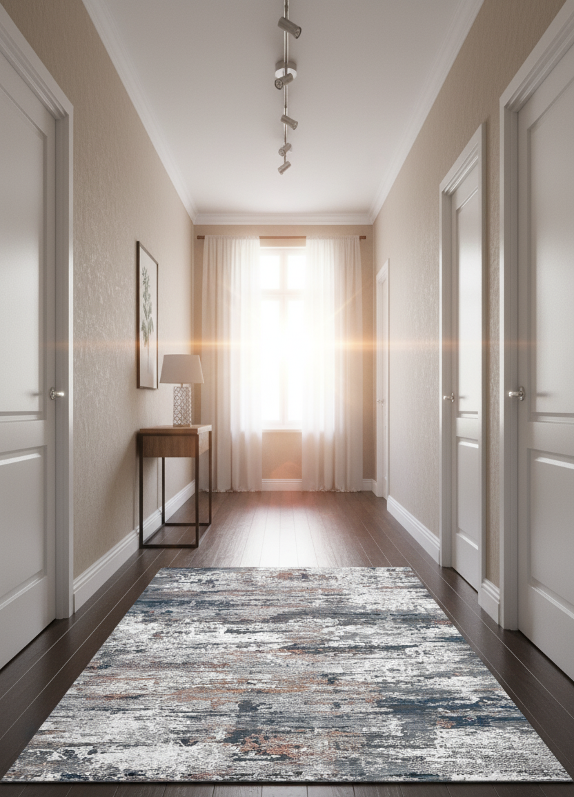Modern ve soyut deseniyle bu halı, nötr gri, keskin beyaz ve sıcak pas/kiremit tonlarının zarif birleşimini sunar. Geçişli (distressed) görünümü sayesinde oturma odası veya salonda anında sanatsal bir odak noktası yaratır. Şık, sofistike ve çağdaş bir zemin vurgusu arayanlar için mükemmel.