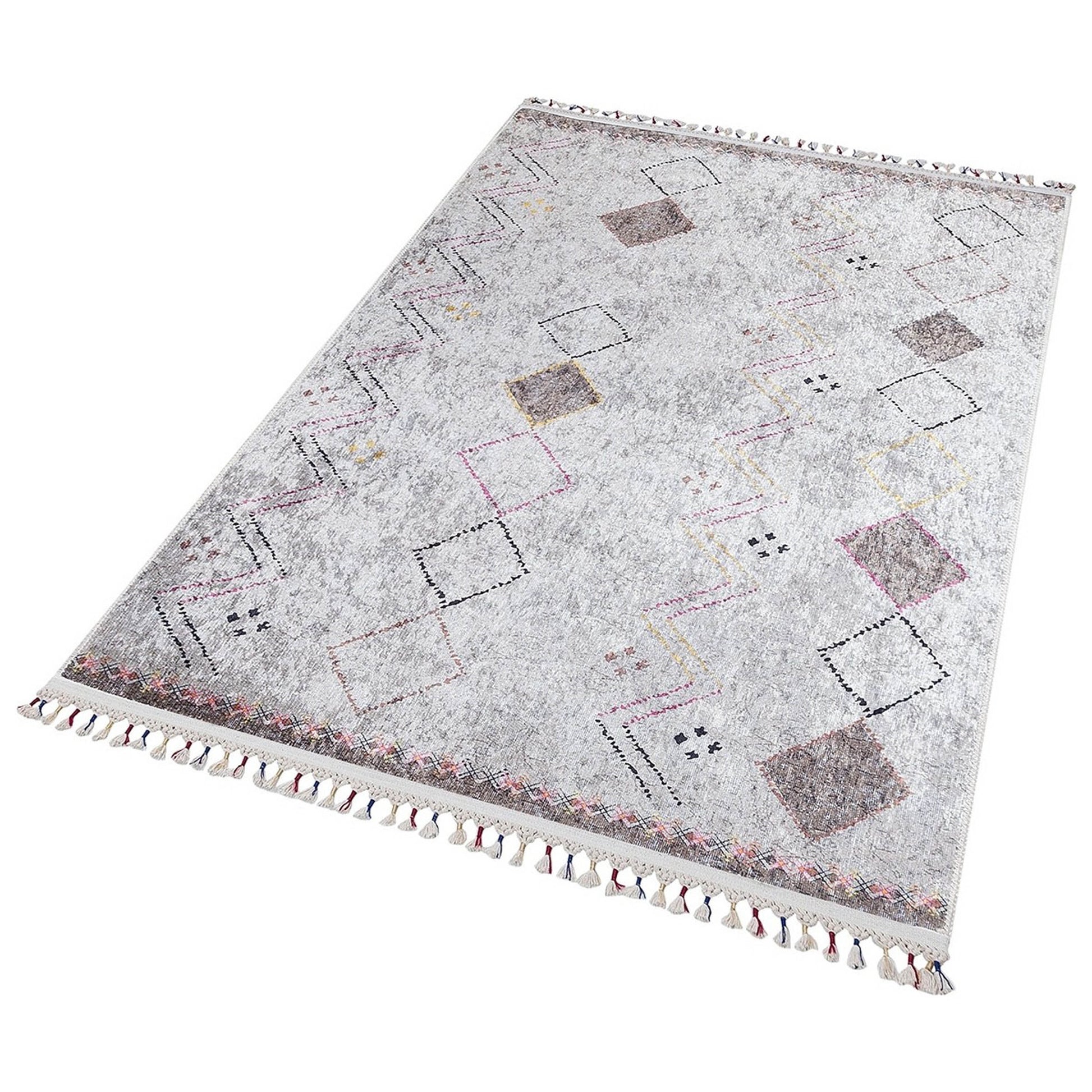 Krem Renkli Geometrik Desenli Modern Saçaklı Kaymaz Kilim Halı