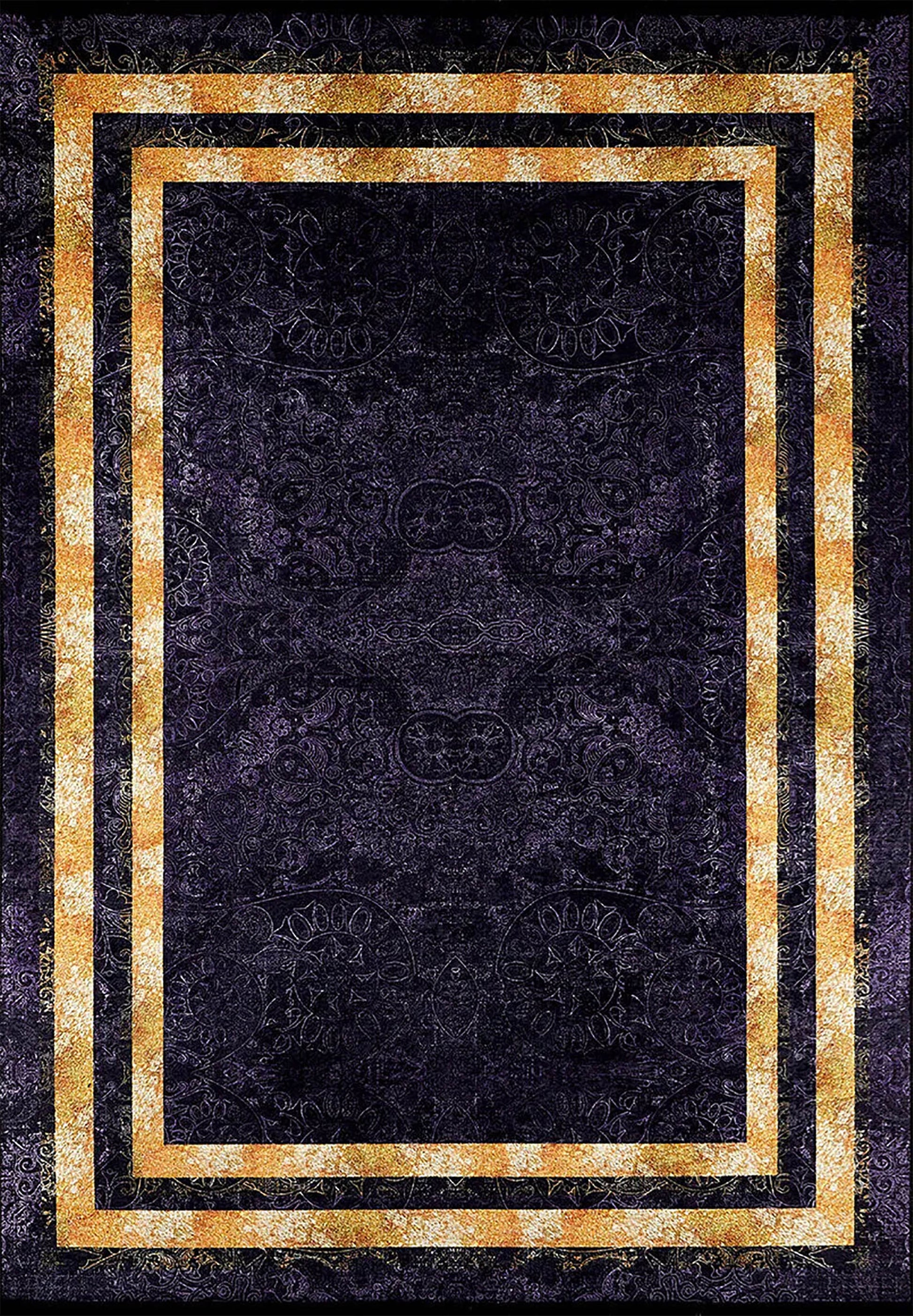 Odanıza zenginlik ve ihtişam katacak, lüks bir görünüme sahip halı. Halının derin mor ve siyah tonlarındaki merkezi, gizemli ve zarif bir Damask (klasik çiçeksi) desene sahiptir. Bu koyu zemin, dikkat çekici, parlak altın sarısı bir bordür ile çerçevelenmiştir. Yüksek kontrastı ve sofistike deseni sayesinde modern lüks, klasik veya art deco tarzı dekorasyonlarla muhteşem bir uyum sağlar.