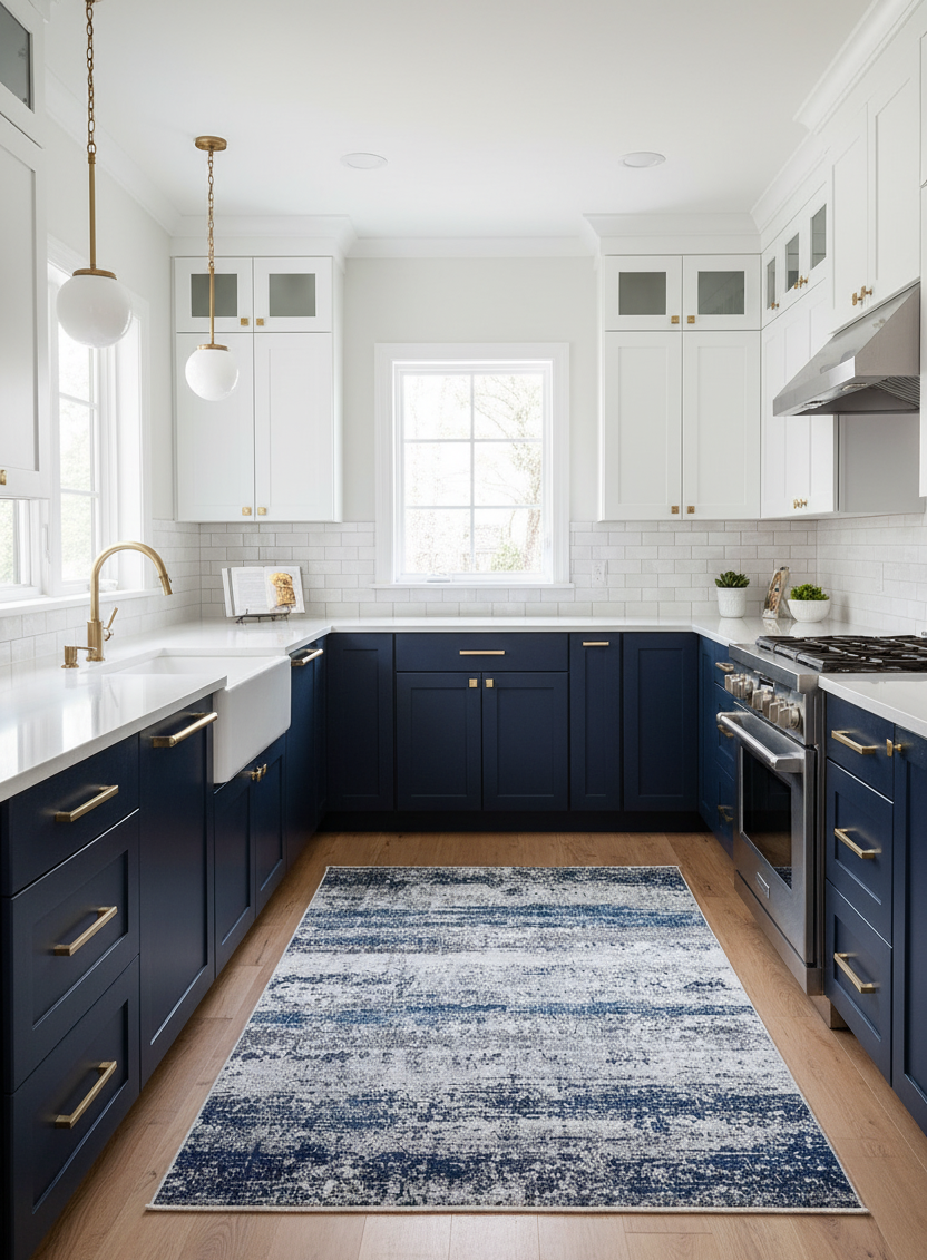 Modern ve soyut deseniyle bu halı, derin mavi, canlı beyaz ve gri tonlarının çarpıcı birleşimini sunar. Geçişli (distressed) görünümü sayesinde oturma odası veya salonda anında sanatsal bir odak noktası yaratır. Şık, dinamik ve çağdaş bir zemin vurgusu arayanlar için mükemmel.