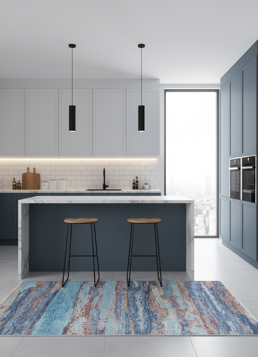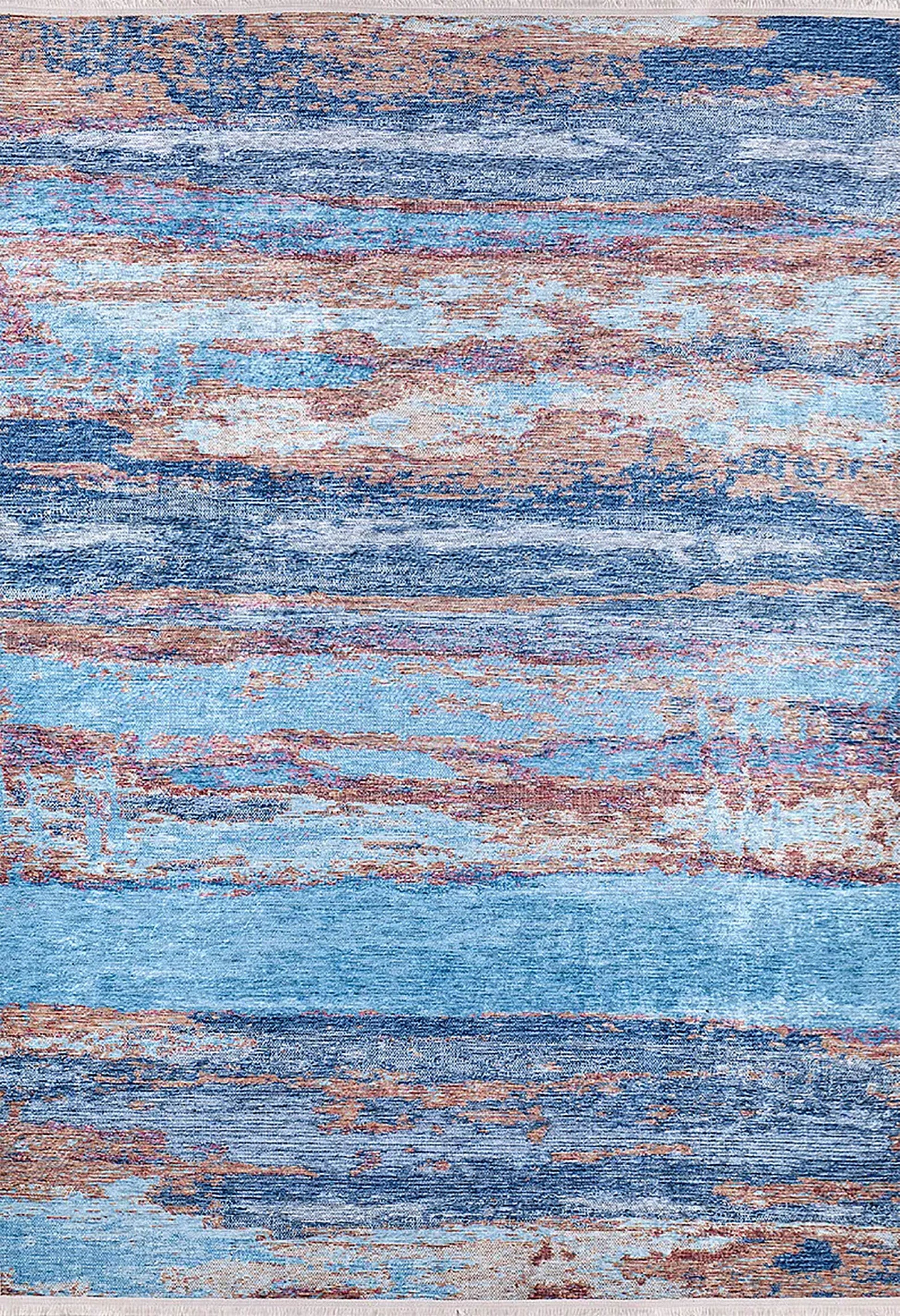 Mavi ve Pas Tonlarında Soyut Halı ile mekanınıza anında enerji katın. Fırça darbesi görünümündeki çok renkli geçişli deseni, oturma odası ve salonda modern bir odak noktası yaratır. Şık ve dinamik bir zemin vurgusu arayanlar için idealdir.