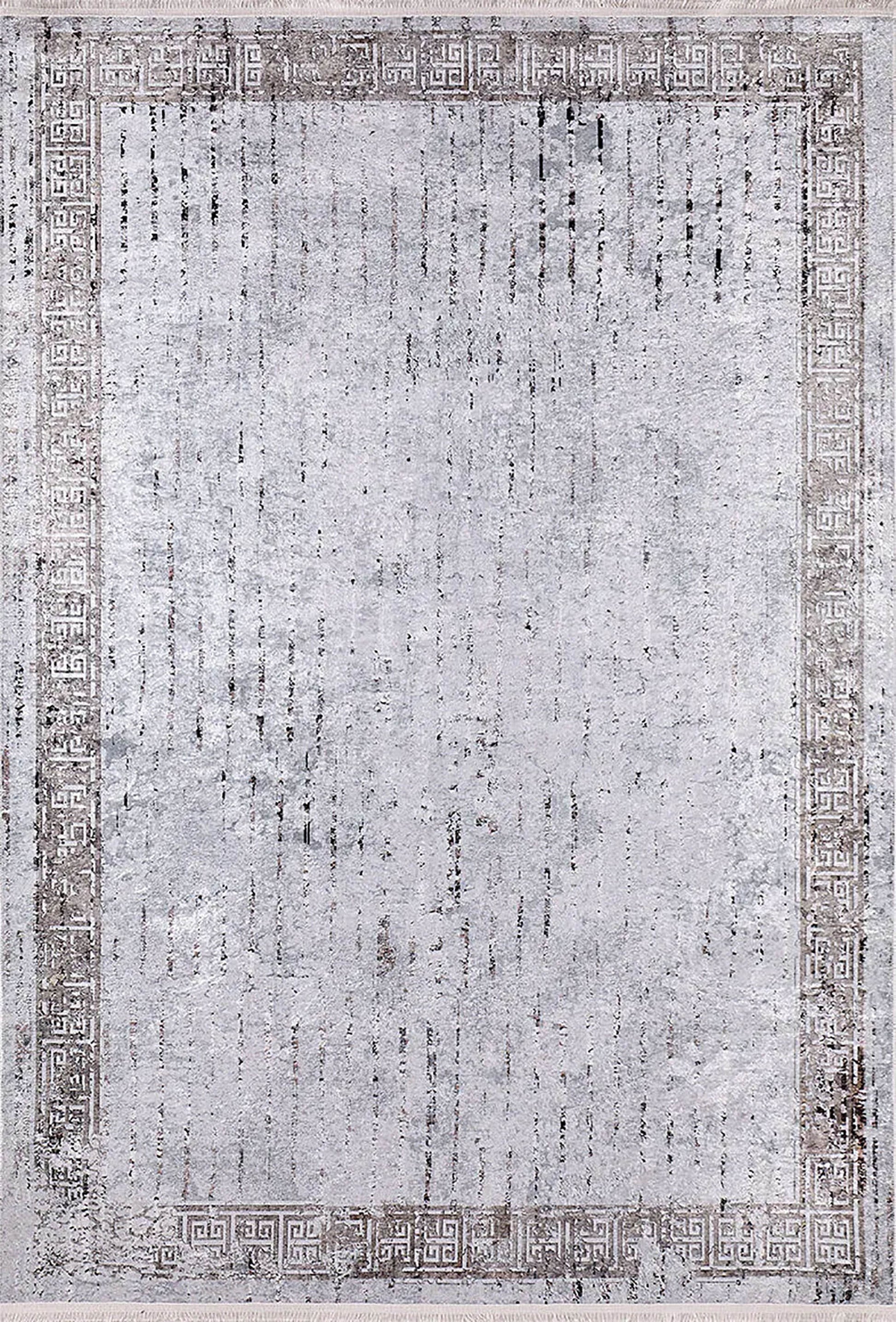Ferah ve modern mekanlar için tasarlanmış bu halı, açık gri ve gümüş tonlarıyla odanıza aydınlık bir hava katıyor. Halının eskitme (distressed) deseni, dikey çizgilerle hareketlendirilmiş minimalist bir görünüm sunar. Kenarlarını çevreleyen bej-taupe tonlarındaki zarif Yunan anahtar (meander) bordürü, sade tasarıma klasik ve sofistike bir dokunuş ekler. İskandinav, minimalist ve modern dekorasyon tarzlarıyla mükemmel uyum sağlar.