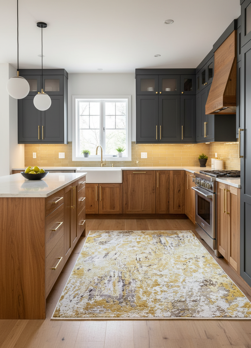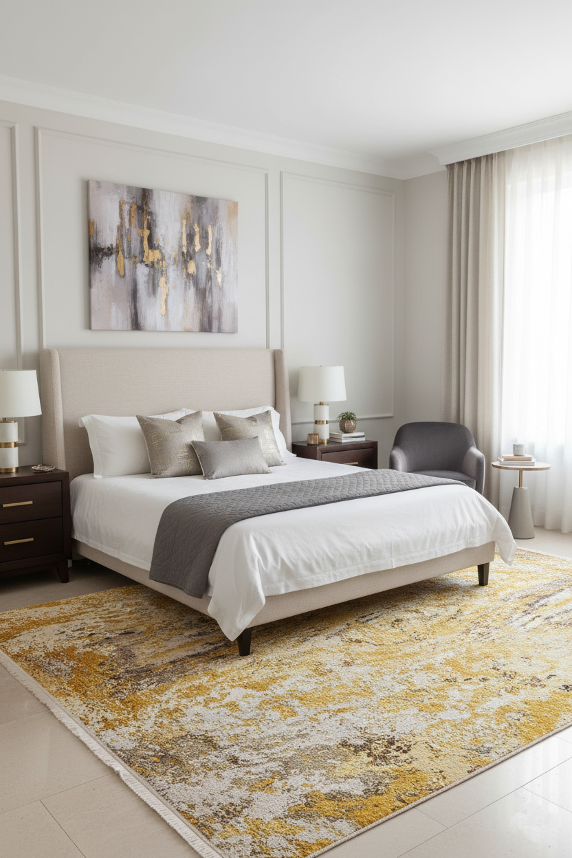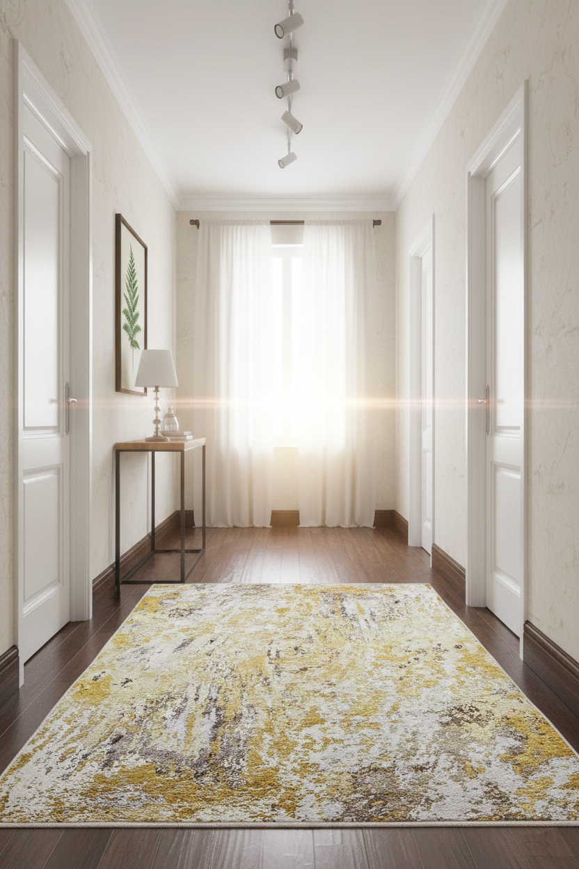 Modern ve soyut deseniyle bu halı, canlı sarı, parlak altın ve gri tonlarının çarpıcı birleşimini sunar. Geçişli (distressed) deseni sayesinde oturma odası veya salonda anında sanatsal bir odak noktası yaratır. Şık, enerjik ve lüks bir zemin vurgusu arayanlar için mükemmel.