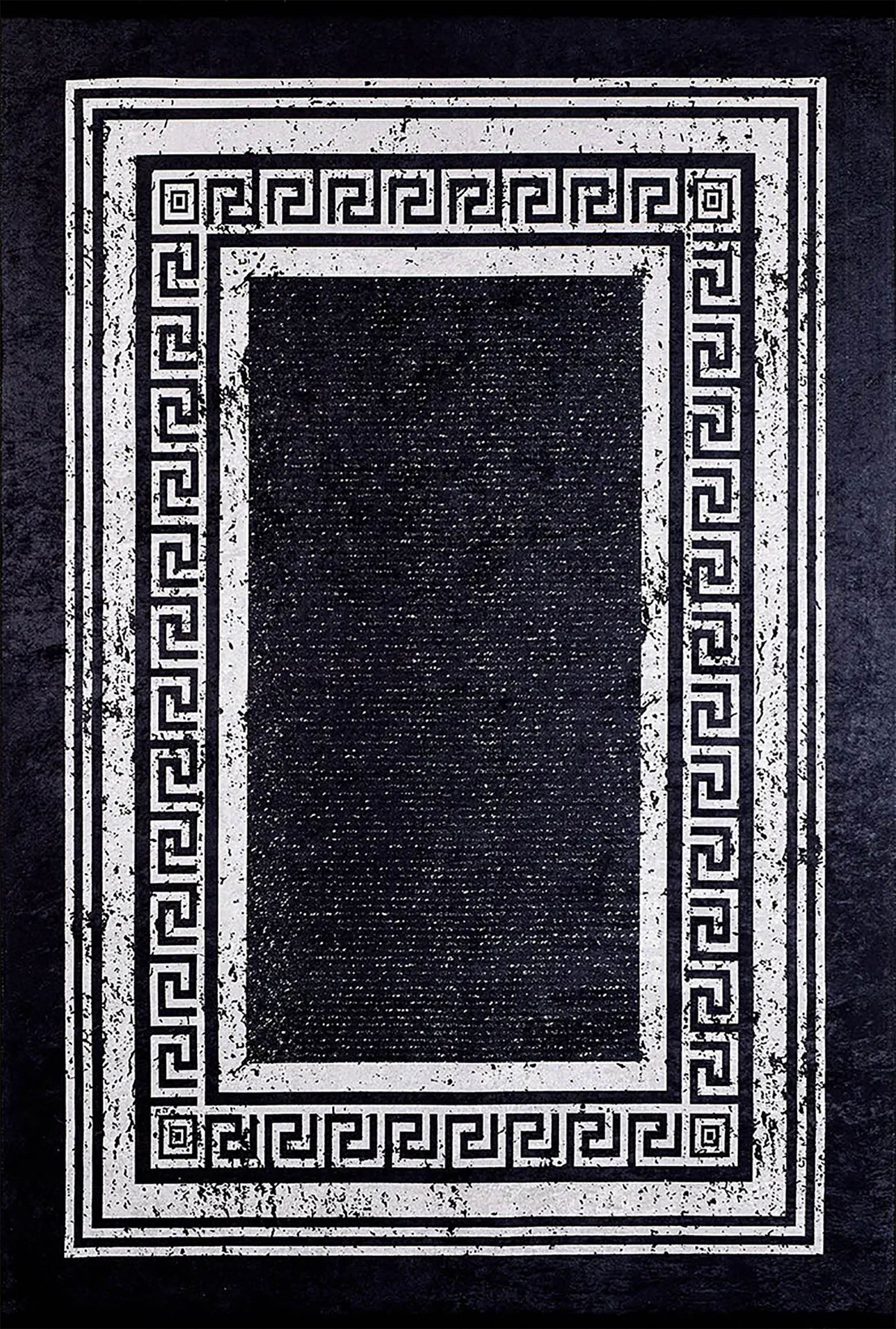 Yaşam alanınıza sofistike ve zamansız bir dokunuş katacak, klasik Yunan anahtar deseniyle süslenmiş bu halı, modern ve şık bir görünüm sunar. Siyah ve beyazın güçlü kontrastı, mekanı daha geniş ve aydınlık gösterirken, dikkat çekici bordür detayıyla her türlü dekorasyon stiline uyum sağlar.