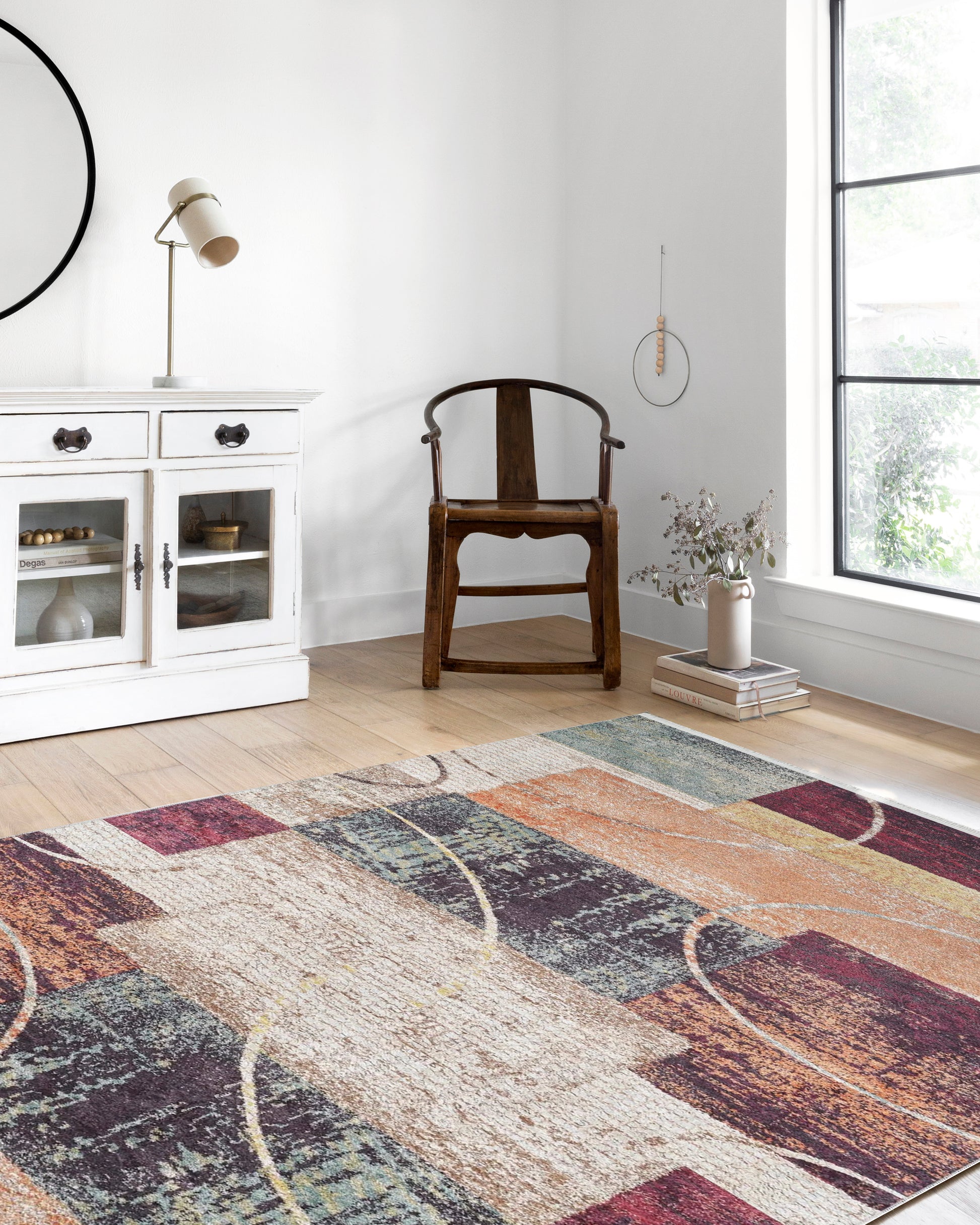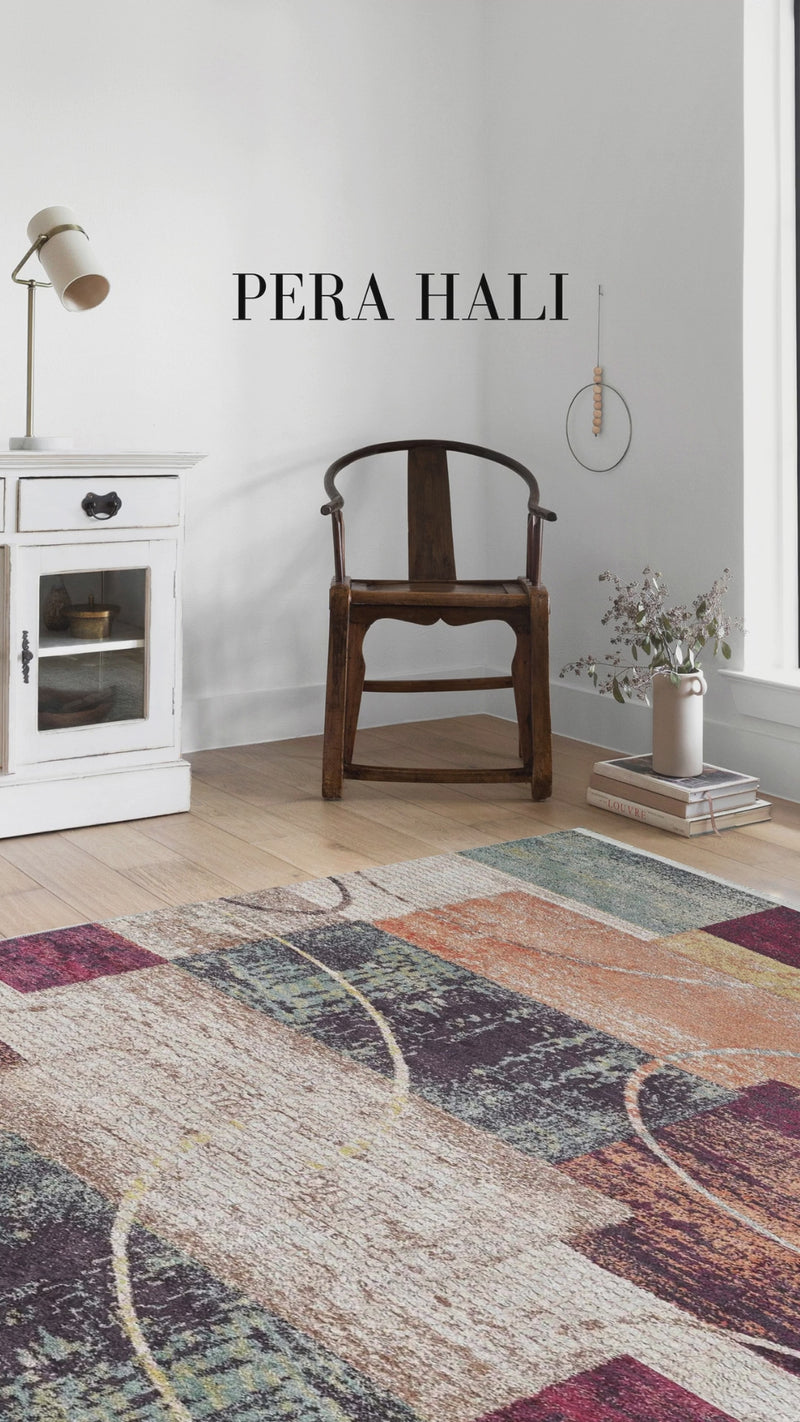 Modern ev dekorasyonuna uyum sağlayan, pratik kullanımlı ve şık halılarımızla tanışın! Bu dijital baskılı, yıkanabilir halı; bordo, turuncu, mavi, bej ve kahve gibi canlı renk blokları ile soyut daire desenlerini birleştirerek dinamik ve sanatsal bir görünüm sunar. Kolay temizlenebilir yapısıyla çocuklu ve evcil hayvanlı evler için idealdir. Evinizin havasını anında değiştirin!