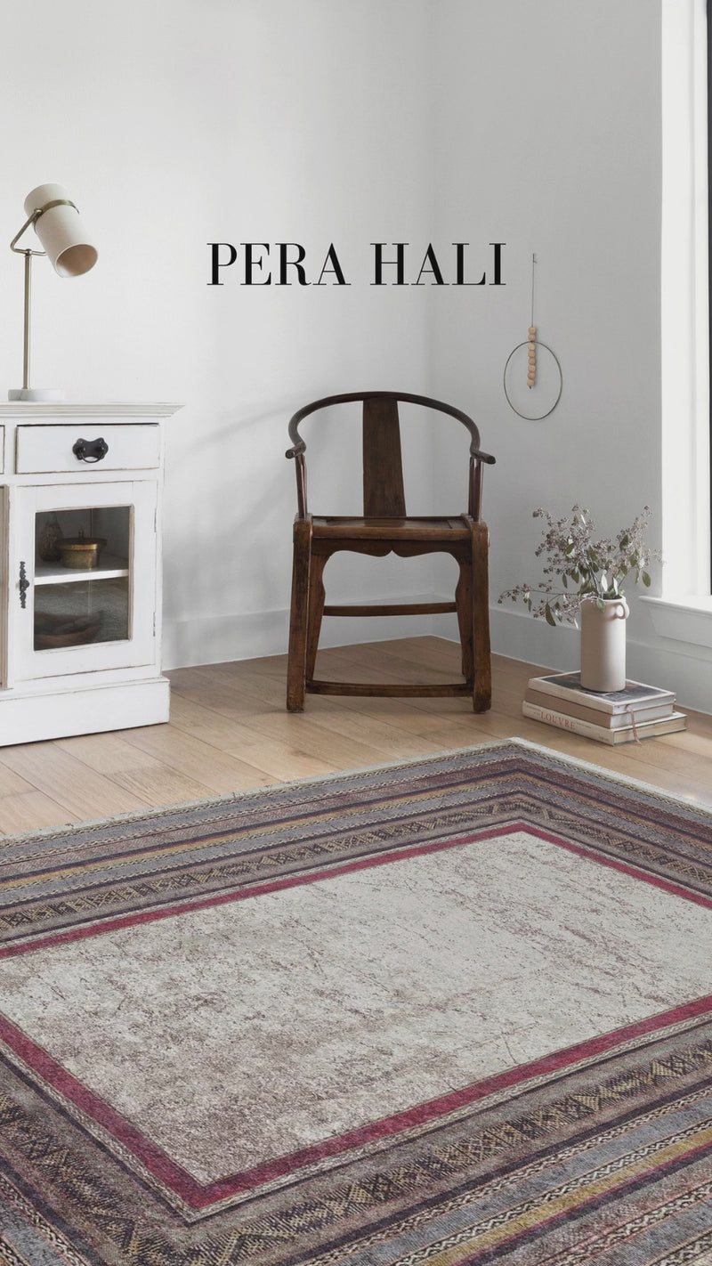 Geometrik çok renkli doğal halı, çerçeveli geometrik tasarımıyla zamansız bir atmosfer sunar ve şık bir alan oluşturur. Bu modern ve vintage esintili halı, kır evi tarzı oluşturmanız için çok yönlü bir temel sağlar.
