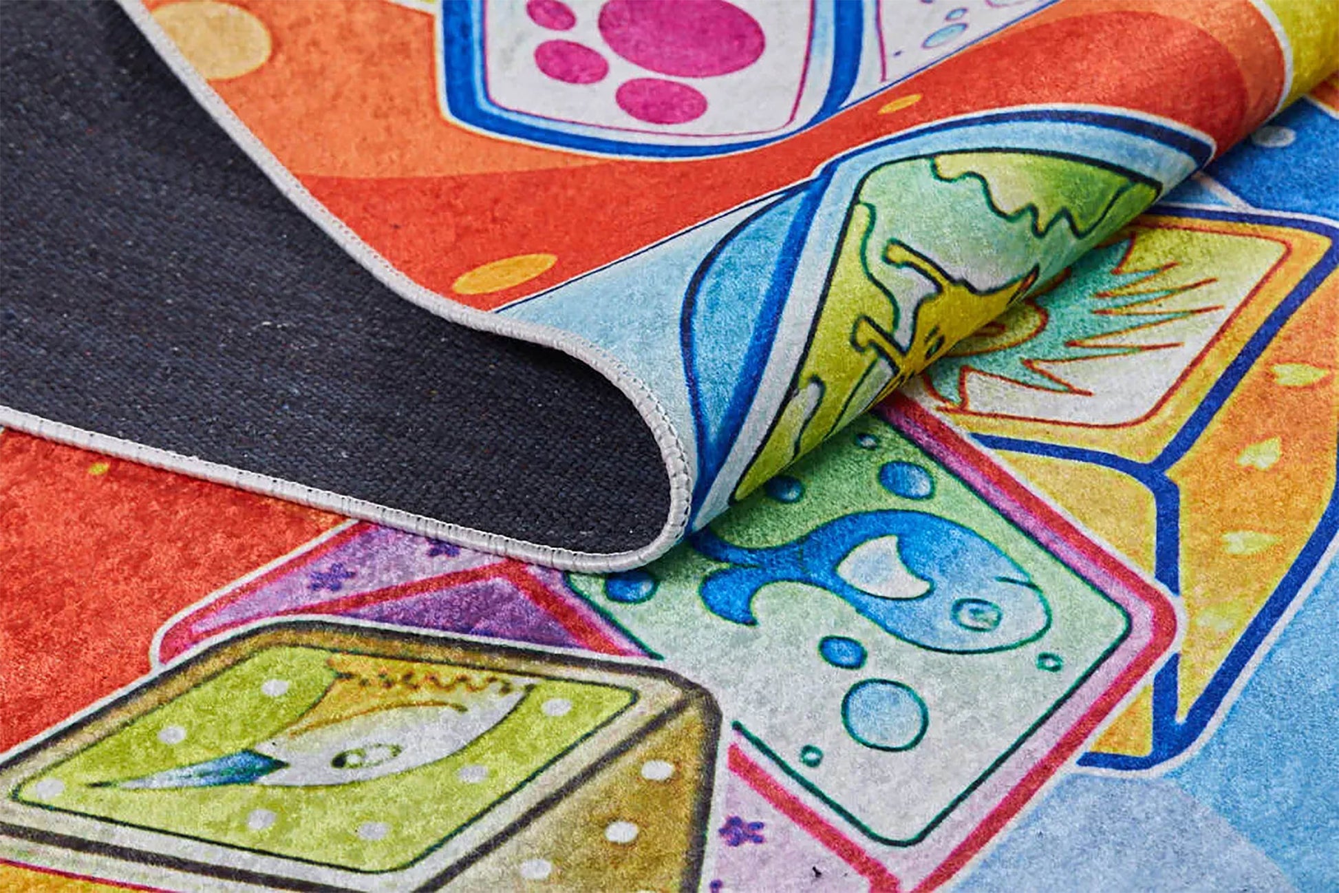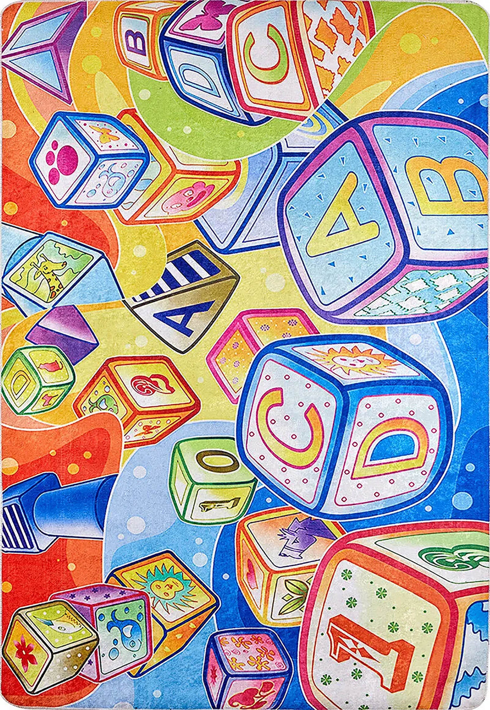Canlı ve enerjik renklerle dolu, üzerinde harfler (ABC) ve sayılar bulunan küp desenli eğlenceli oyun halısı. Çocuk odasında öğrenmeyi ve oynamayı teşvik eden, dikkat çekici ve yumuşak bir üründür.