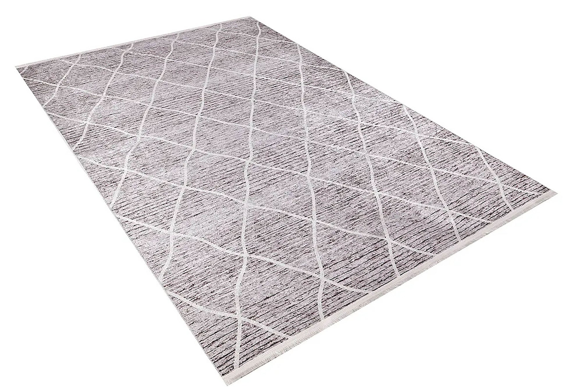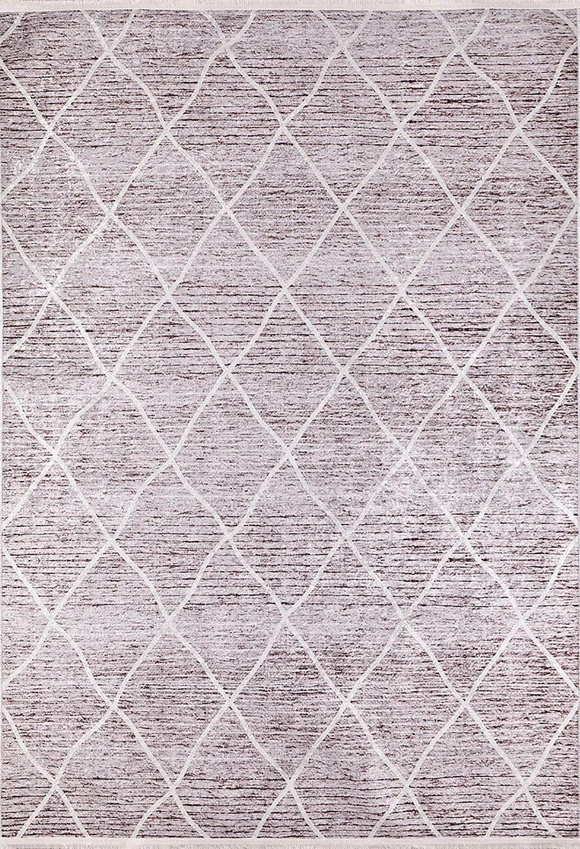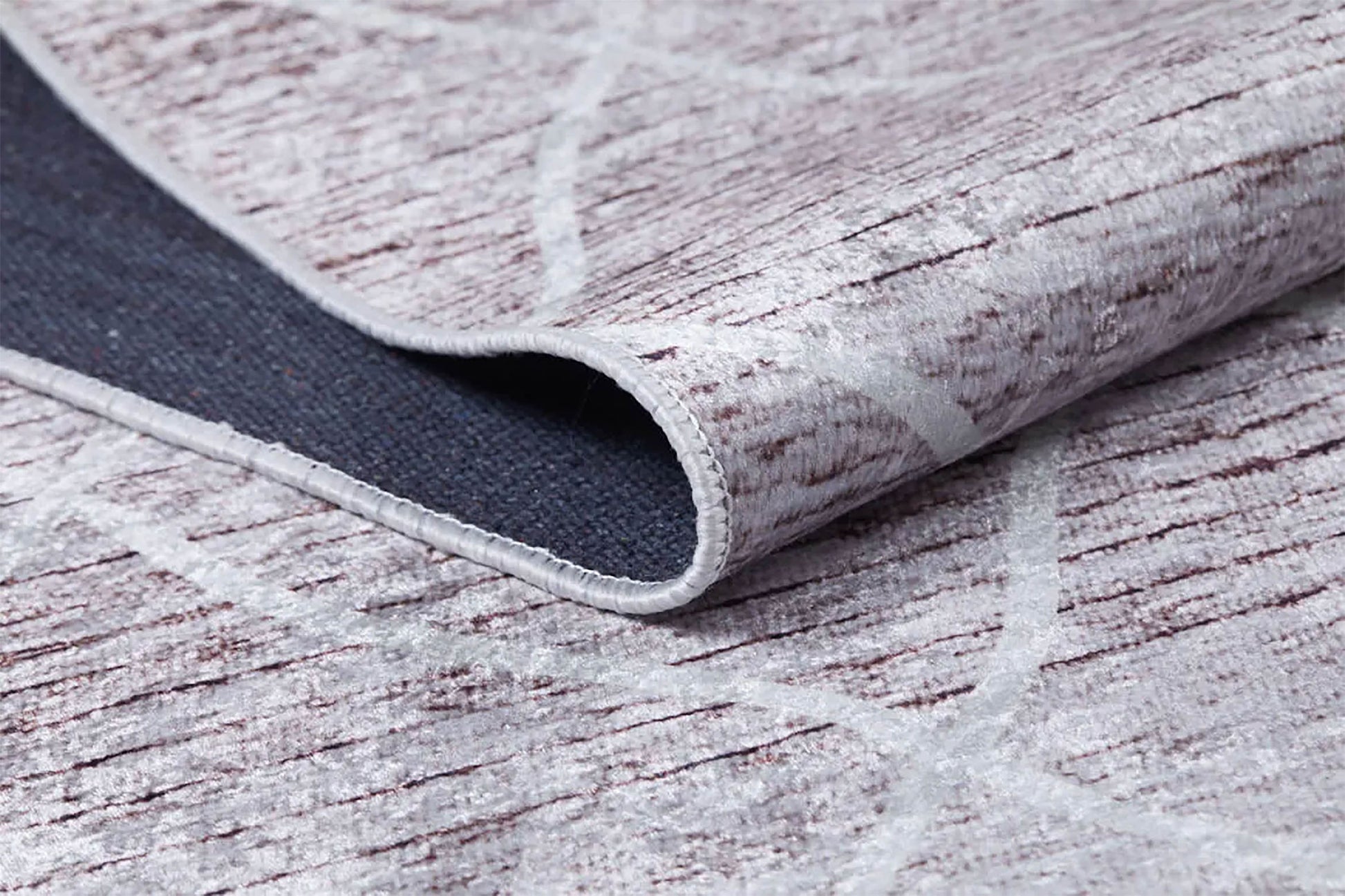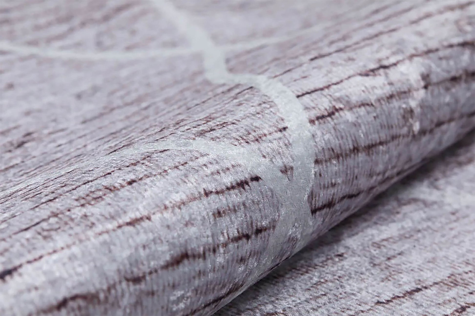 Pembe ve gül kurusu tonlarında, eskitme görünümlü bir doku üzerine ince beyaz/açık renkli baklava deseni işlenmiş modern halı. Nötr renkleri ve zarif geometrisi ile İskandinav ve modern mekanlara uyum sağlar.