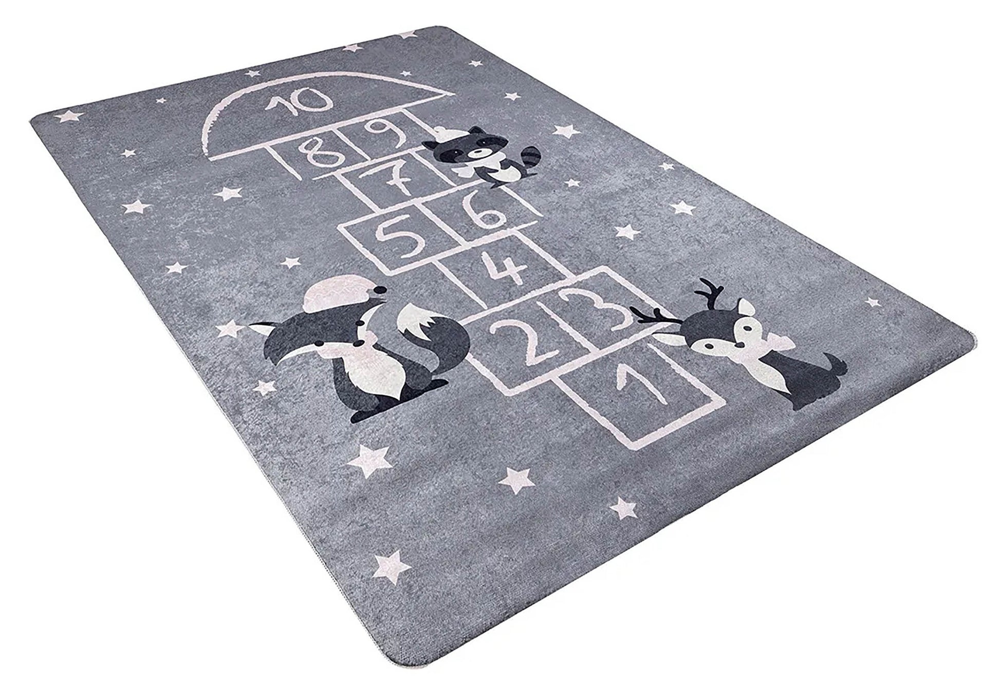 Çocuk odası ve oyun alanları için hem modern hem de çok yönlü bir halı. Üzerindeki 1'den 10'a kadar numaralı Seksek deseni, çocukları hareket etmeye ve oynamaya teşvik ederken sayıları öğrenmelerine yardımcı olur. Tilki, rakun ve geyik gibi sevimli kış hayvanı karakterleri, halıya neşeli ve modern bir hava katar. Gri tonları ve yıldız detaylarıyla İskandinav veya modern tarzdaki çocuk odalarına mükemmel uyum sağlar. Bebek ve çocuk odaları için idealdir.
