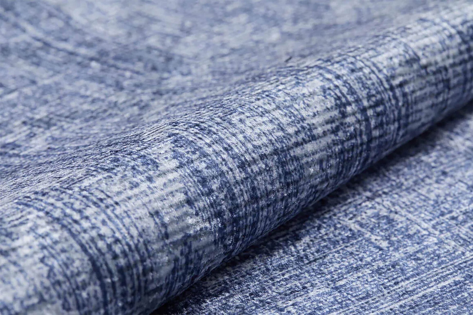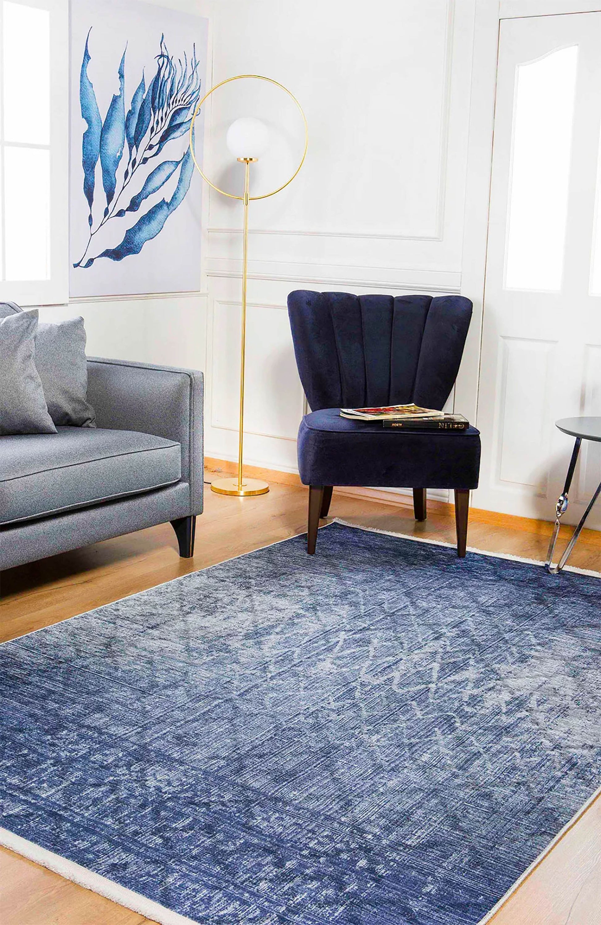 Koyu lacivert/mavi tonlarından başlayıp orta kısımda açık griye geçiş yapan degrade renk efektine sahiptir. Üzerinde eskitilmiş görünümlü geometrik baklava (kafes) ve dikey çizgi desenleri bulunur. Odanıza modern ve çarpıcı bir renk derinliği katar.