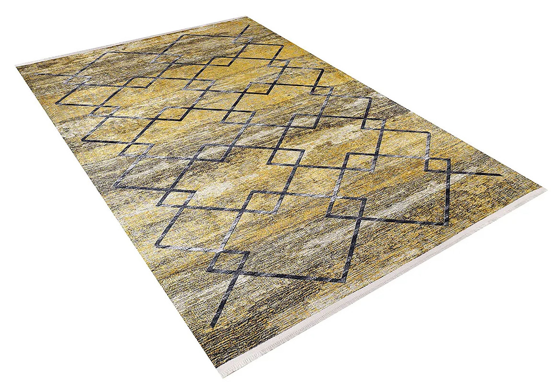 Hardal sarısı ve kahve tonlarındaki eskitme zemin üzerine, koyu gri/siyah renkte baklava kafes deseni işlenmiş modern halıdır. Canlı sarı rengi ve geometrik deseniyle mekana dinamik, bohem ve çağdaş bir enerji katar. Salon ve oturma odaları için ideal, cesur bir zemin dekorasyon parçasıdır.