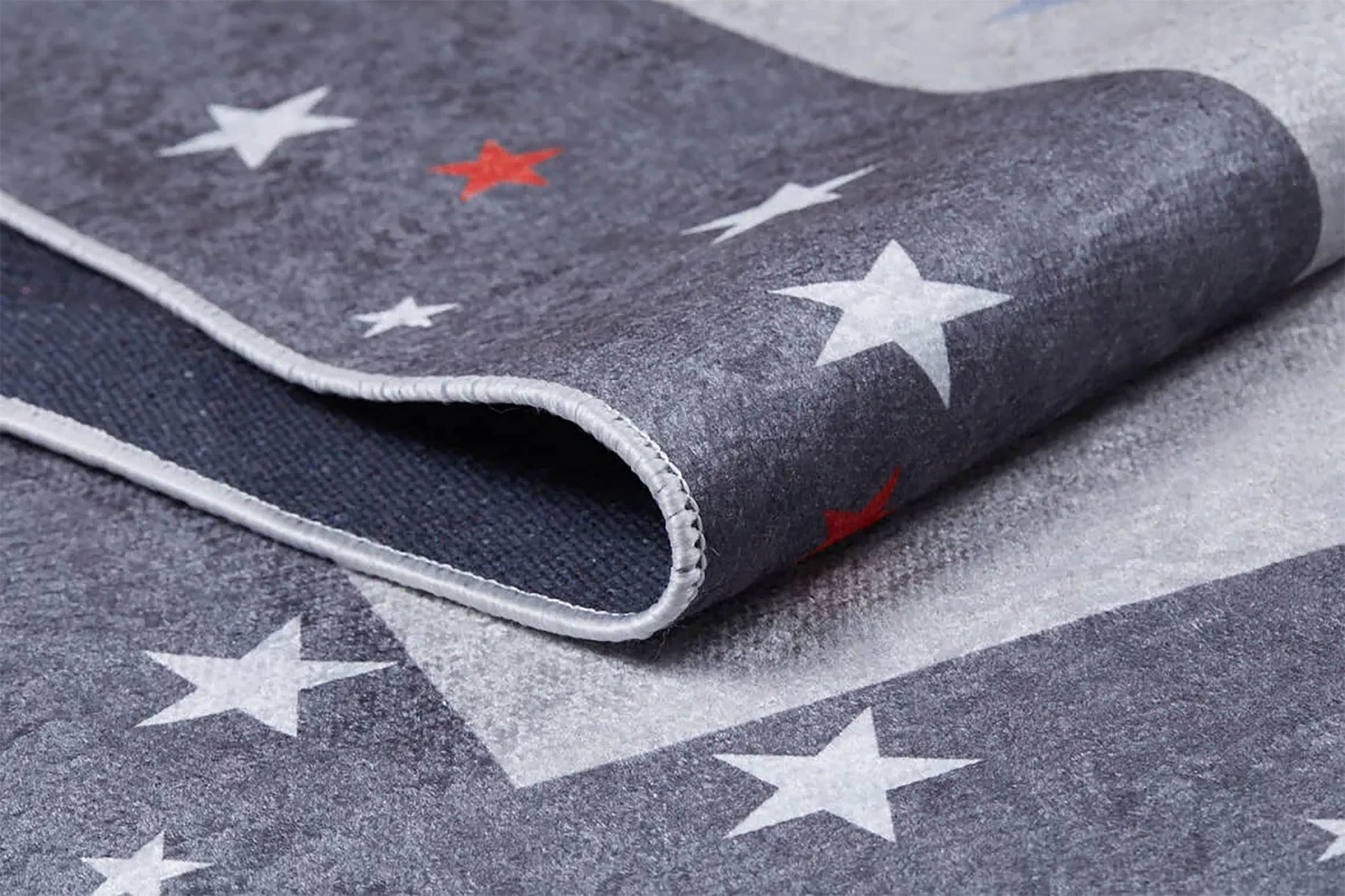 Gri zemin üzerinde, üst üste dizilmiş sincap, porsuk ve kaplumbağa gibi sevimli hayvan figürleriyle tasarlanmıştır. Koyu gri zemin üzerine beyaz ve kırmızı yıldızlarla çevrili bordürüyle modern ve şık bir çocuk odası/bebek odası dekorasyonu sunar.