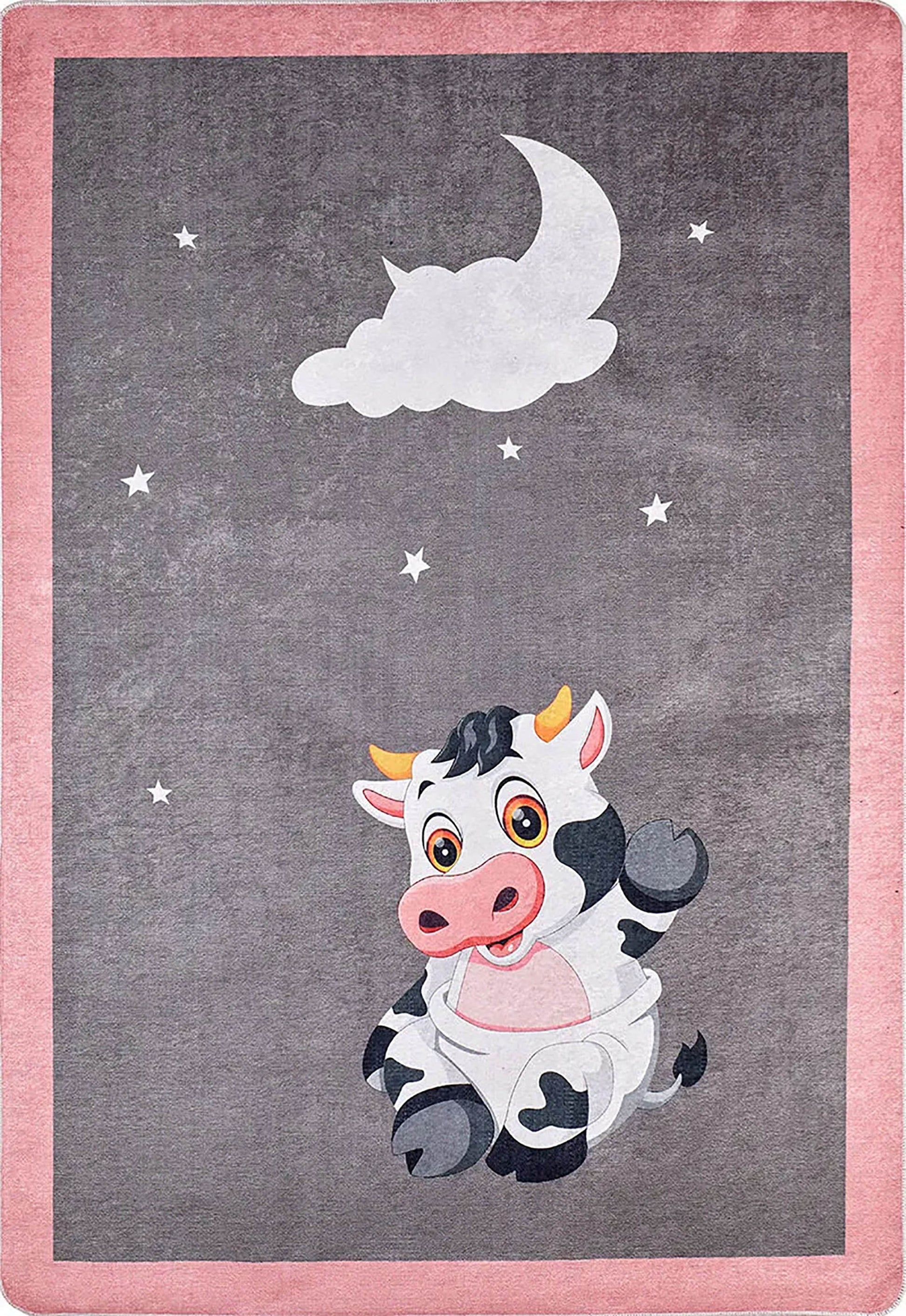 Çocuk odaları ve oyun alanları için tasarlanmış, yumuşak ve eğlenceli bir halı. Koyu gri zemin üzerinde, hilal ay ve yıldızların altında oturan sevimli bir çizgi film inek karakteri bulunur. Dış kenarlardaki yumuşak pembe bordür, tasarıma sıcak ve çocuk dostu bir hava katarak odanın atmosferini güzelleştirir.