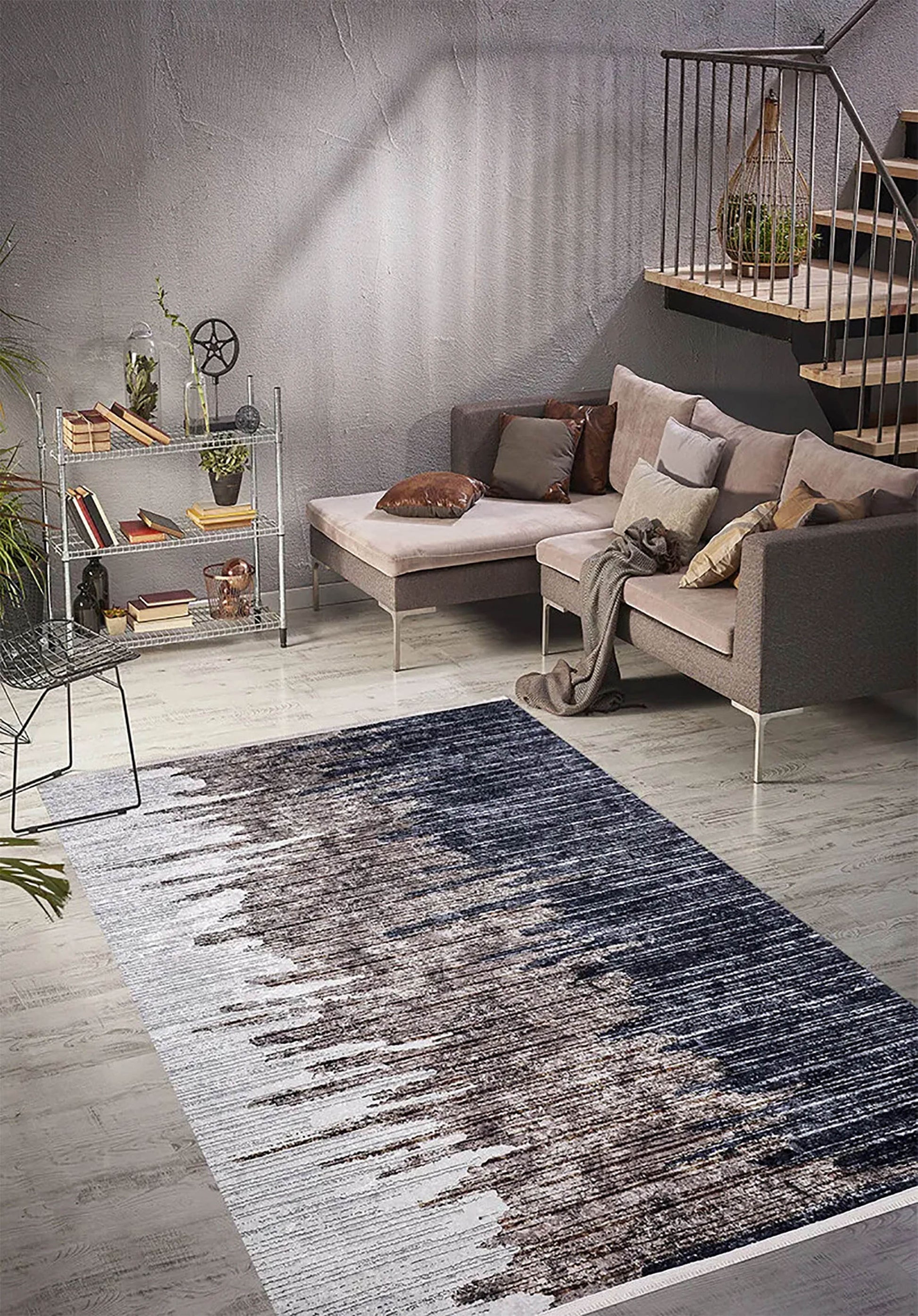 Beyaz/Açık gri, kahverengi ve koyu füme/lacivert tonlarının yatay ve aşınmış fırça darbesi efektiyle birleştiği modern soyut tasarımlı halıdır. Çağdaş, endüstriyel ve loft tarzı dekorasyonlar için güçlü bir odak noktası oluşturur.