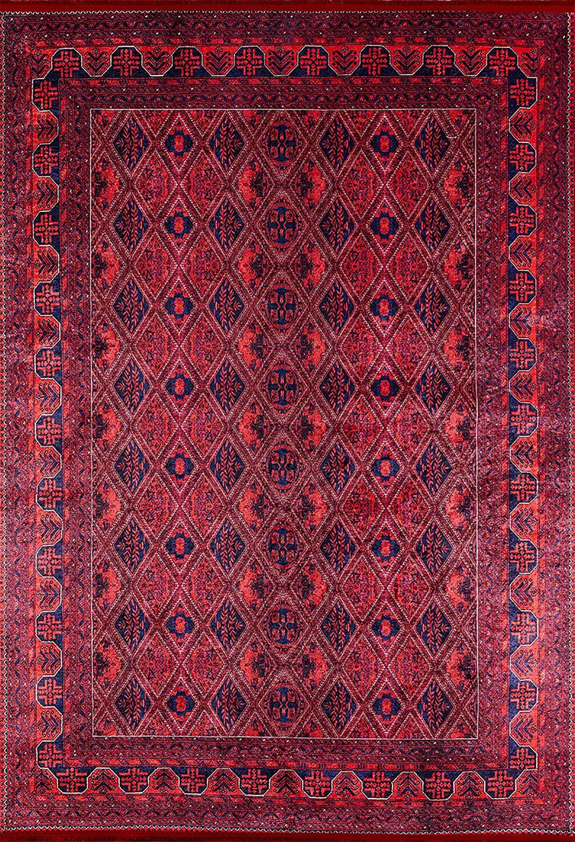 Geleneksel motiflerin gücü ve sıcak renkleriyle mekanınızı zenginleştirin. Kırmızı ve mavi tonların hakim olduğu, sürekli tekrarlayan baklava (eşkenar dörtgen) ve çiçekli geleneksel (etnik) desenlere sahiptir. Canlı ve derin renk paleti, klasik veya eklektik dekorasyonda güçlü bir odak noktası oluşturur. Salon, yemek odası ve oturma odası gibi alanlara sıcaklık ve ihtişam katmak için idealdir.
