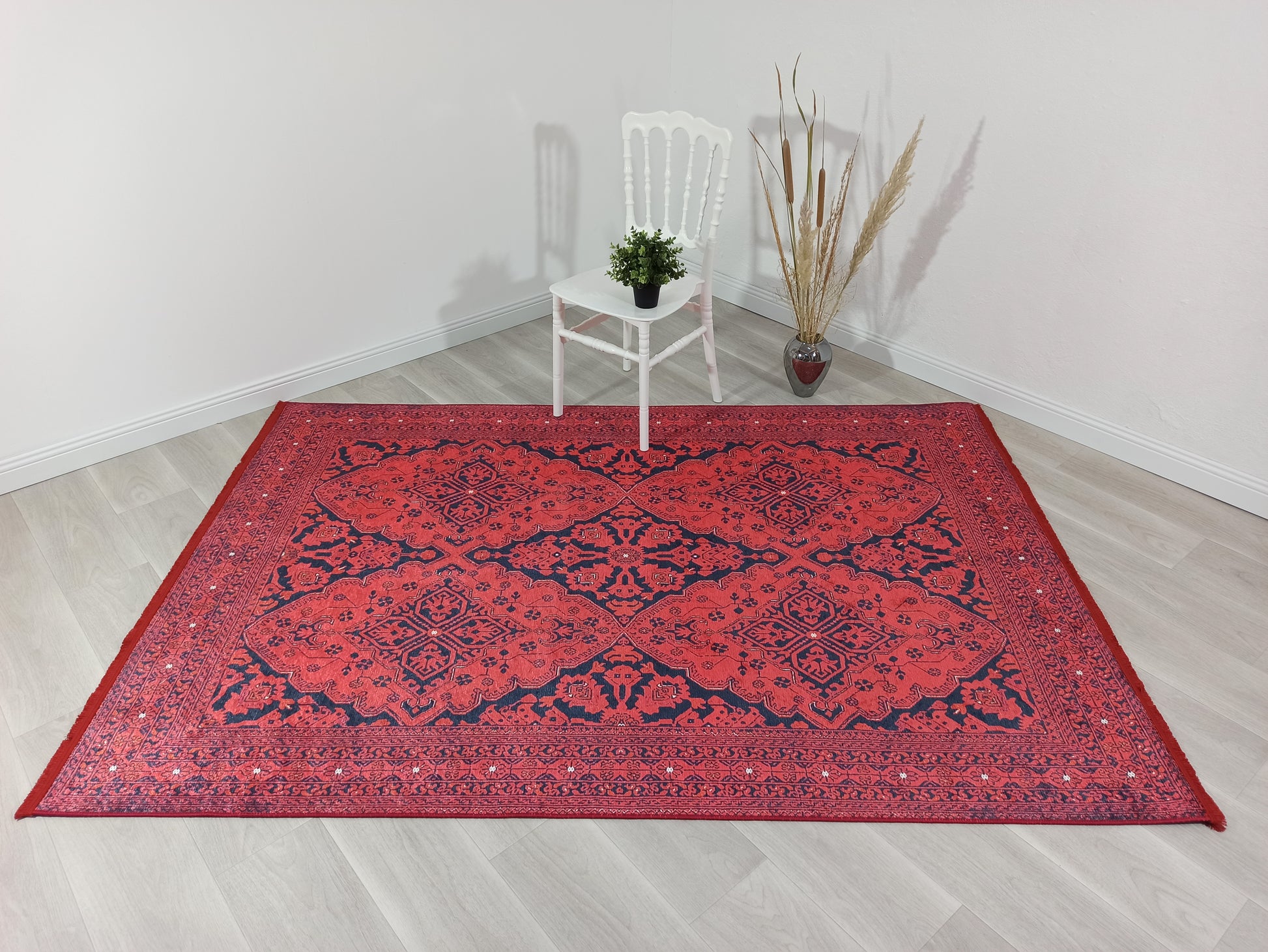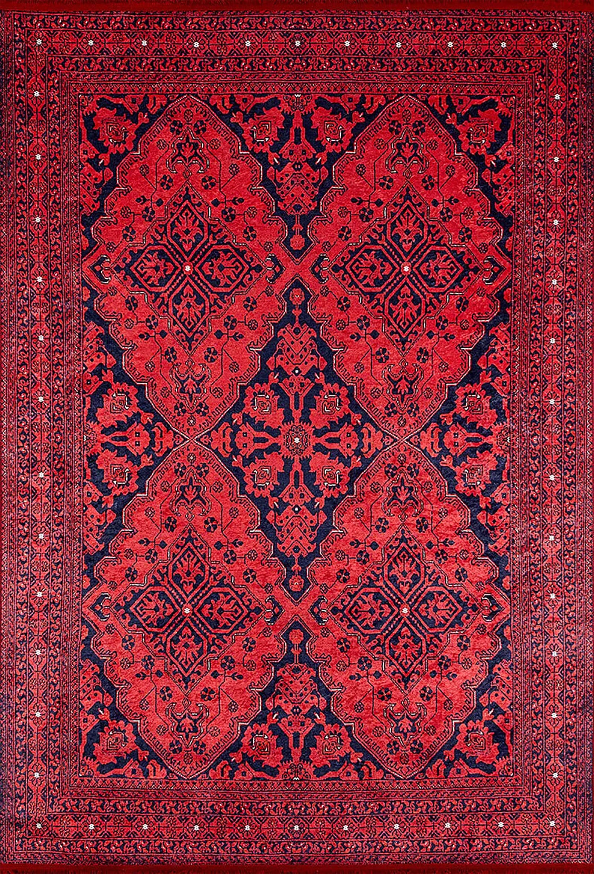 Evinize klasik zarafet ve derin renklerle lüks bir dokunuş katın. Koyu kırmızı/bordo zemin üzerinde, lacivert tonlarında detaylı ve simetrik geleneksel (oryantal) desenler barındırır. Yoğun renkleri ve karmaşık motifleriyle salonda, yemek odasında veya antrede sıcak ve gösterişli bir odak noktası oluşturur. Klasik ve eklektik dekorasyon tarzları için idealdir.