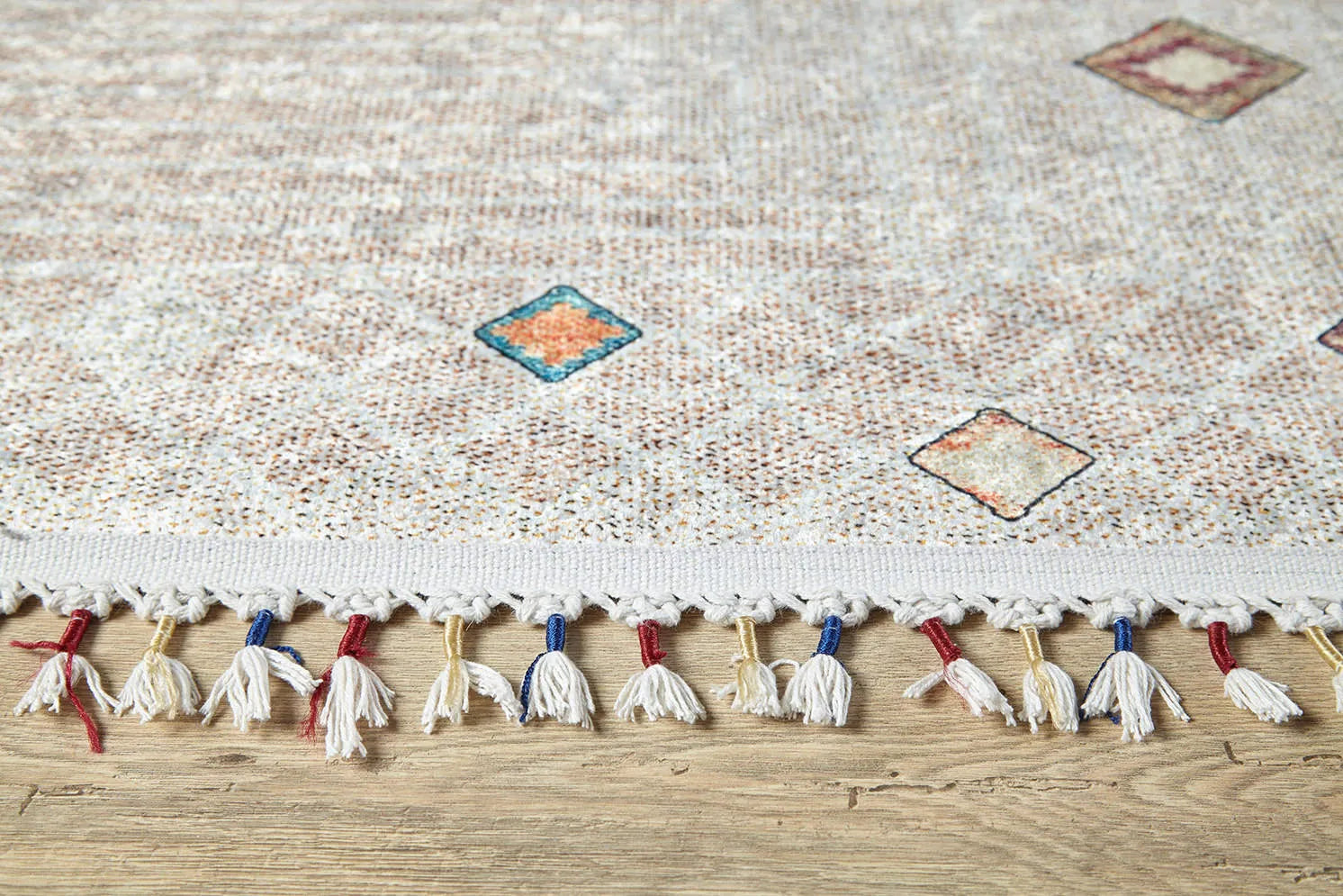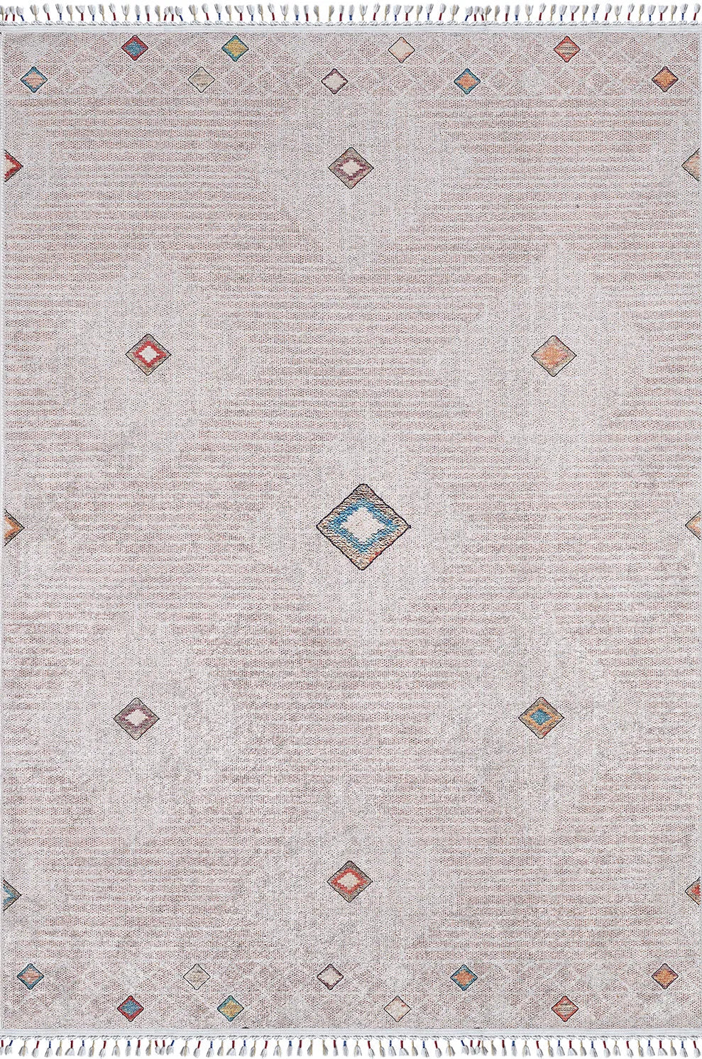 Modern ev dekorasyonuna uyum sağlayan, pratik kullanımlı ve şık halılarımızla tanışın! Bu dijital baskılı, örgülü saçaklara sahip yıkanabilir halı; bej ve kahve tonlardaki sade zemin üzerinde, seyrek ve renkli küçük baklava (eşkenar dörtgen) detaylara sahiptir. Nötr ve minimalist bir görünüm sunar. Kolay temizlenebilir yapısıyla çocuklu ve evcil hayvanlı evler için idealdir. Evinizin havasını anında değiştirin!