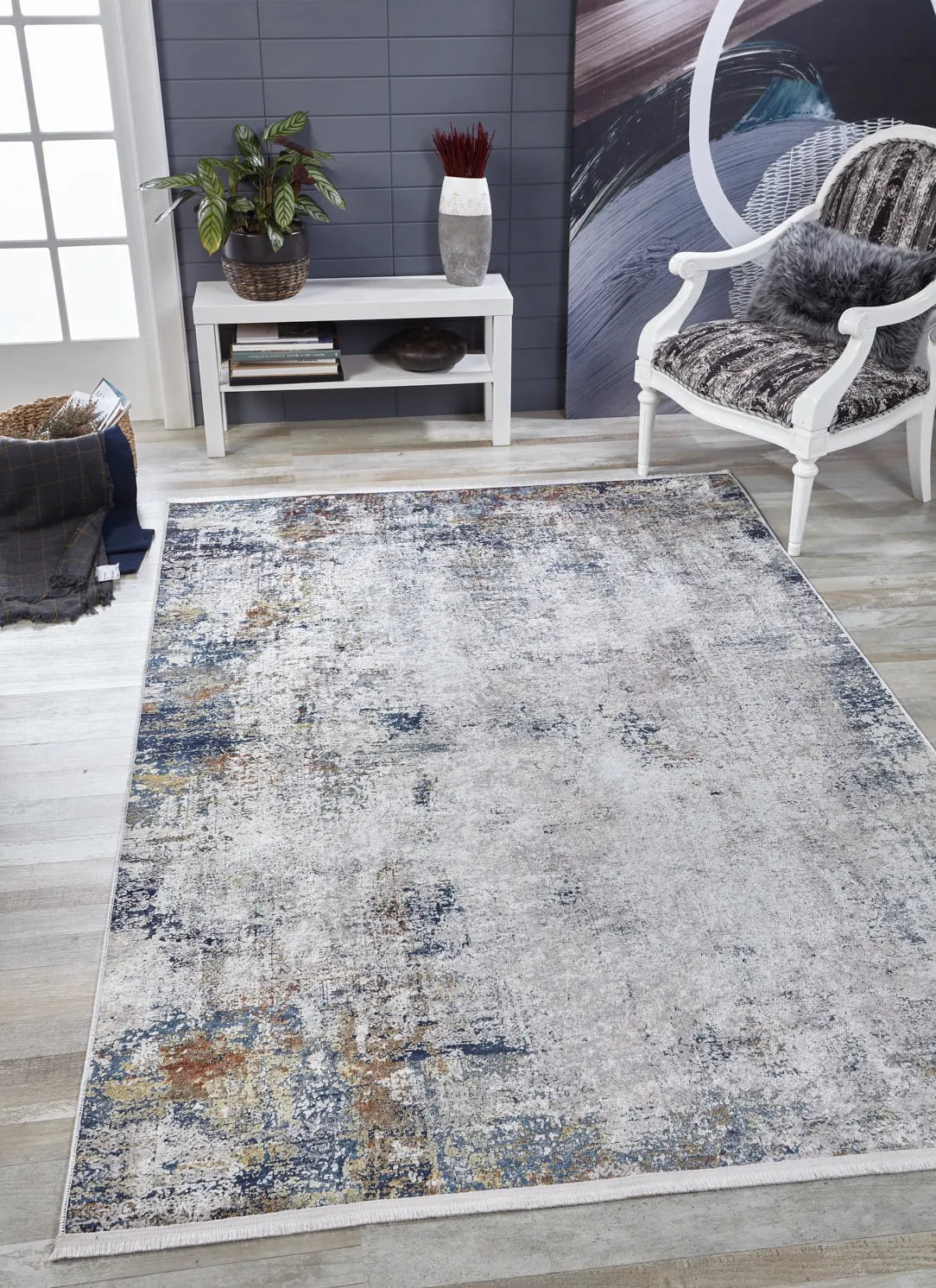 Çamaşır makinesinde yıkanabilir özel dokusu sayesinde kolay temizlik sunan bu modern halı, açık zemin üzerinde mavi, kahve ve gri tonlarda abstre eskitme (distressed) deseniyle yaşam alanınıza ferah ve sanatsal bir hava katacak. Kaymaz tabanı güvenli kullanım sağlarken, canlı renkleri uzun süre korur.