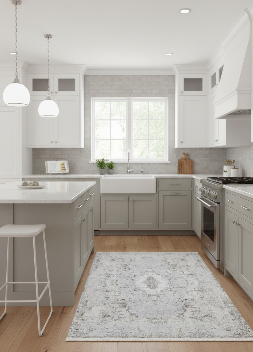 Modern klasik deseniyle bu halı, açık gri ve nötr bej/kahve tonlarının zarif geçişlerini sunar. Yıkanabilir ve eskitme (vintage/distressed) görünümü sayesinde oturma odası veya mutfakta anında sofistike bir atmosfer yaratır. Şık, pratik ve zamansız bir zemin vurgusu arayanlar için mükemmel.