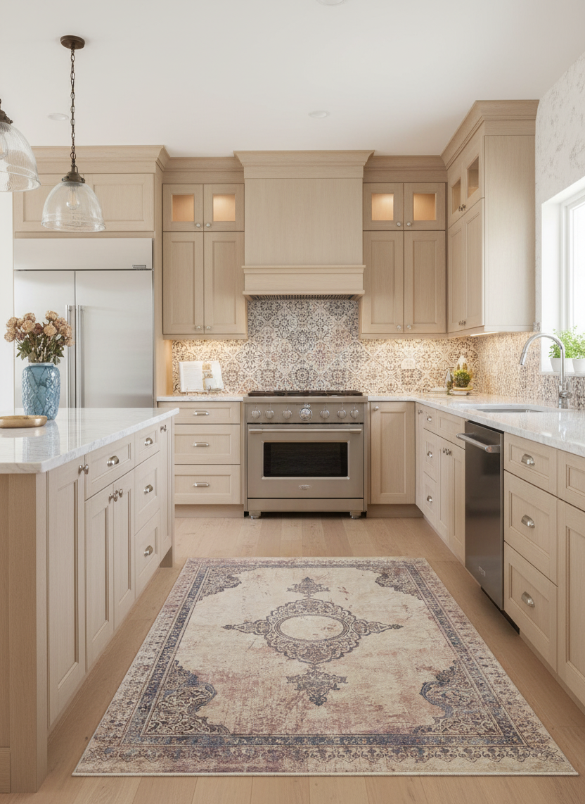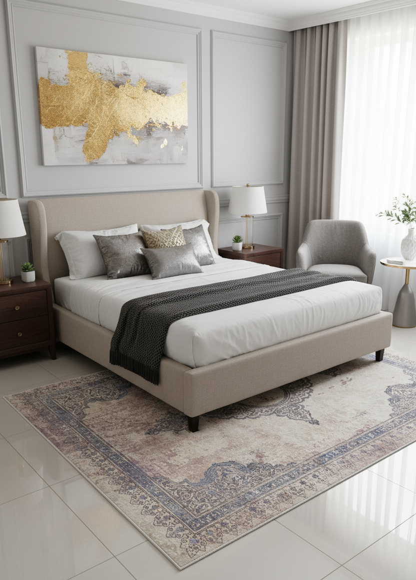 Modern klasik deseniyle bu halı, açık krem zemin üzerinde soluk mavi/mor motiflerin zarif geçişlerini sunar. Yıkanabilir ve eskitme (vintage/distressed) görünümü sayesinde oturma odası veya yatak odasında anında sofistike bir atmosfer yaratır. Şık, pratik ve zamansız bir zemin vurgusu arayanlar için mükemmel.
