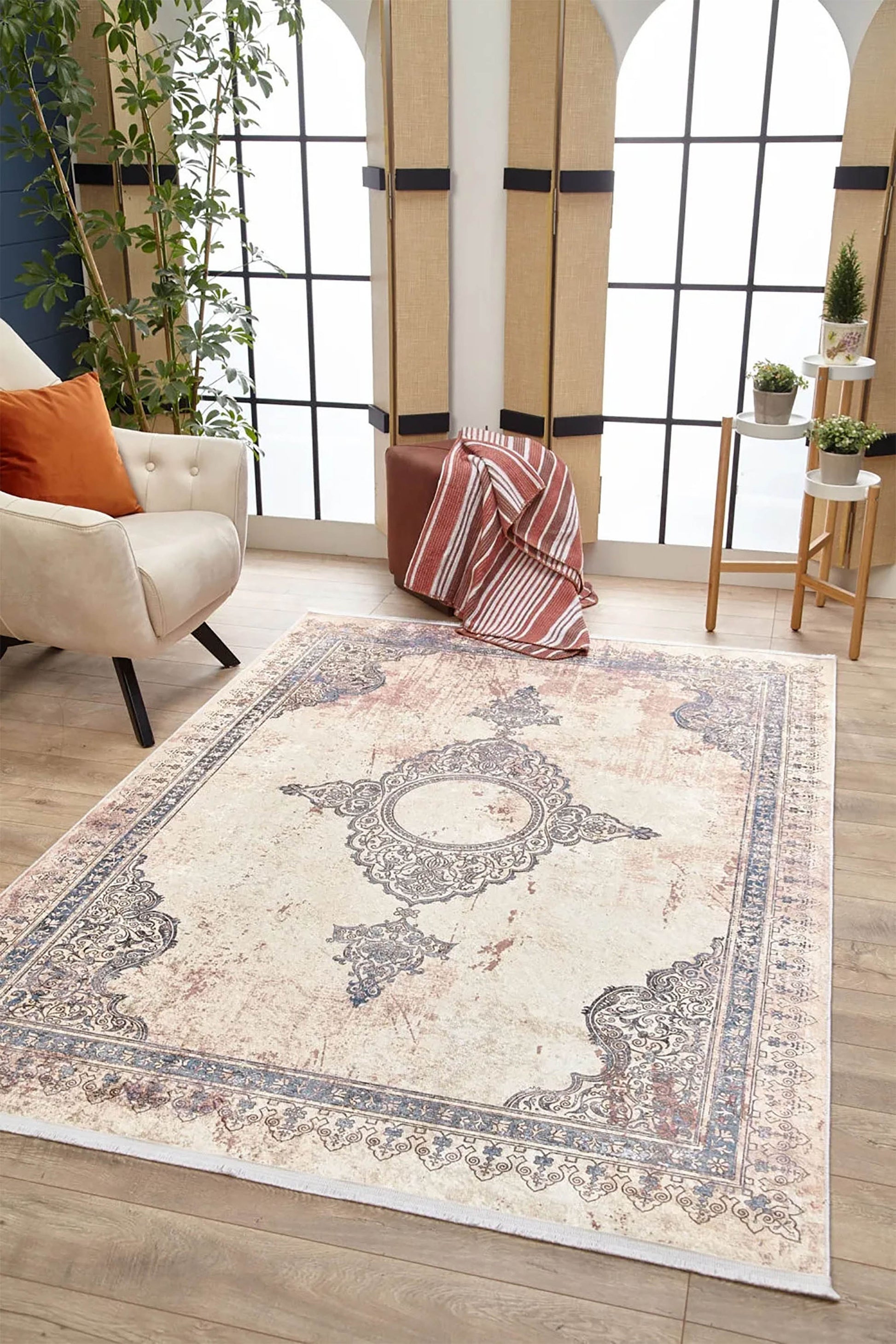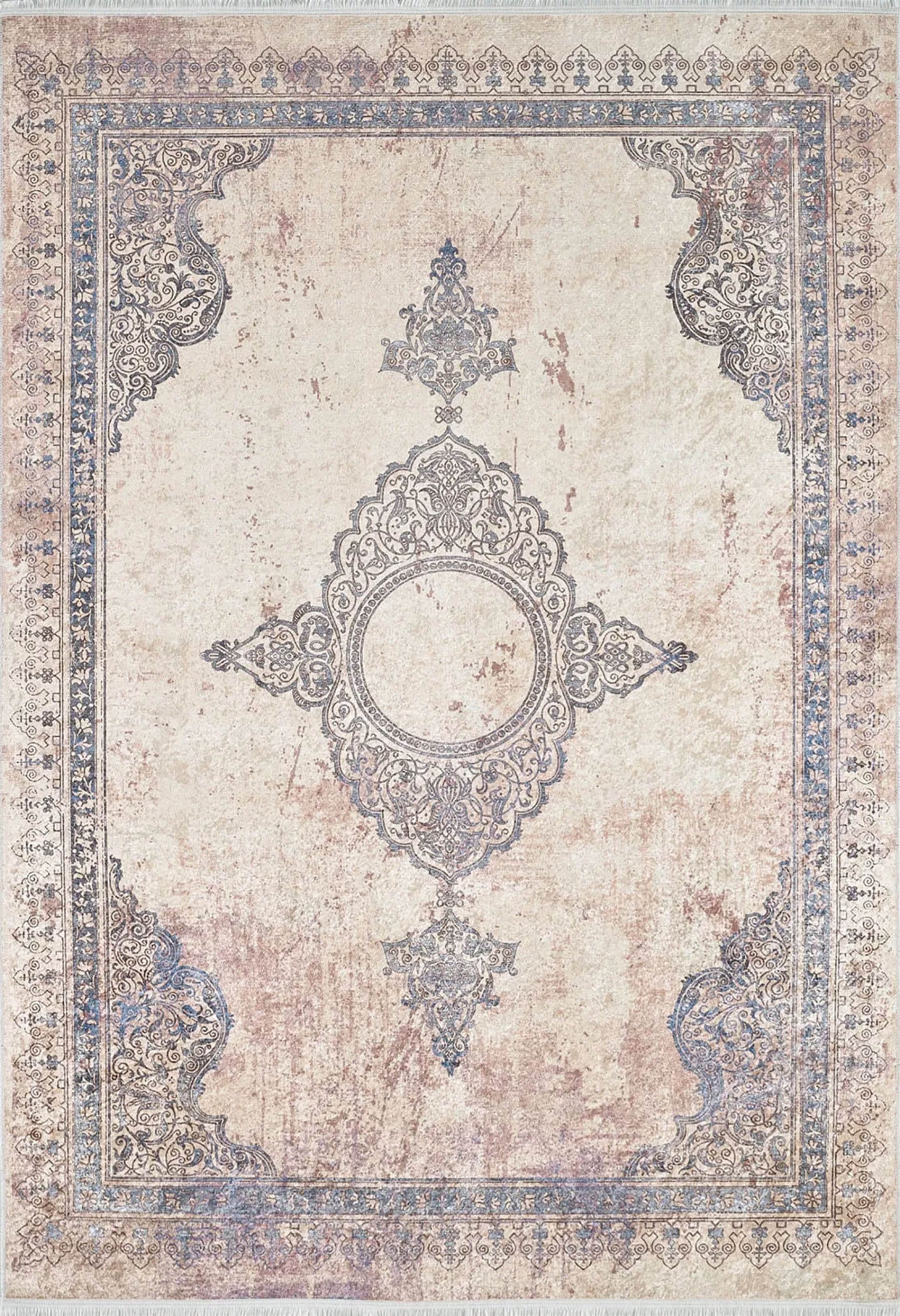 Krem, Mavi ve Bej Vintage Klasik Eskitme Efektli Yıkanabilir Halı