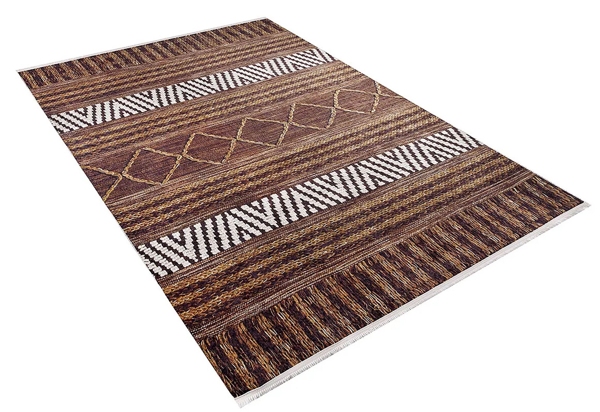 Doğal tonlarda, el dokuması hissi veren rustik bir dokunuşla evinizi ısıtın. Kahverengi ve bej ağırlıklı, hardal sarısı detaylara sahip doğal renk paleti ile otantik ve sıcak bir görünüm sunar. Yatay şeritler ve geometrik (zigzag, baklava dilimi) desenler, halıya bohem ve rustik bir hava katar. Salon, oturma odası ve yatak odasında İskandinav, bohem veya rustik tarzı tamamlar.