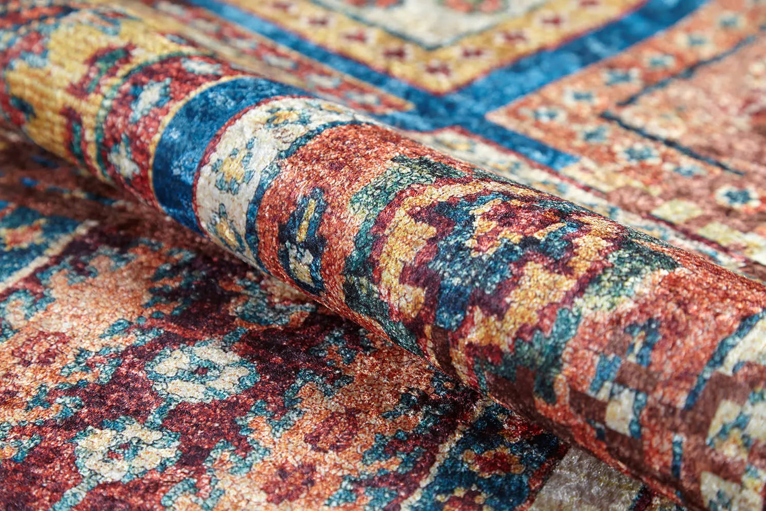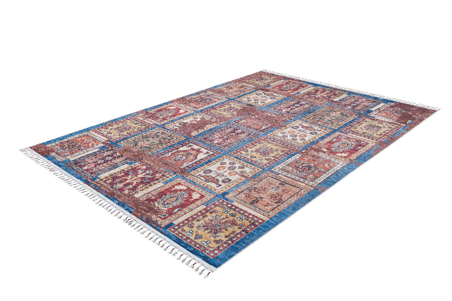 Modern ev dekorasyonuna uyum sağlayan, pratik kullanımlı ve şık halılarımızla tanışın! Bu dijital baskılı, örgülü saçaklara sahip yıkanabilir halı; kırmızı, mavi, sarı ve toprak tonlarının ağır bastığı geleneksel motifli kare blok deseni ve çarpıcı eskitme (vintage/distressed) efektiyle otantik ve modern bir görünüm sunar. Kolay temizlenebilir yapısıyla çocuklu ve evcil hayvanlı evler için idealdir. Evinizin havasını anında değiştirin!
