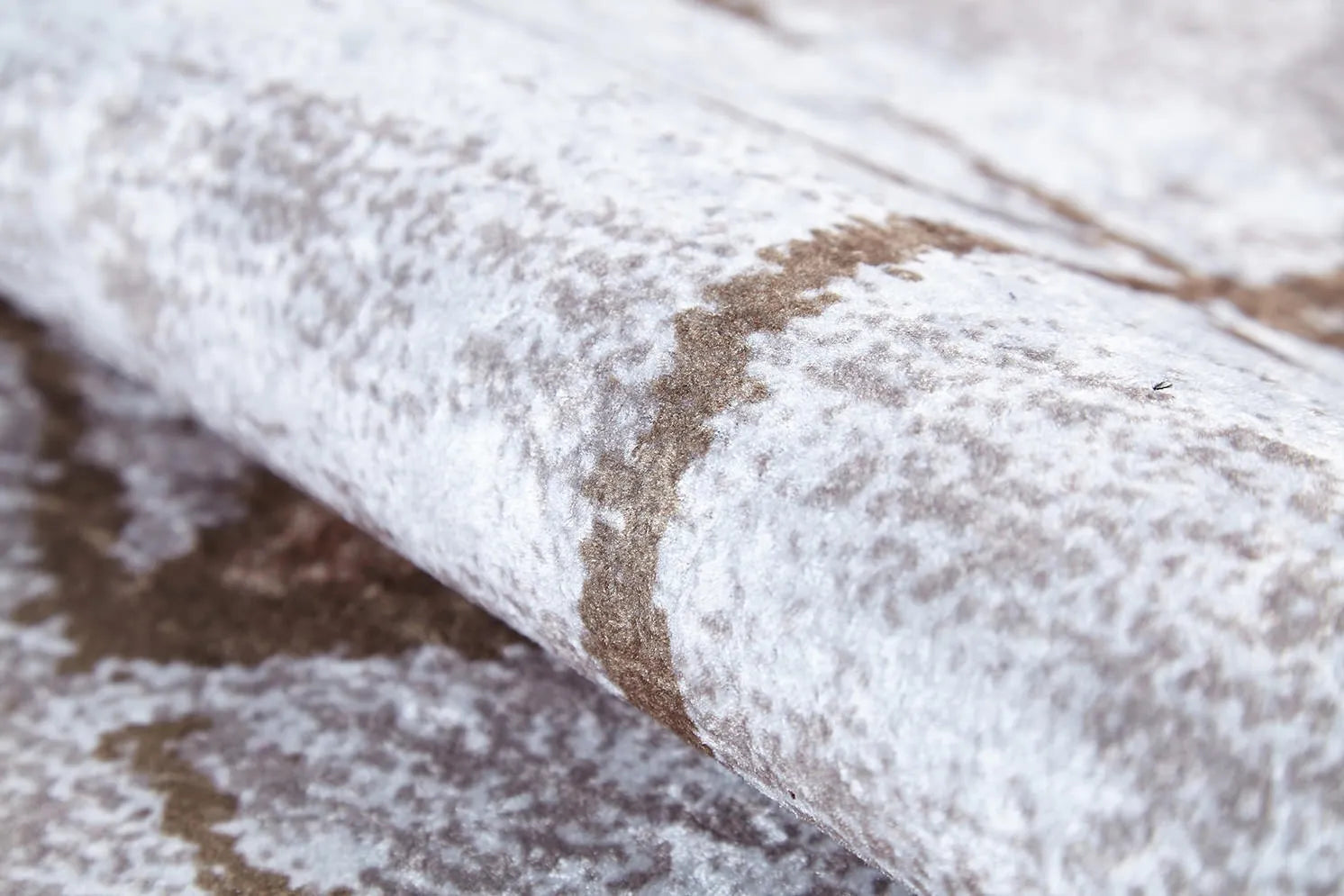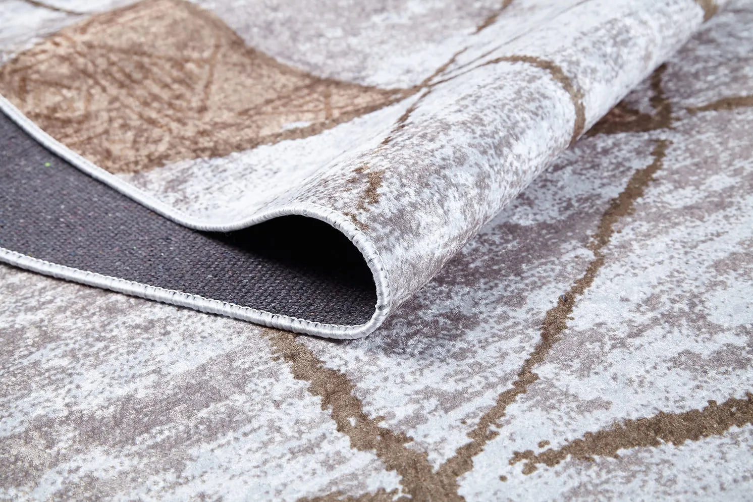 Halı, bej ve kahverengi tonlardaki ferah bir zemin üzerine inşa edilmiştir. Koyu füme (antrasit) rengindeki keskin ve fırça darbesi görünümlü çizgiler, dinamik bir üçgen (geometrik) desen oluşturur. Bazı üçgenlerin içinde yer alan daha soluk tondaki geleneksel (etnik) motifler, tasarıma derinlik ve otantik bir dokunuş katar.