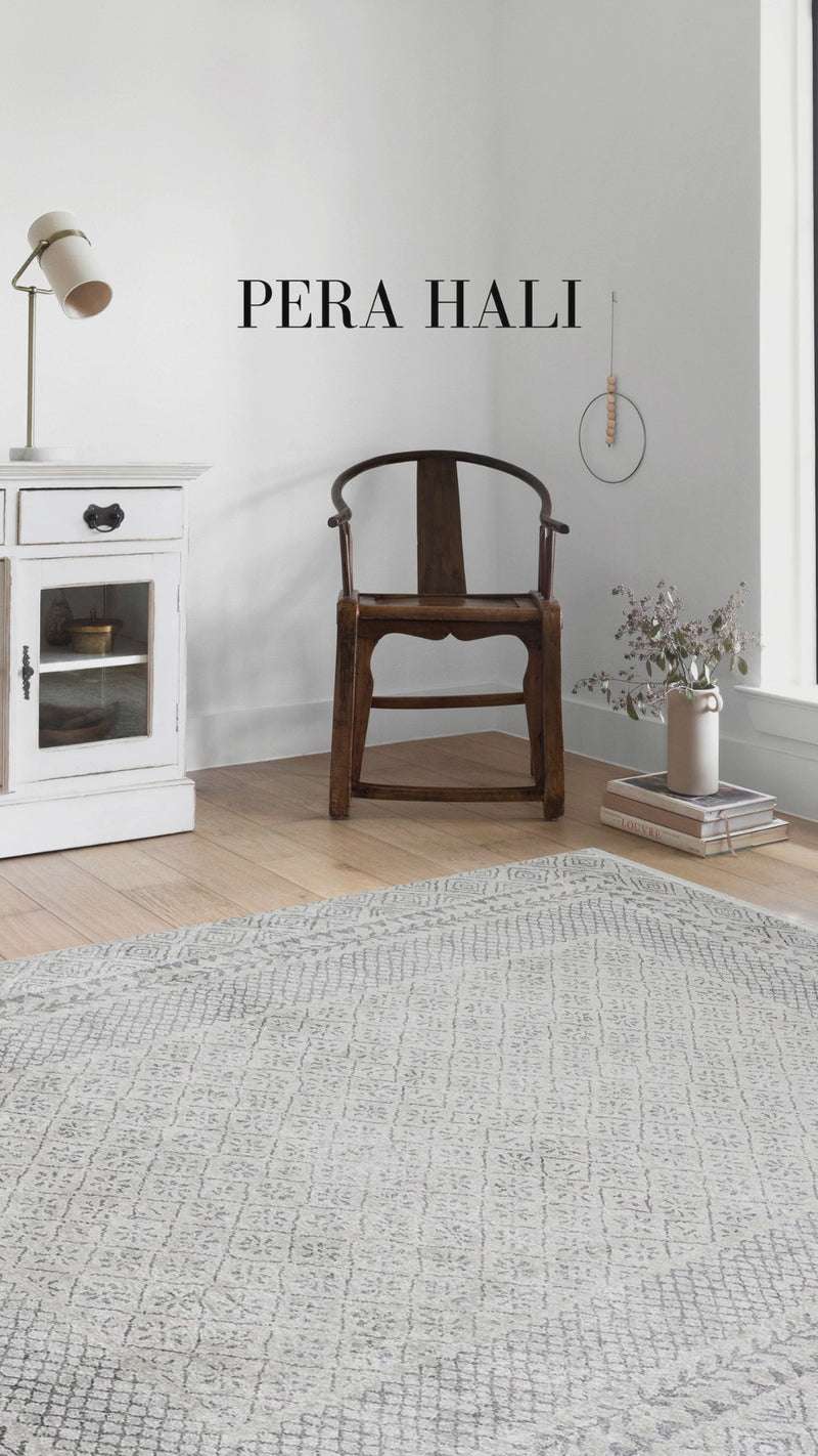 Modern ve eskitme tarzını bir araya getiren bu halı, açık gri beyaz zemin üzerine koyu gri tonlarında geometrik desenlerle şıklık sunar. El dokuma efektine sahip özel baskı tekniğiyle üretilen bu halı, yumuşak dokusuyla her mekâna zarif bir hava katar.