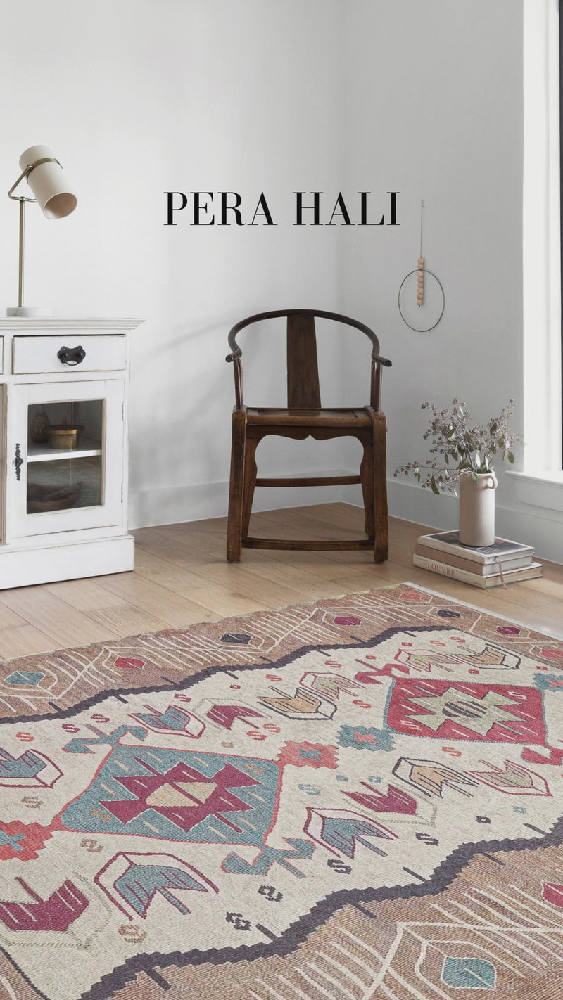 Açık turuncu ve bej tonlarında eskitme kilim halı, geometrik çizgilerle süslenmiş vintage bohem stilinden ilham alınarak tasarlanmıştır. Geleneksel dokusu ve yumuşak yüzeyi ile her alan için mükemmel bir seçimdir. Yüksek trafik alanlarına uygundur ve kapı altlarına sığacak şekilde ince bir yapıya sahiptir.