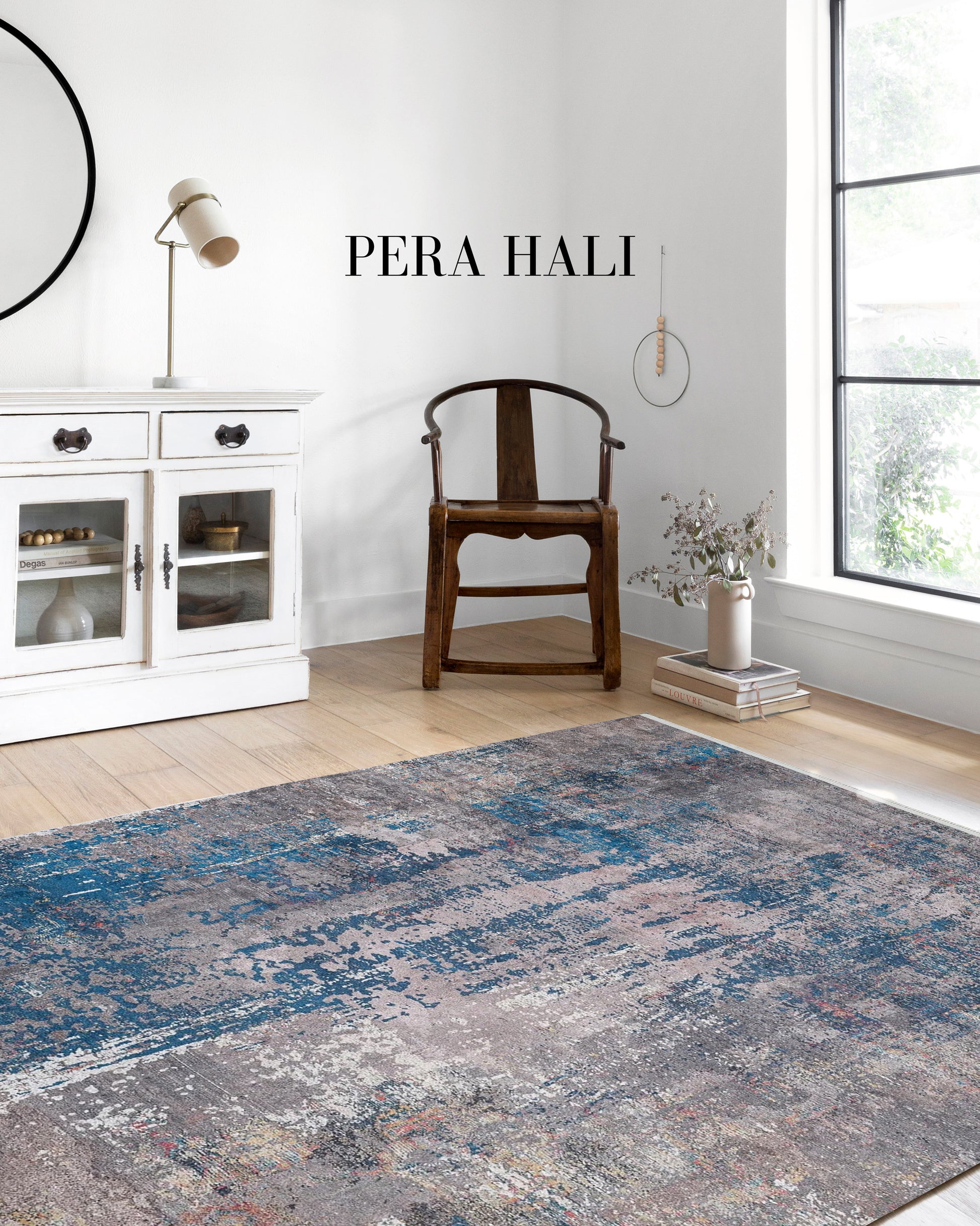 Gri, mavi ve kahve tonlarının rastgele dağıldığı, soyut ve sanatsal bir tasarıma sahiptir. Bu modern halı, bir tabloyu andıran dinamik dokusuyla mekana karakter ve derinlik katar. Sanatsal bir atmosfer yaratmak için idealdir. Yumuşak yüzeyi ve kaymaz tabanı sayesinde salon, ofis veya yatak odası gibi modern alanlar için konforlu ve güvenli bir zemin sunar.