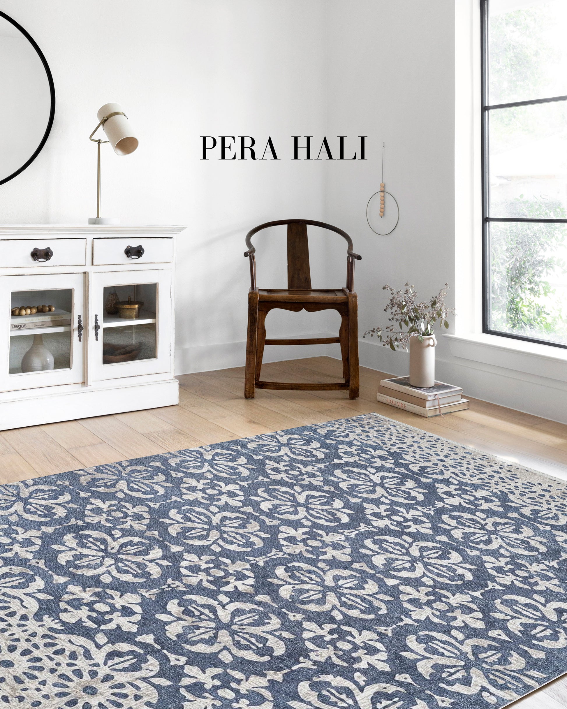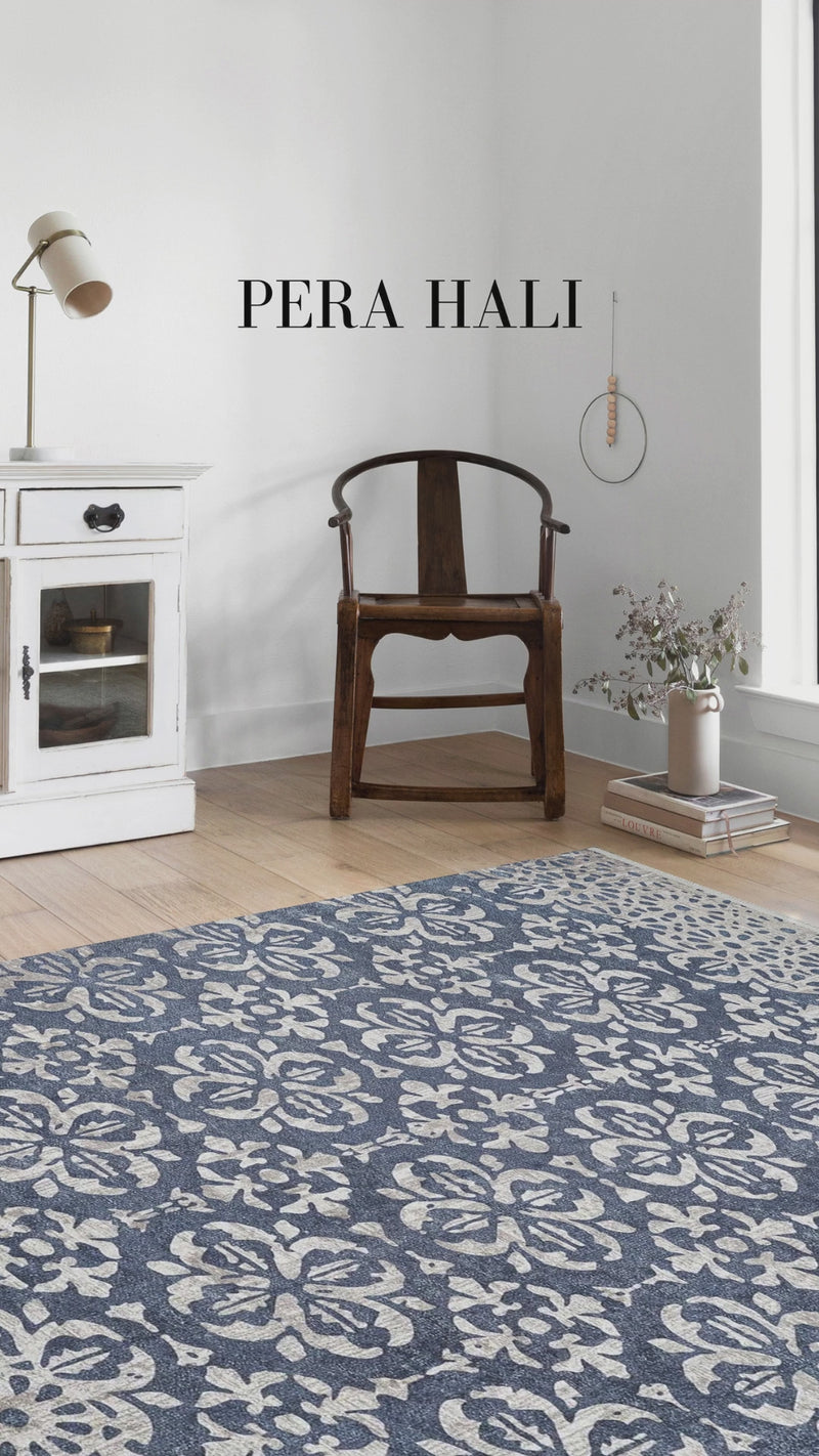 Koyu mavi zemin üzerinde otantik çini veya geleneksel karoları anımsatan zarif beyaz motiflere sahiptir. Bu tasarım, mekana derinlik ve Akdeniz esintili bir hava katar. Üst ve alt kısımdaki degrade geçişli bordür detayı halının karakterini güçlendirir. Yumuşak yüzeyi ve kaymaz tabanı sayesinde mutfak, antre veya oturma odası gibi tüm yaşam alanlarında güvenli ve estetik bir zemin sunar.