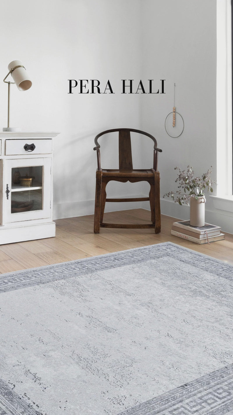 Mermer desenli gri halı, altın sarısı detaylarla tasarlanmış kenarlarıyla zamansız bir atmosfer sunar. Modern ve vintage tarzı bir araya getirerek yaşam alanlarınıza zarafet katar. Evinizin her alanında kullanılabilir.