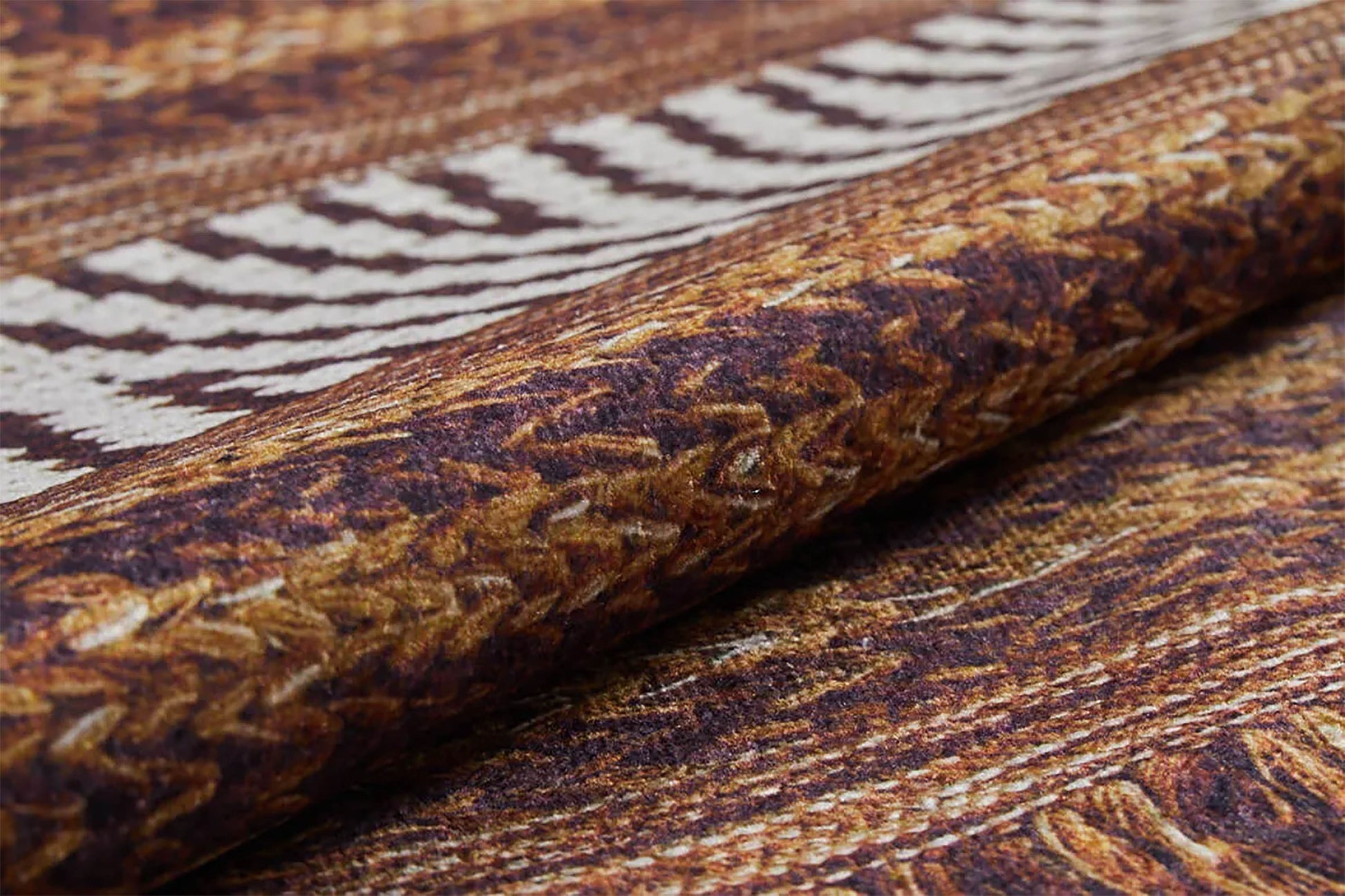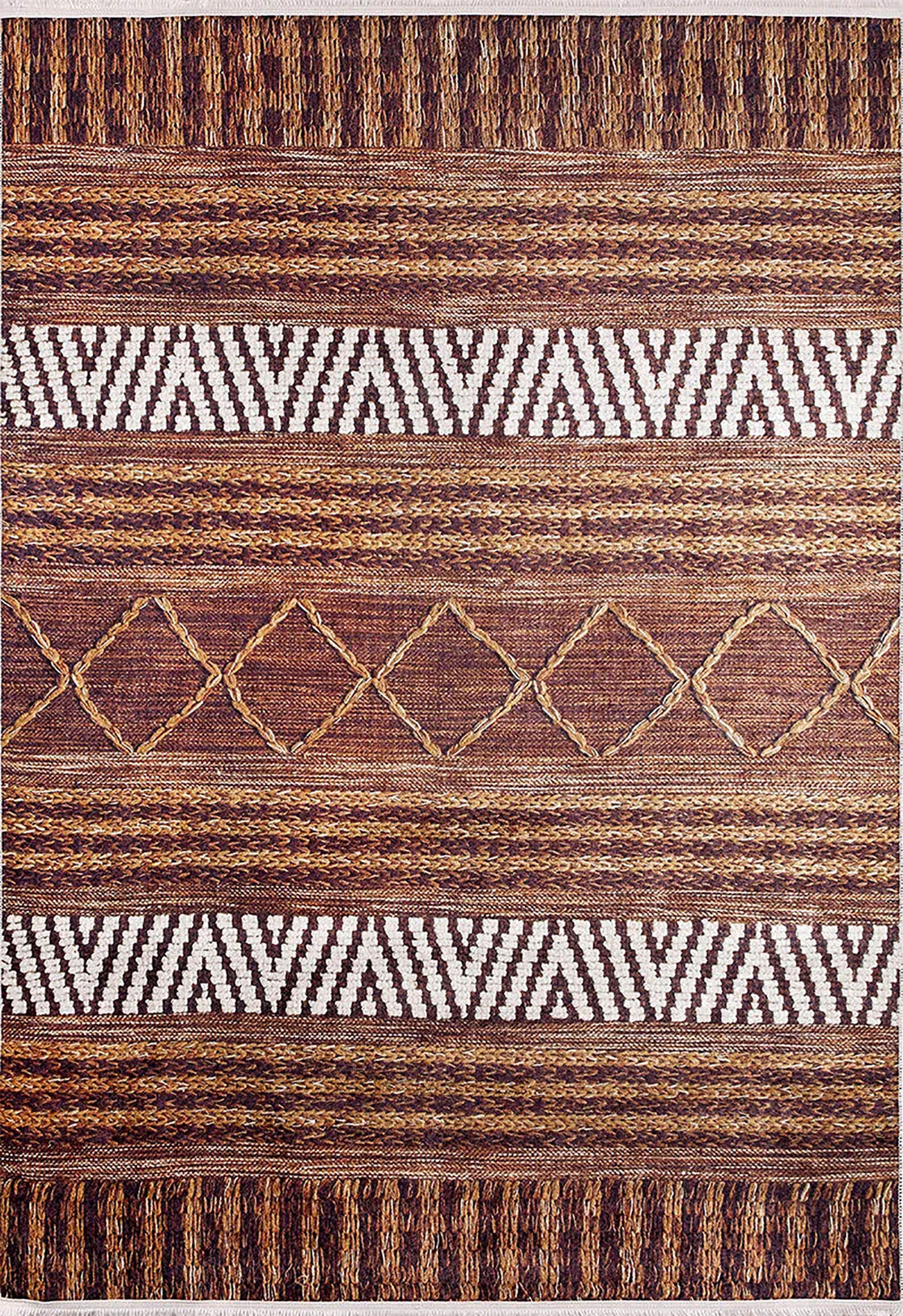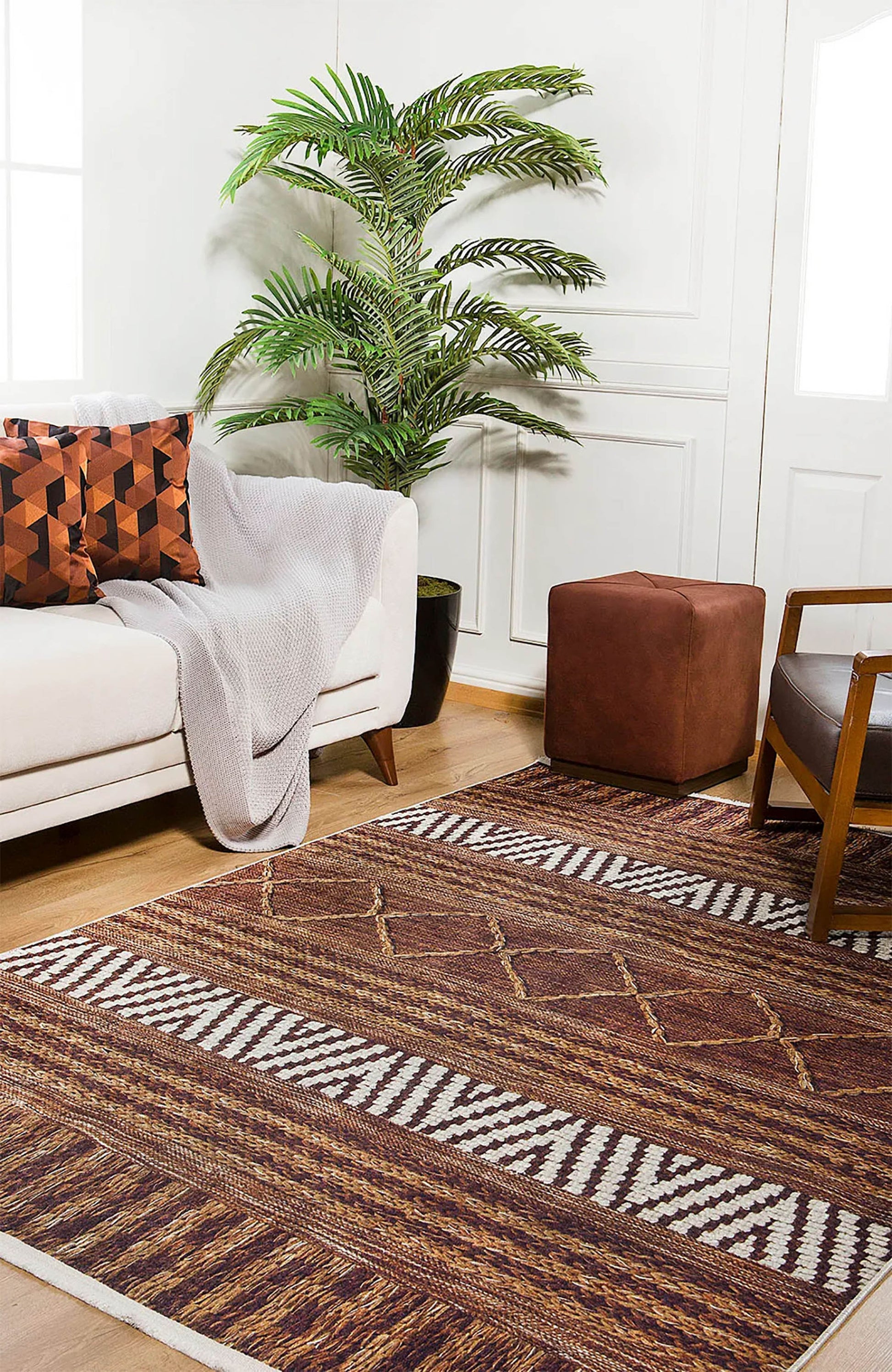 Doğal tonlarda, el dokuması hissi veren rustik bir dokunuşla evinizi ısıtın. Kahverengi ve bej ağırlıklı, hardal sarısı detaylara sahip doğal renk paleti ile otantik ve sıcak bir görünüm sunar. Yatay şeritler ve geometrik (zigzag, baklava dilimi) desenler, halıya bohem ve rustik bir hava katar. Salon, oturma odası ve yatak odasında İskandinav, bohem veya rustik tarzı tamamlar.