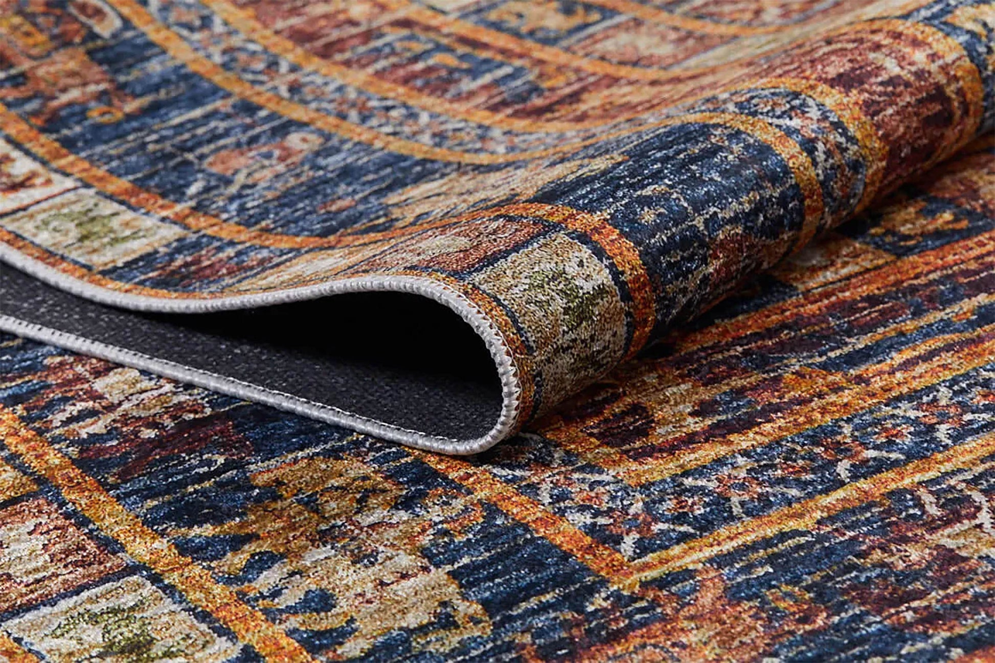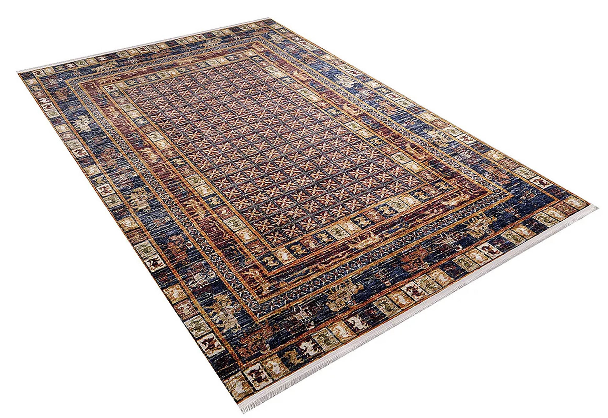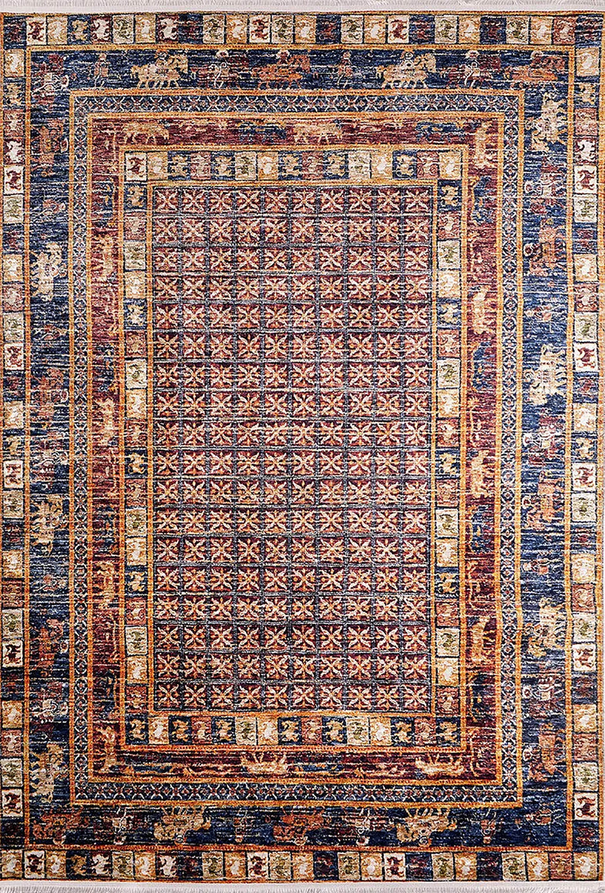 Geleneksel motiflerin zenginliğiyle evinize otantik ve derin bir atmosfer katın. Lacivert, bordo ve sarı tonlarını birleştiren, karmaşık ve detaylı geleneksel (etnik) desenlere sahiptir. Halının çevresinde ve bordürlerinde otantik figürler ve motifler yer almaktadır. Klasik, geleneksel, rustik veya eklektik tarzı dekorasyonlu mekanlar için güçlü bir odak noktası oluşturur.