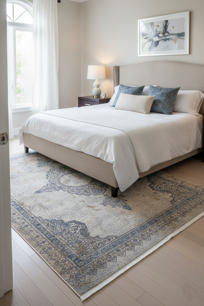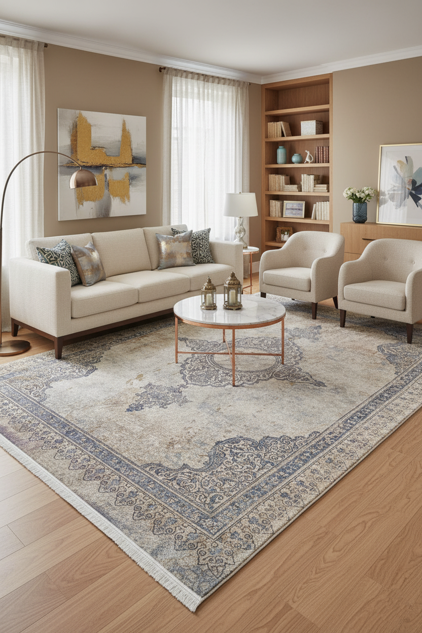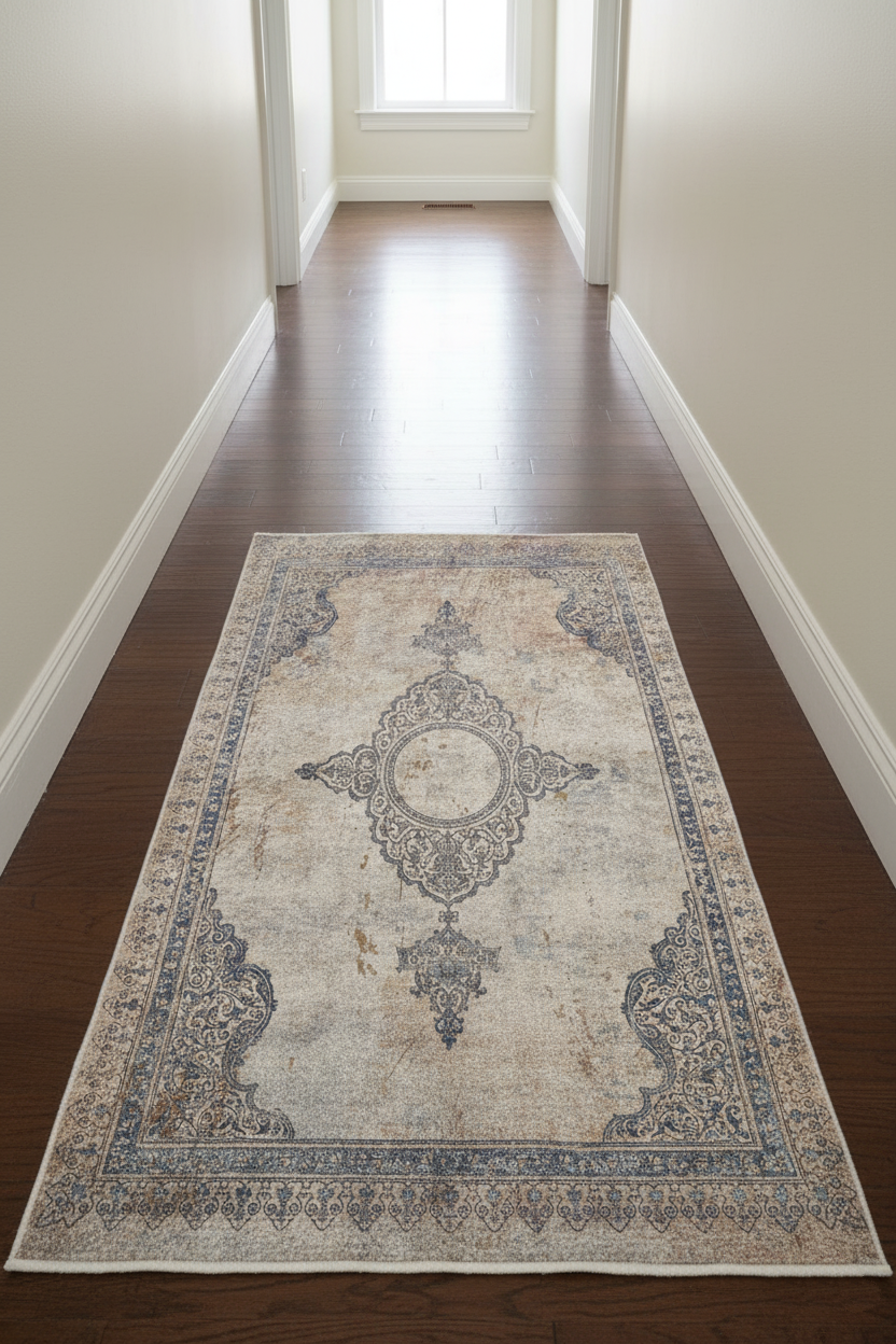 Eski dünyanın cazibesi ile modern pratikliği bir araya getiren bu halı, yaşam alanınıza anında derinlik ve karakter katacak. Klasik medalyon ve çerçeve detaylarının Vintage Eskitme görünümüyle buluştuğu bu halı, Bej, Krem ve Mavi'nin sakin tonlarıyla mekanınıza zarif bir atmosfer sunar.