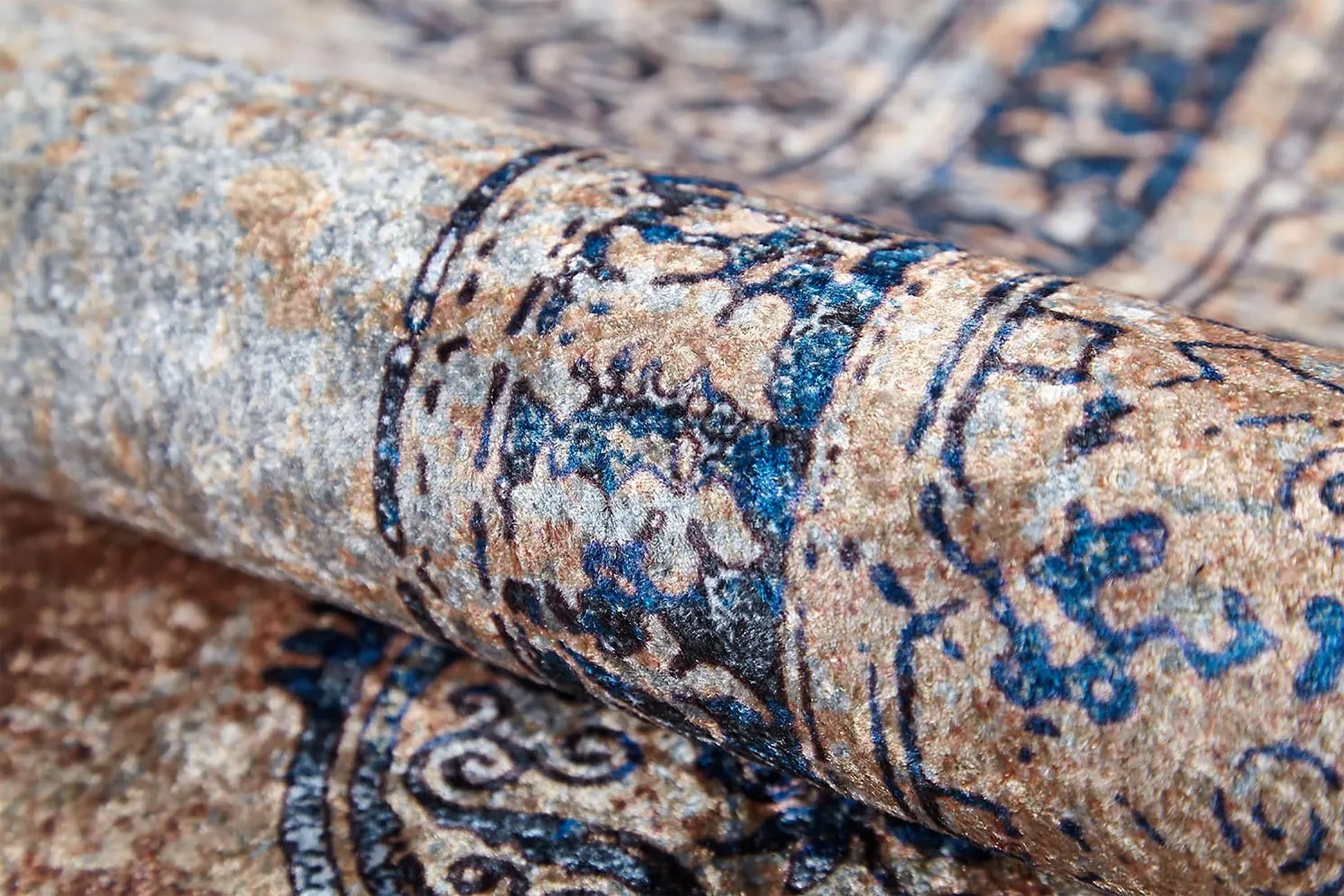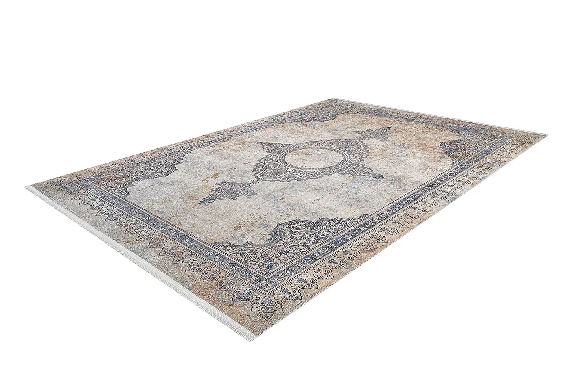 Mavi Bej Klasik Medalyon Vintage Eskitme Desenli Yıkanabilir Halı