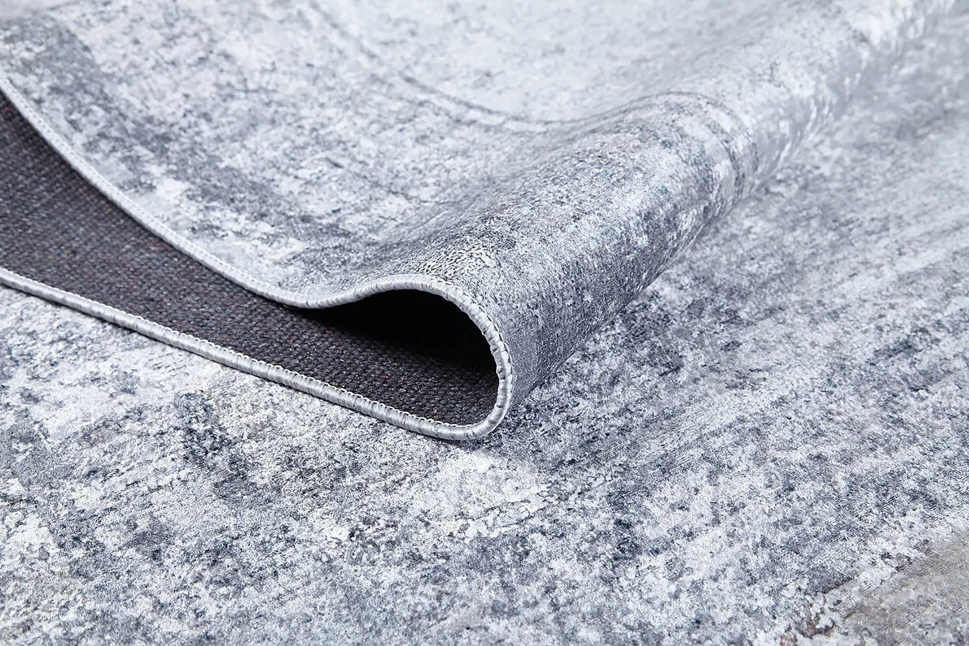 Beyaz ve açık gri tonlarında, soluk görünümlü, soyut çerçeve desenine sahip modern halı. Koyu gri ve hafif mavi/mor tonlarında dış bordür detayları içerir. Ferah ve aydınlık bir görünüm sunar. Kolay temizlenebilir ve makinede yıkanabilir pratik yapıya sahiptir.